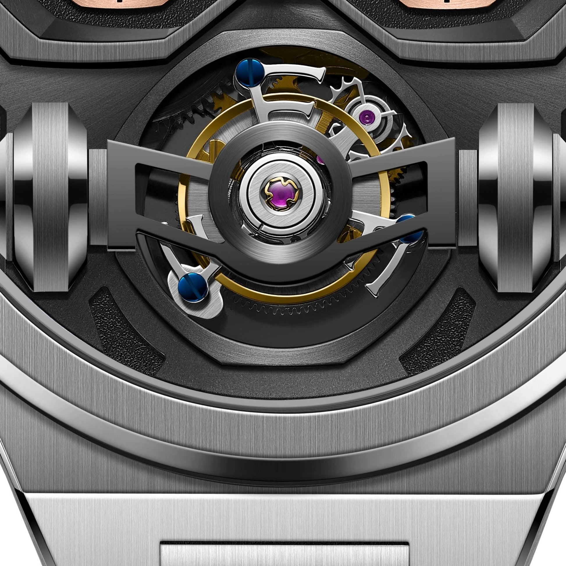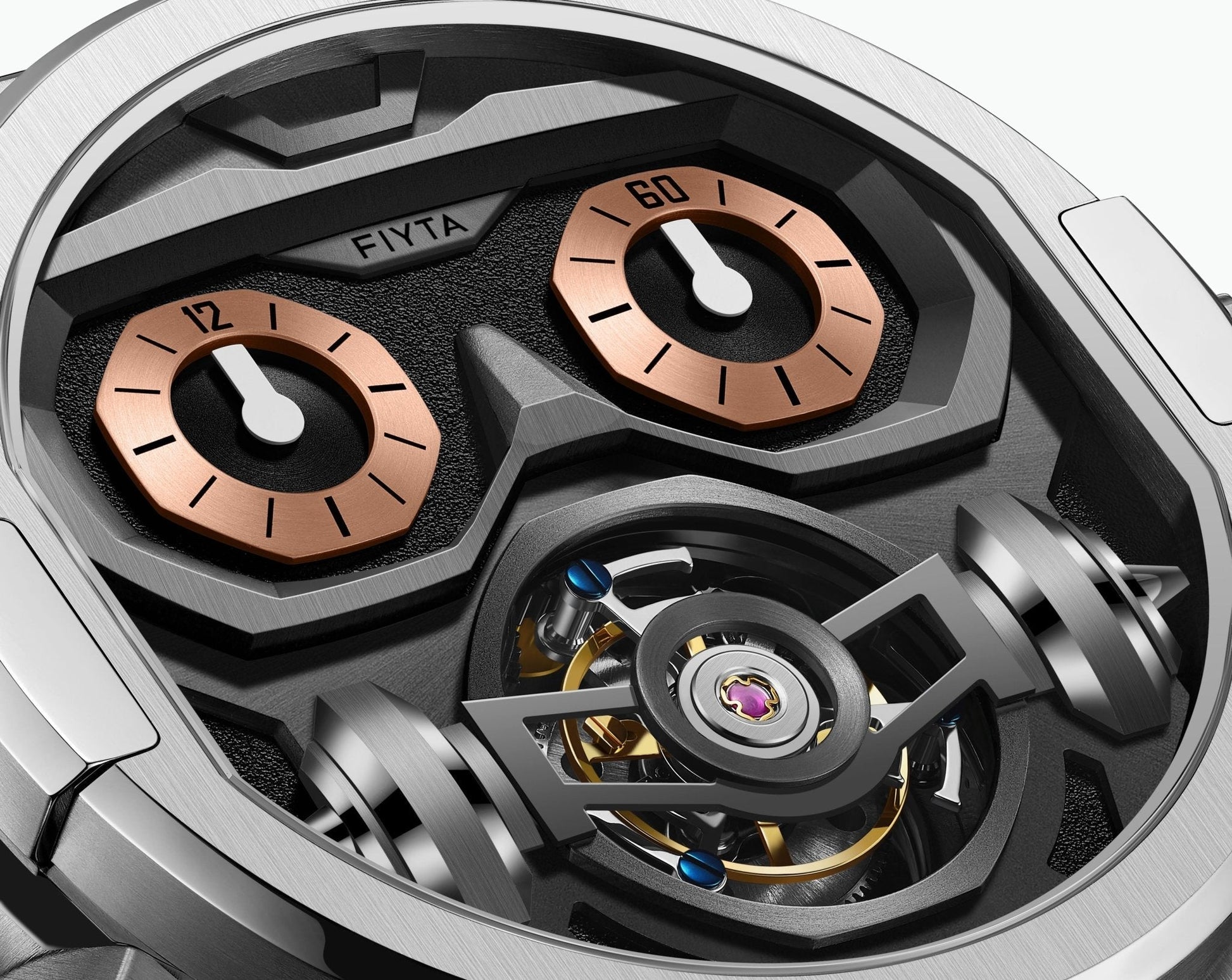 Mechanical, self-winding. Tourbillon. China Made. Caliber: FIYTA F192. Winding rotor resembles returning capsule from Shenzhou spaceship. Functions: Hour, minute (Hours in the eye at 10 o'clock. Minute in the eye at 2 o'clock.). Jewels: 25. Frequency: 28800 vph. Power reserve: Around 40 hours.
