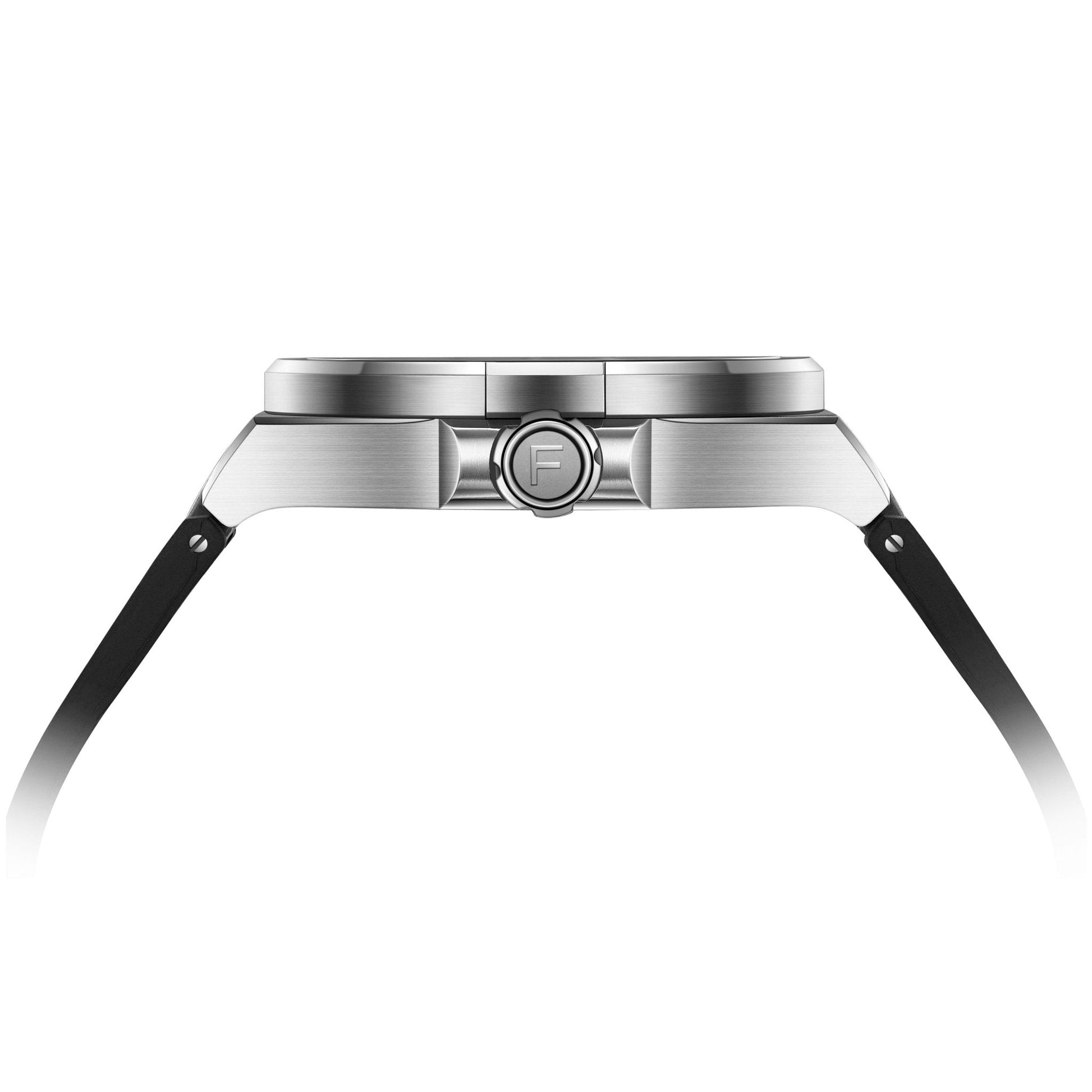 Grade 5 titanium alloy. Diameter: 44 mm. Thickness: 13.6 mm. Water resistance: 50 meters. Luminescence: No lume. Crystal: Sapphire crystal. Has anti-reflective coating. Case back: Screw-down notched. Transparent. Crown: Push-pull. Signed with the "F" logo.