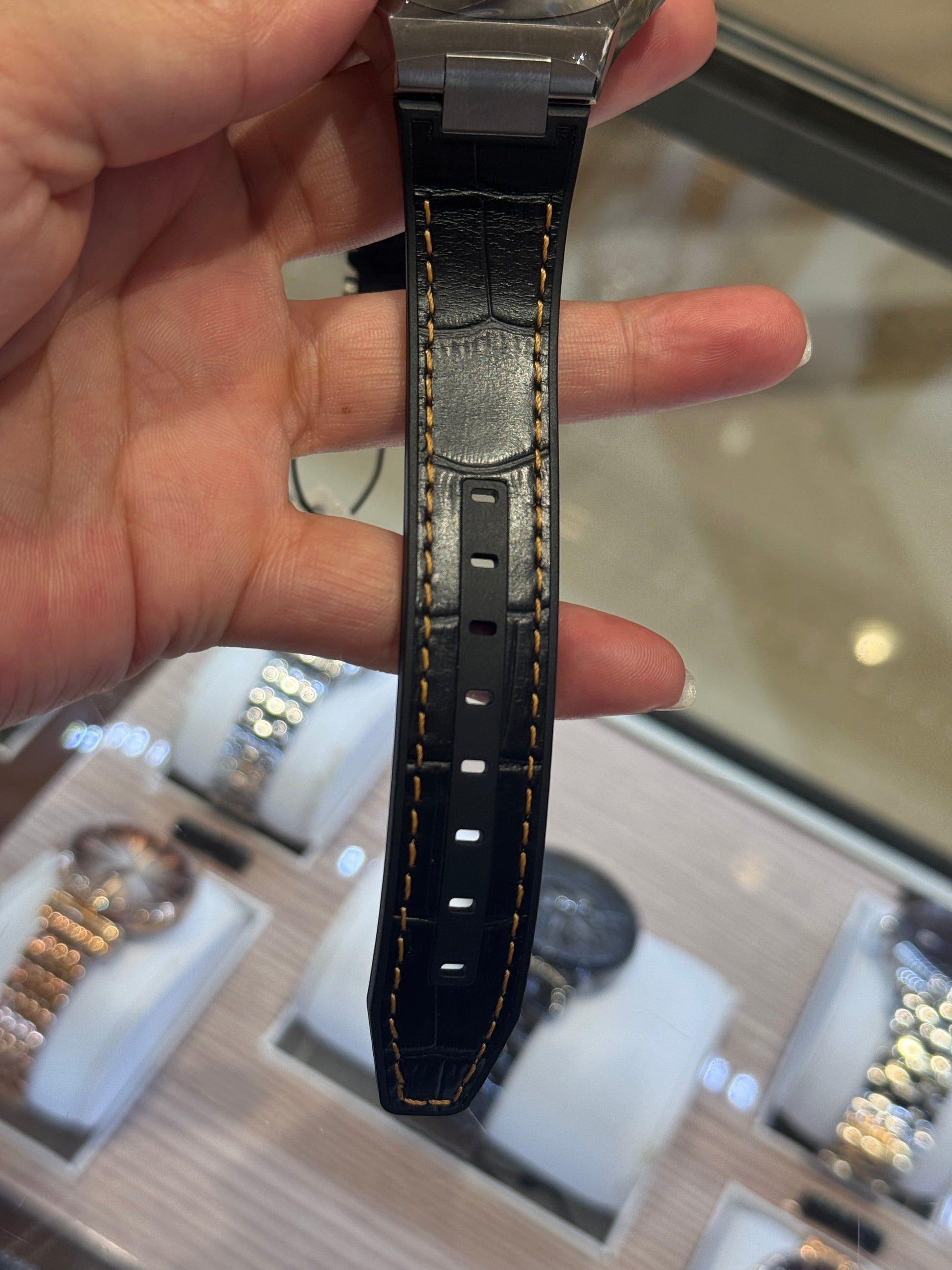 Black. Cowhide leather front, silicone rubber back. No quick release: Need tool to remove strap from case. Clasp: Pin buckle. Grade 5 titanium alloy clasp.