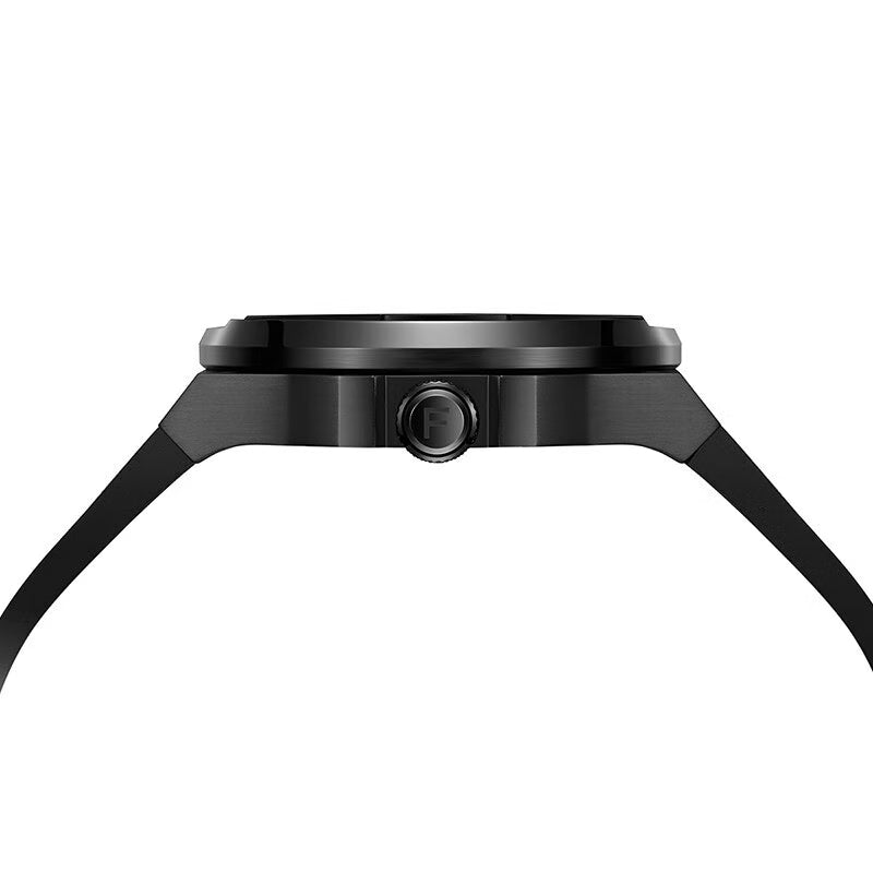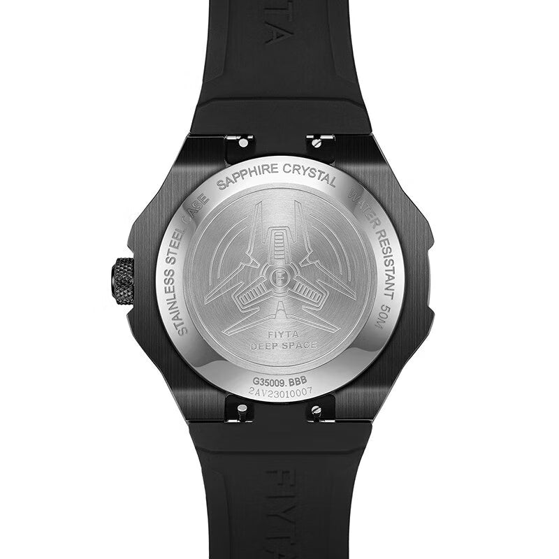 Stainless steel. Diameter: 44 mm. Thickness: 11.75 mm. Lug width: 20 mm. Water resistance: 50 meters. Luminescence: Lume on hour hand, minute hand and hour markers at 3, 9, 12 o'clock. Dial: Black. The rotatable three-pointed part (starship) at dial center follows motion of the watch. Crystal: Sapphire crystal. Case back: Not transparent. Stainless steel case back. Hands: Starship shaped hands. Aerospace grade aluminum alloy Crown: Push-pull. Signed with the "F" logo.