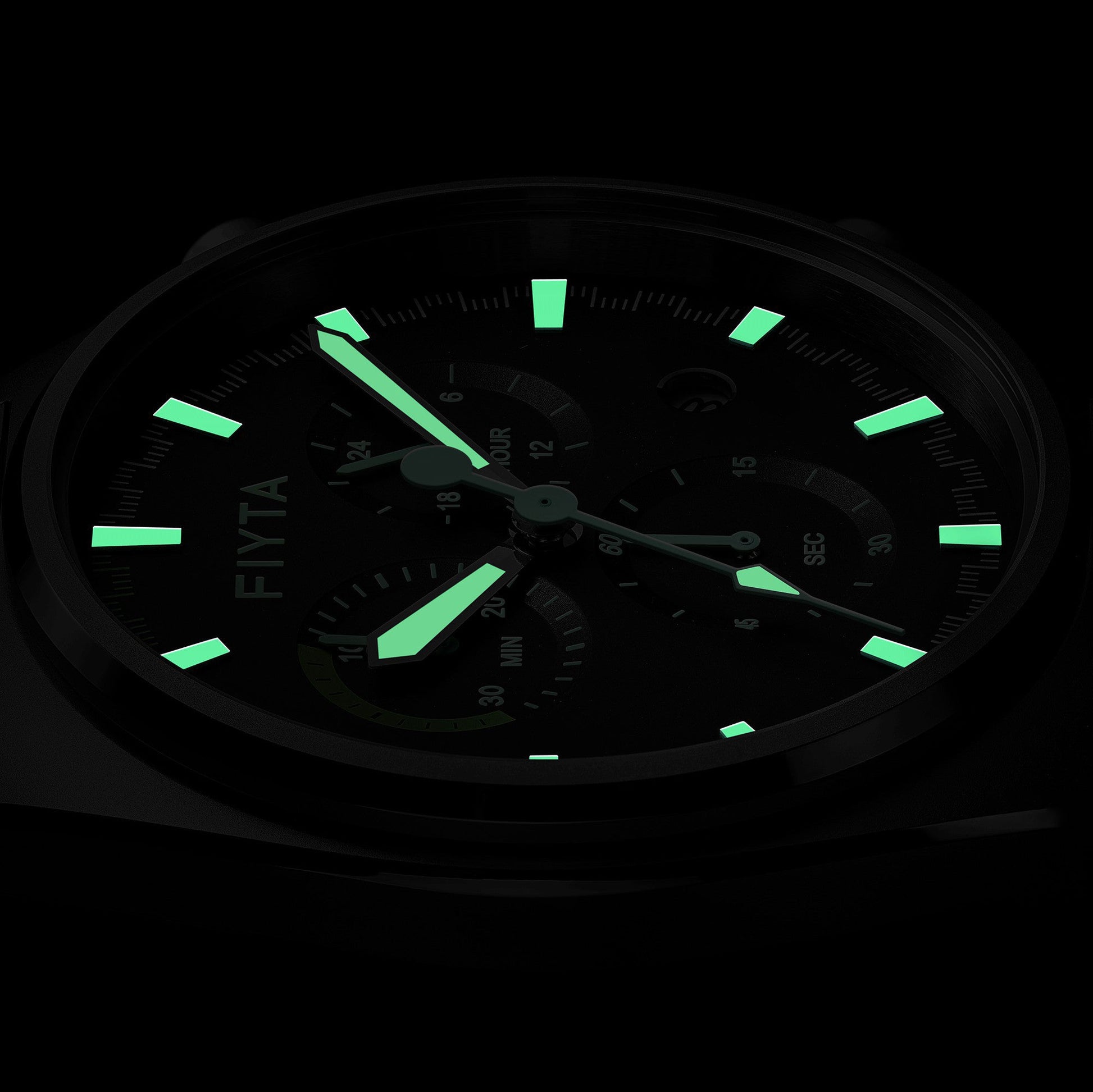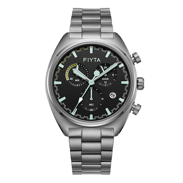 Stainless steel. Width exclude crown: 40.5 mm. Thickness: 10 mm. Lug width: 20 mm. Water resistance: 50 meters. Luminescence: Green lume on central hour, minute and seceonds hands, and hour markers. Dial: Black. Crystal: Sapphire crystal. Flat. Has anti-reflective coating. Case back: Snap-in. Not transparent. Grade 2 titanium alloy case back. Crown: Push-pull. Gear shape. Signed with the "F" logo.