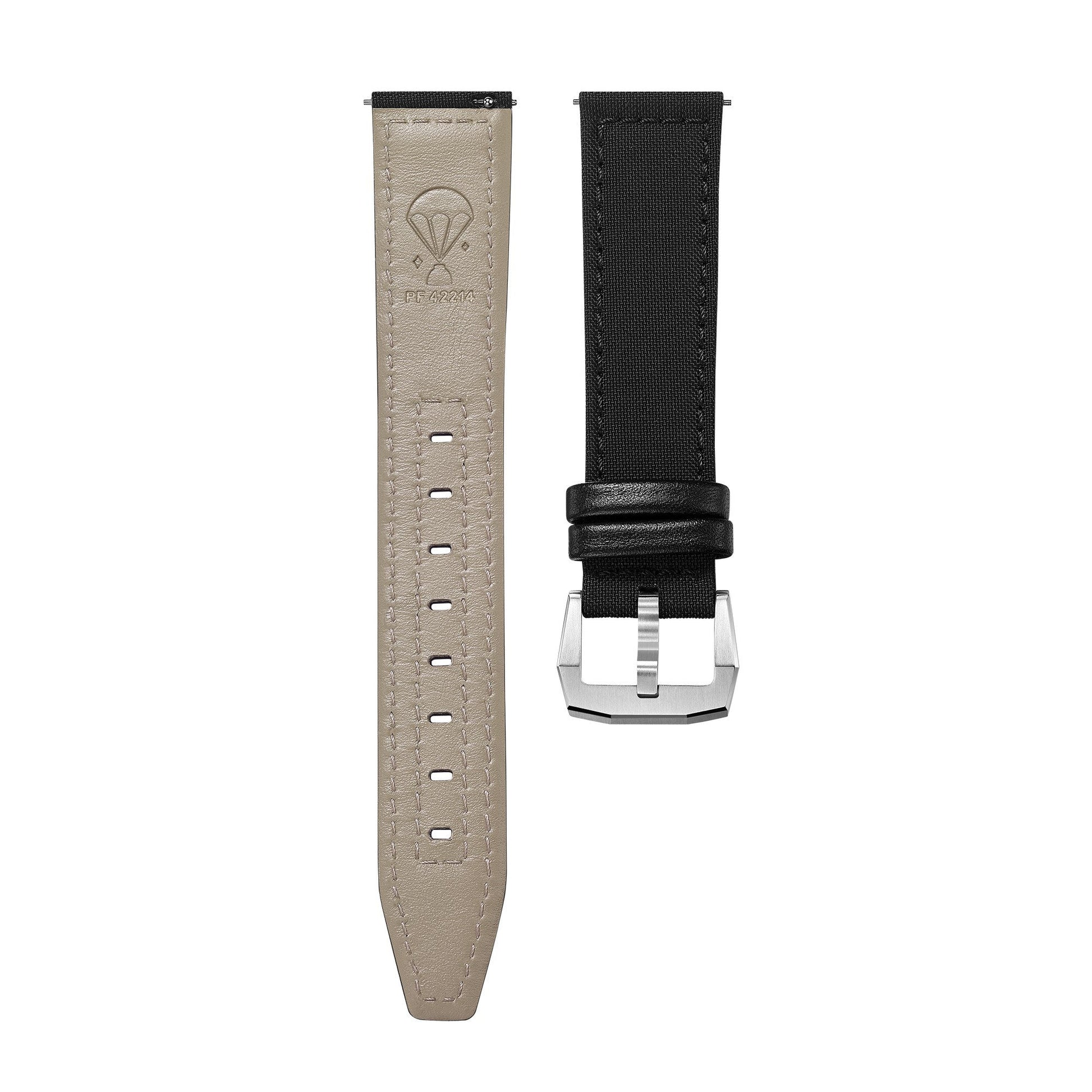 Gunmetal color. Stainless steel links. Quick release: Remove strap from case without tool. Fit for case lug width: 20 mm. Clasp: Fold-over clasp. Stainless steel clasp. (Additional strap: Black. Polyester fiber 42214 front, same material for spacecraft parachute, leather back. Quick release: Remove strap from case without tool. Clasp of additional strap: Pin buckle. Stainless steel material.)