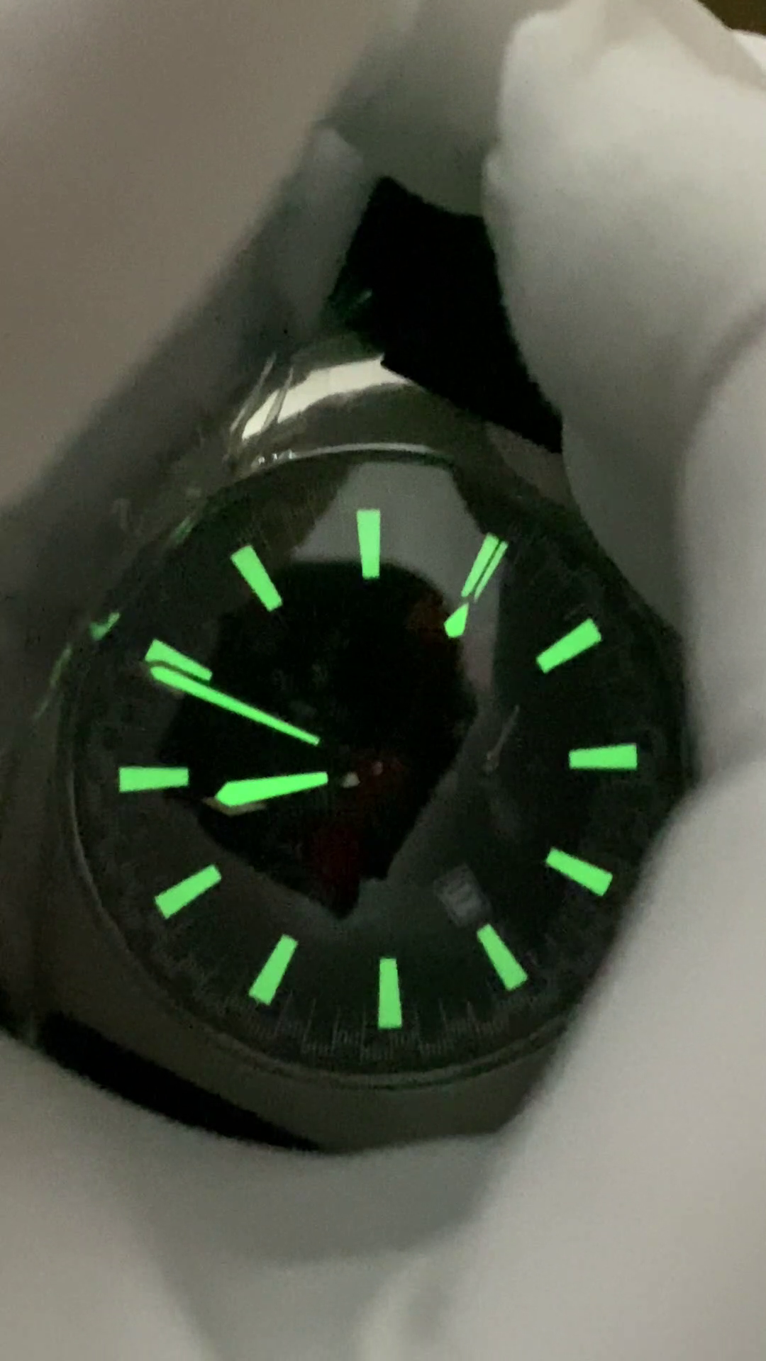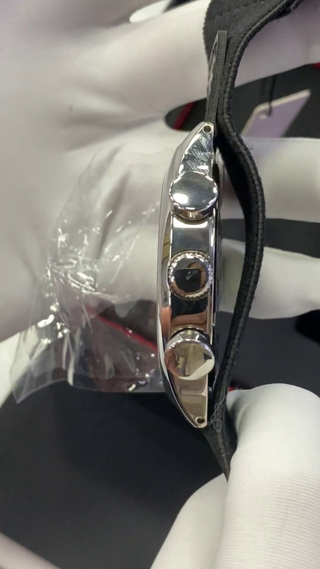 Stainless steel. Width exclude crown: 48 mm. Thickness: 10.3 mm. Lug width: 24 mm. Lug to lug: 55.7 mm. Water resistance: 50 meters. Weight: 121 grams (the whole watch including strap). Weight: 89 grams (the whole watch excluding strap). Luminescence: Green luminescence on central hour, minute and chronograph seconds hands, and on hour markers. Dial: Black. Crystal: Sapphire crystal. Flat. Case back: Screw-down notched. Not transparent. Stainless steel case back. Crown: Screw-down. Fluted cylinder shape. Stainless steel crown. Crown not signed. Crown diameter: 7.1 mm. Diamter of pushers: 8.2 mm.
