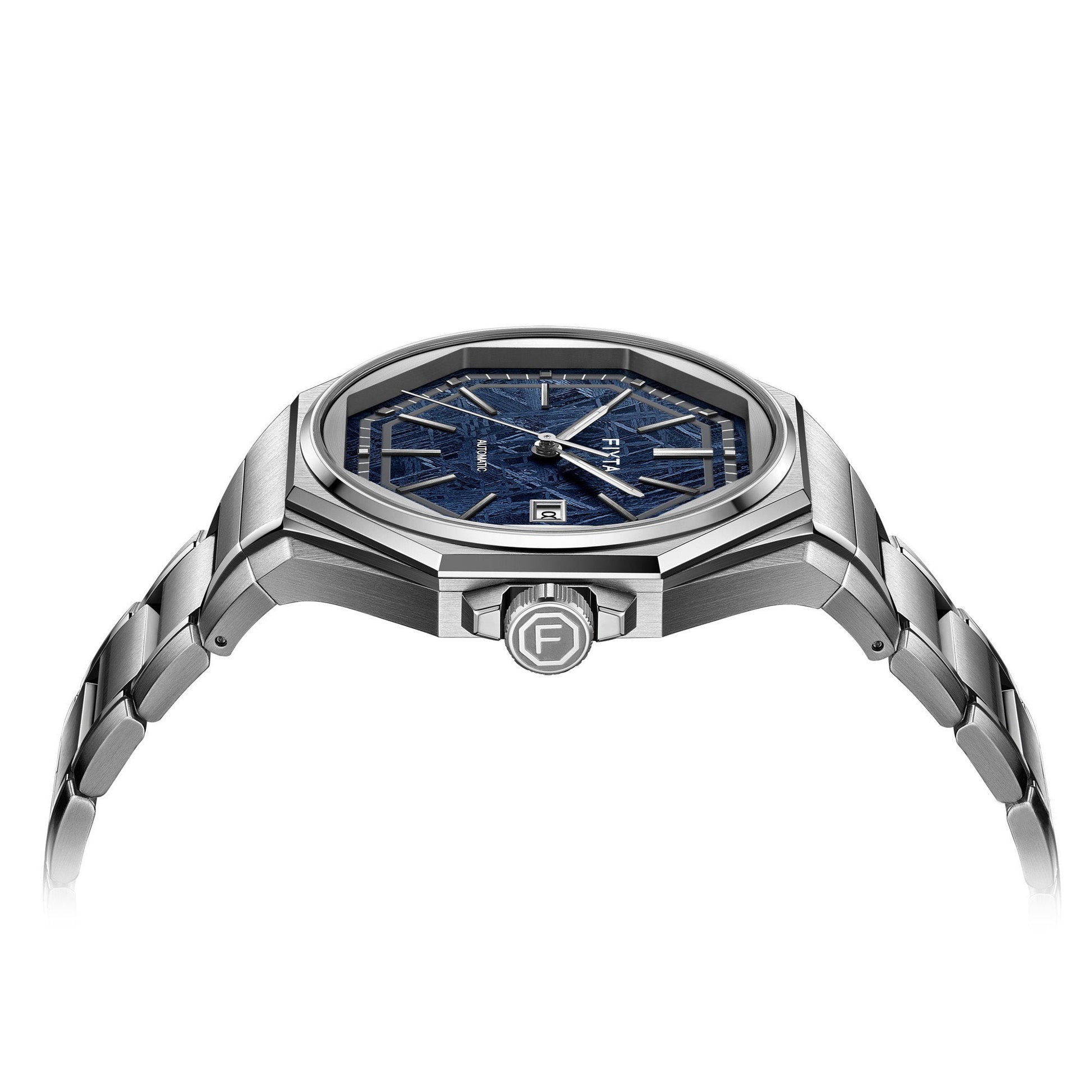 Stainless steel. Width exclude crown and crown guards: 42 mm. Thickness: 9.6 mm. Water resistance: 50 meters. Luminescence: Green luminescence on hour hand, minute hand and hour marker 12 o'clock. Dial: Blue. Meteorite. Applied hour markers. Crystal: Sapphire crystal. Has anti-reflective coating. Case back: Not transparent. Stainless steel case back. Crown: Push-pull. Grooved cylinder shape. Stainless steel crown. Signed with the "F" logo.