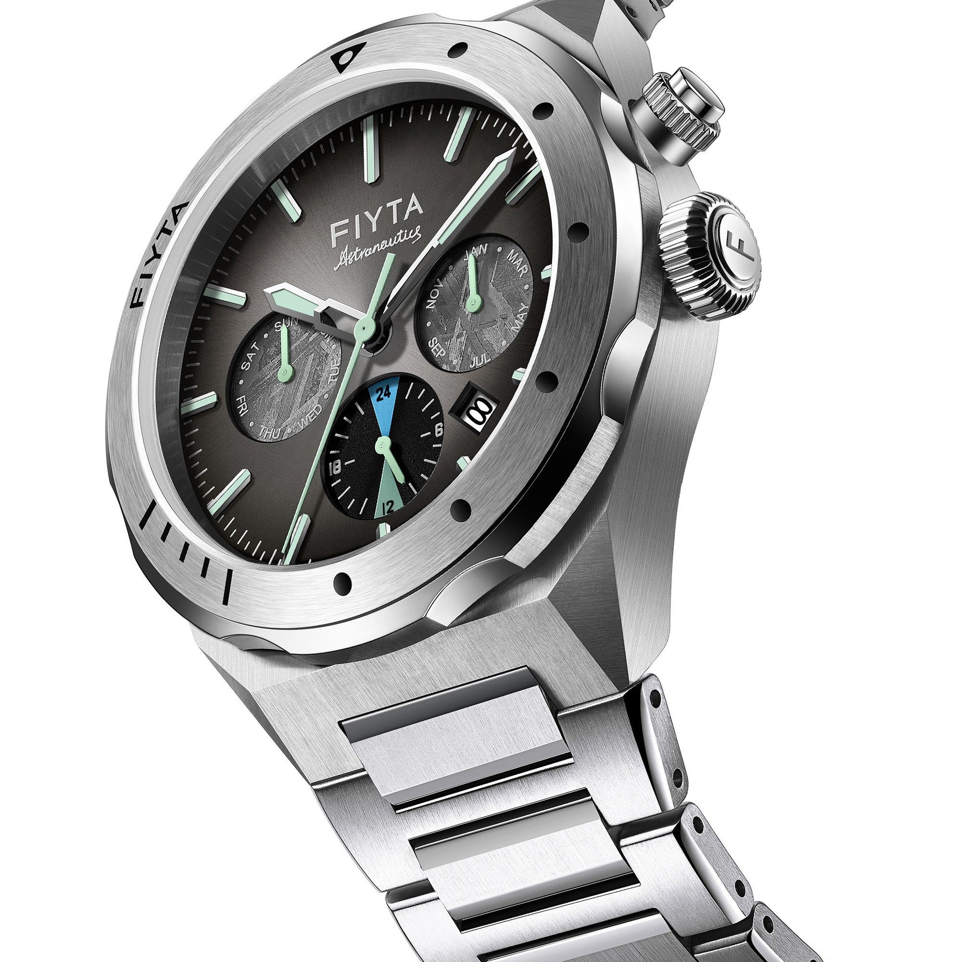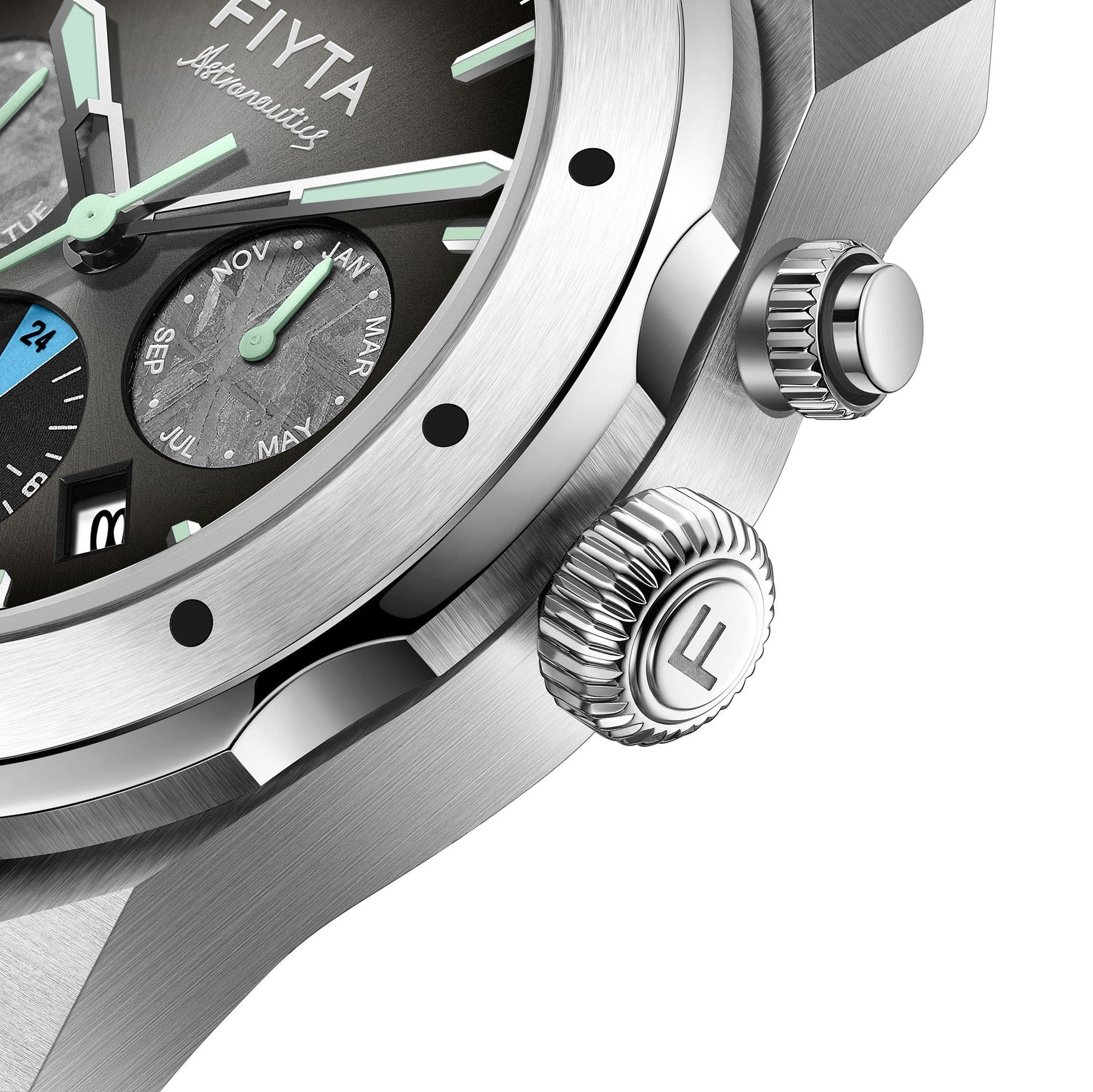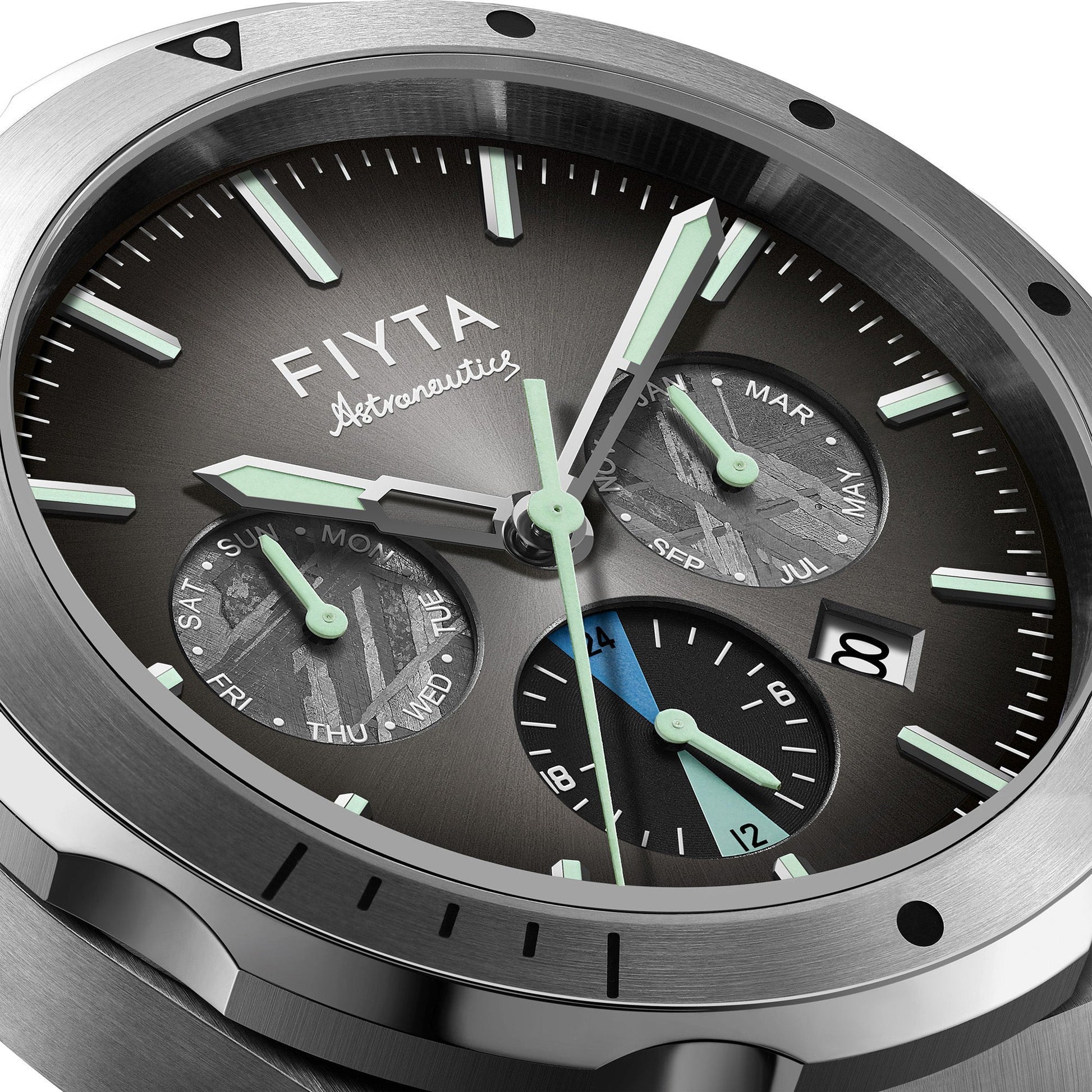 Stainless steel. Diameter: 42 mm. Thickness: 13 mm. Water resistance: 50 meters. Luminescence: Green luminescence on all hands, hour markers, and bottom sector on the 24-hour subdial. Blue luminescence on the top sector. Bezel: Silver color. Chronograph bezel. Anti-clockwise rotatable. The 7+1 hour scale on bezel is specially designed to indicate the limit time of stay outside cabin during spacewalk. Stainless steel bezel material. Dial: Grey-black. Sunburst fumé finish. Applied hour markers. Recessed subdials. Meteorite material for subdials at 3 and 9 o'clock. Iconic design of the blue and green sectors on subdial from FIYTA space watches. Crystal: Sapphire crystal. Flat. Has anti-reflective coating. Case back: Screw-down. Not transparent. Stainless steel case back. Crown: Fluted cylinder shape. Stainless steel crown. Signed with the "F" logo. Unscrew the button at 2 o'clock and push it to adjust the month.