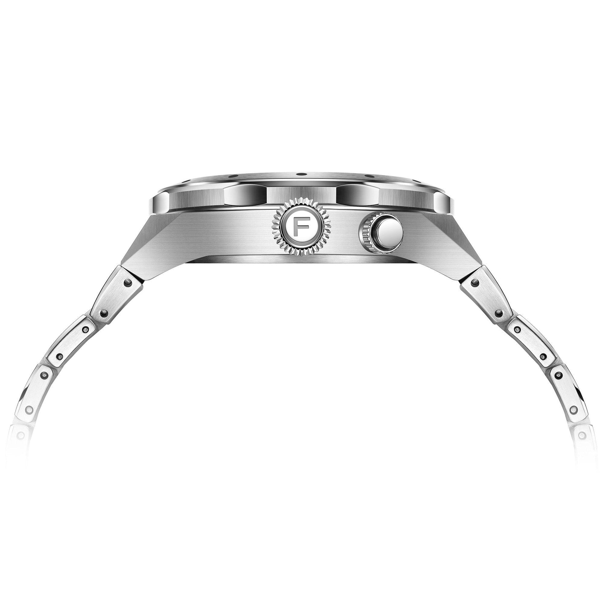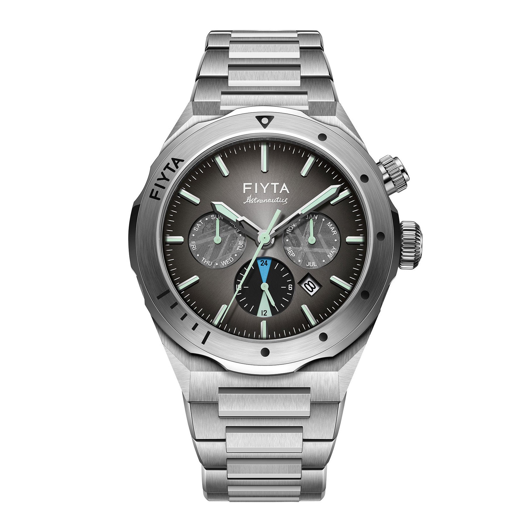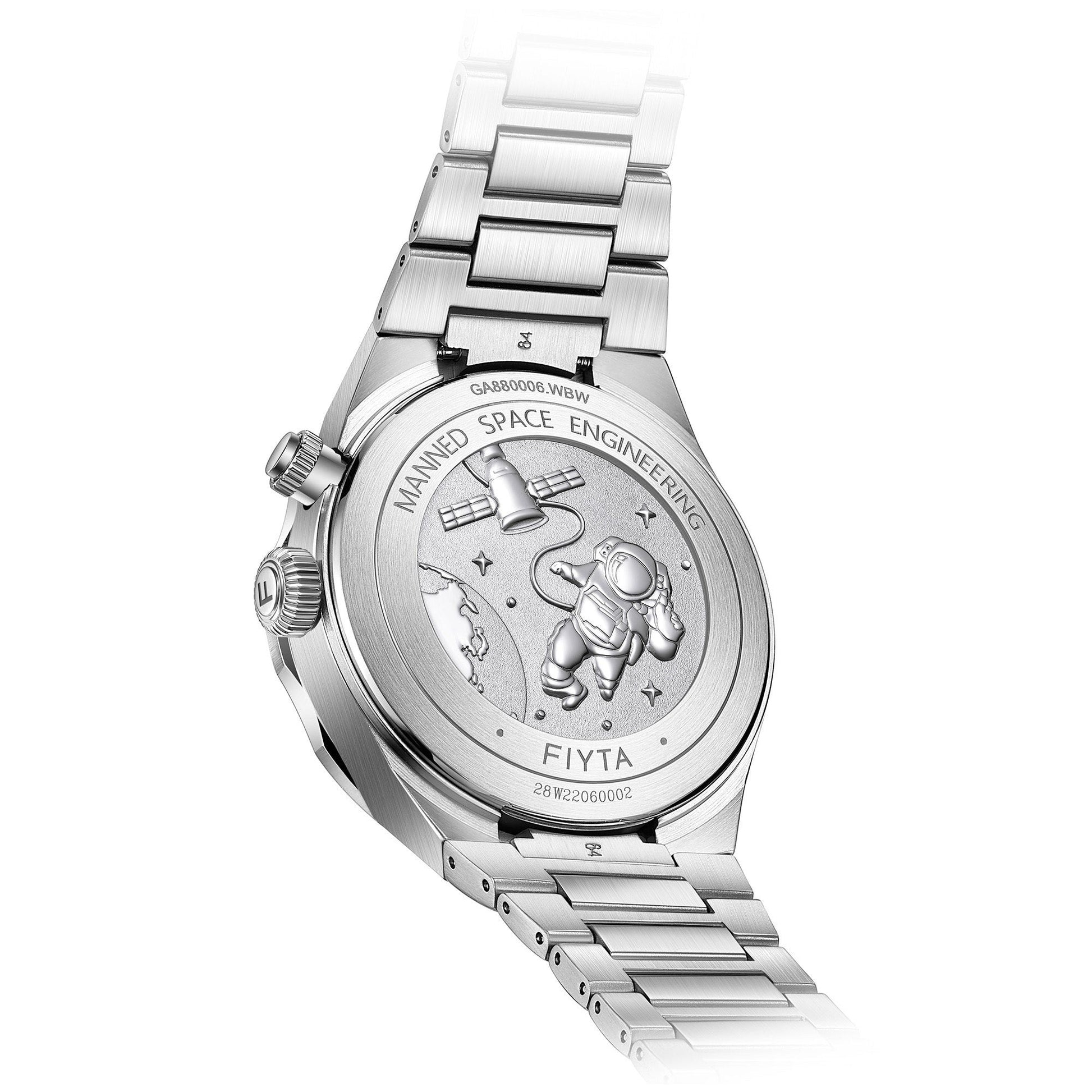 Stainless steel. Diameter: 42 mm. Thickness: 13 mm. Water resistance: 50 meters. Luminescence: Green luminescence on all hands, hour markers, and bottom sector on the 24-hour subdial. Blue luminescence on the top sector. Bezel: Silver color. Chronograph bezel. Anti-clockwise rotatable. The 7+1 hour scale on bezel is specially designed to indicate the limit time of stay outside cabin during spacewalk. Stainless steel bezel material. Dial: Grey-black. Sunburst fumé finish. Applied hour markers. Recessed subdials. Meteorite material for subdials at 3 and 9 o'clock. Iconic design of the blue and green sectors on subdial from FIYTA space watches. Crystal: Sapphire crystal. Flat. Has anti-reflective coating. Case back: Screw-down. Not transparent. Stainless steel case back. Crown: Fluted cylinder shape. Stainless steel crown. Signed with the "F" logo. Unscrew the button at 2 o'clock and push it to adjust the month.