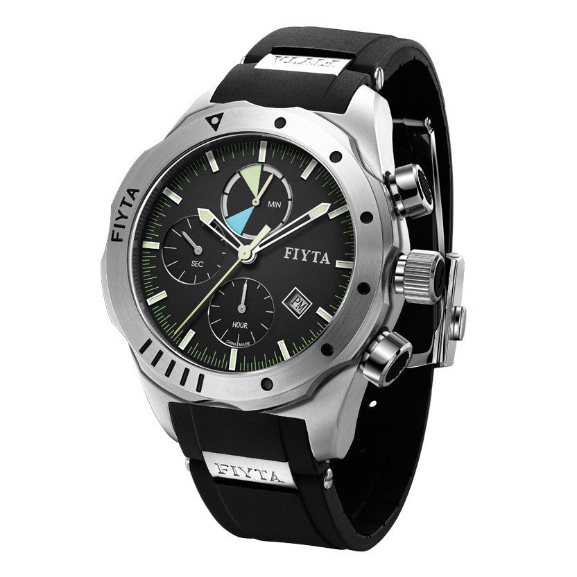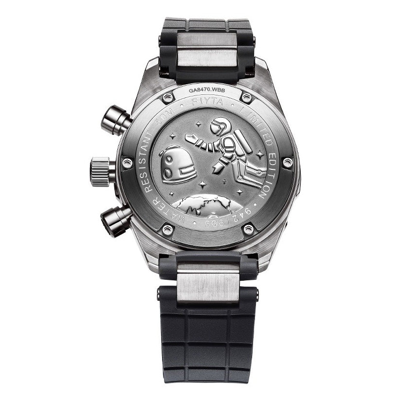 Stainless steel. The case material contains special alloy used for Shenzhou 7 spacecraft launch vehicle navigation systems. Diameter: 44 mm. Thickness: 13.5 mm. Lug width: 22 mm. Water resistance: 50 meters. Bezel: Chronograph bezel. Anti-clockwise rotatable. The 7+1 hour scale on bezel is specially designed to indicate the limit time of stay outside cabin during spacewalk. Dial: Black. Crystal: Sapphire crystal. Has anti-reflective coating. Case back: Fixed with screws. Not transparent. Embossed patterns of taikonaut, reentry capsule and the Earth.