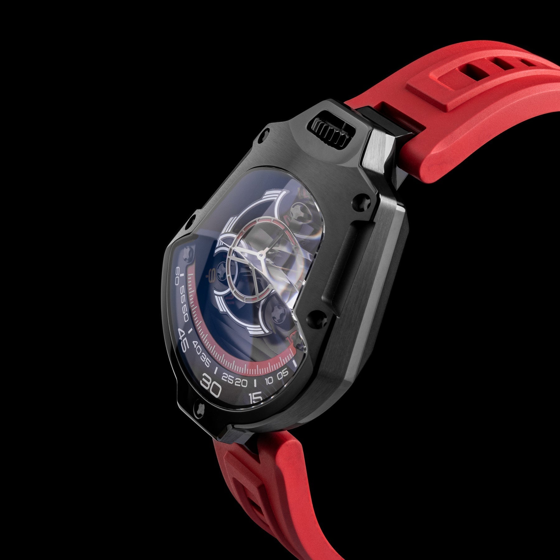 red strap, red curve on dial, black case, Arabic hour numerals