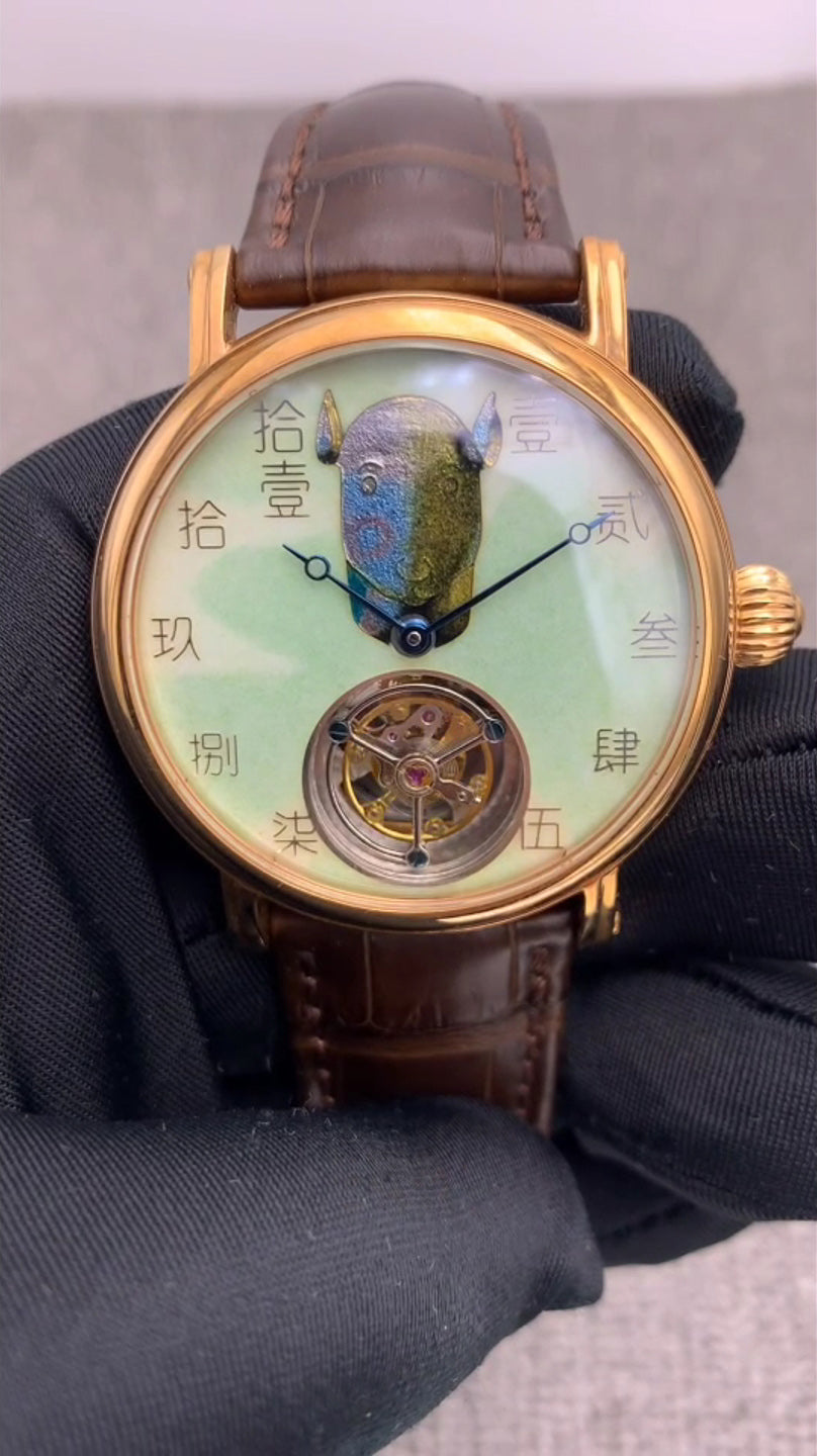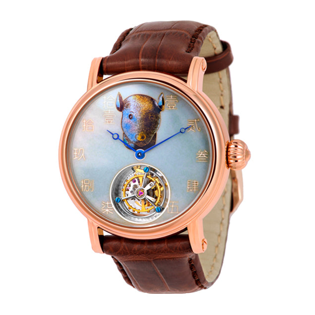 Sea-Gull reproduced the zodiac heads on watch dials with the cloisonné enamel techniques and combined with tourbillon module, gold filament are used to form the capitalized Chinese numerals. The twelve enamel dials are grouped by 3 in each group to showcase each of the four seasons, for example, the dials for Rat, Ox and Tiger represents Spring, and dials for Rabbit, Loong and snake represents Summer and so on. The watch case is made of 18K rose gold material, including the crown and clasp, paired with alligator leather bracelet.