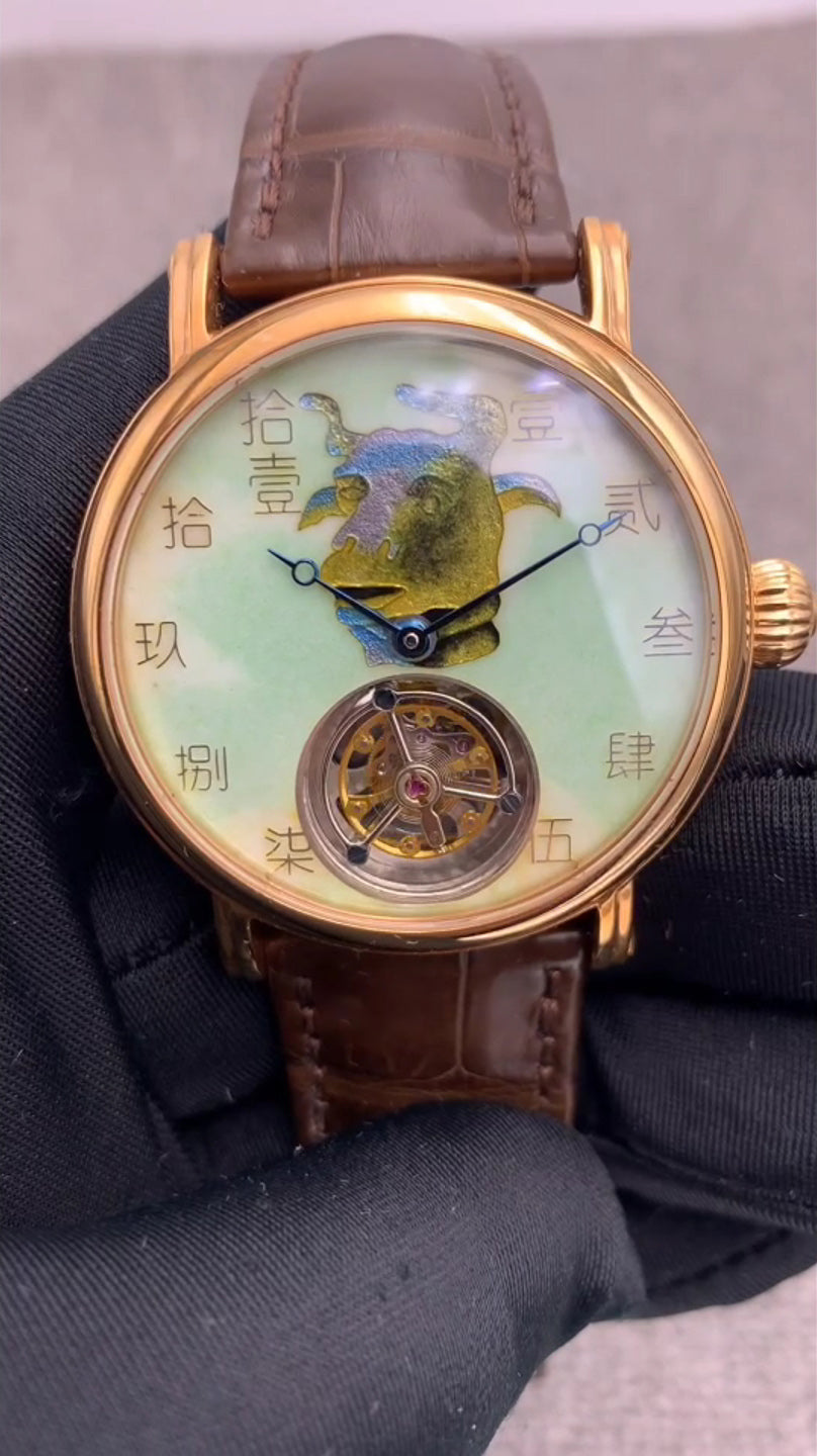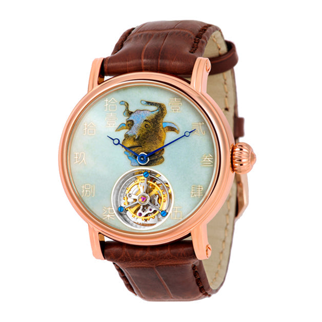 Sea-Gull reproduced the zodiac heads on watch dials with the cloisonné enamel techniques and combined with tourbillon module, gold filament are used to form the capitalized Chinese numerals. The twelve enamel dials are grouped by 3 in each group to showcase each of the four seasons, for example, the dials for Rat, Ox and Tiger represents Spring, and dials for Rabbit, Loong and snake represents Summer and so on. The watch case is made of 18K rose gold material, including the crown and clasp, paired with alligator leather bracelet.