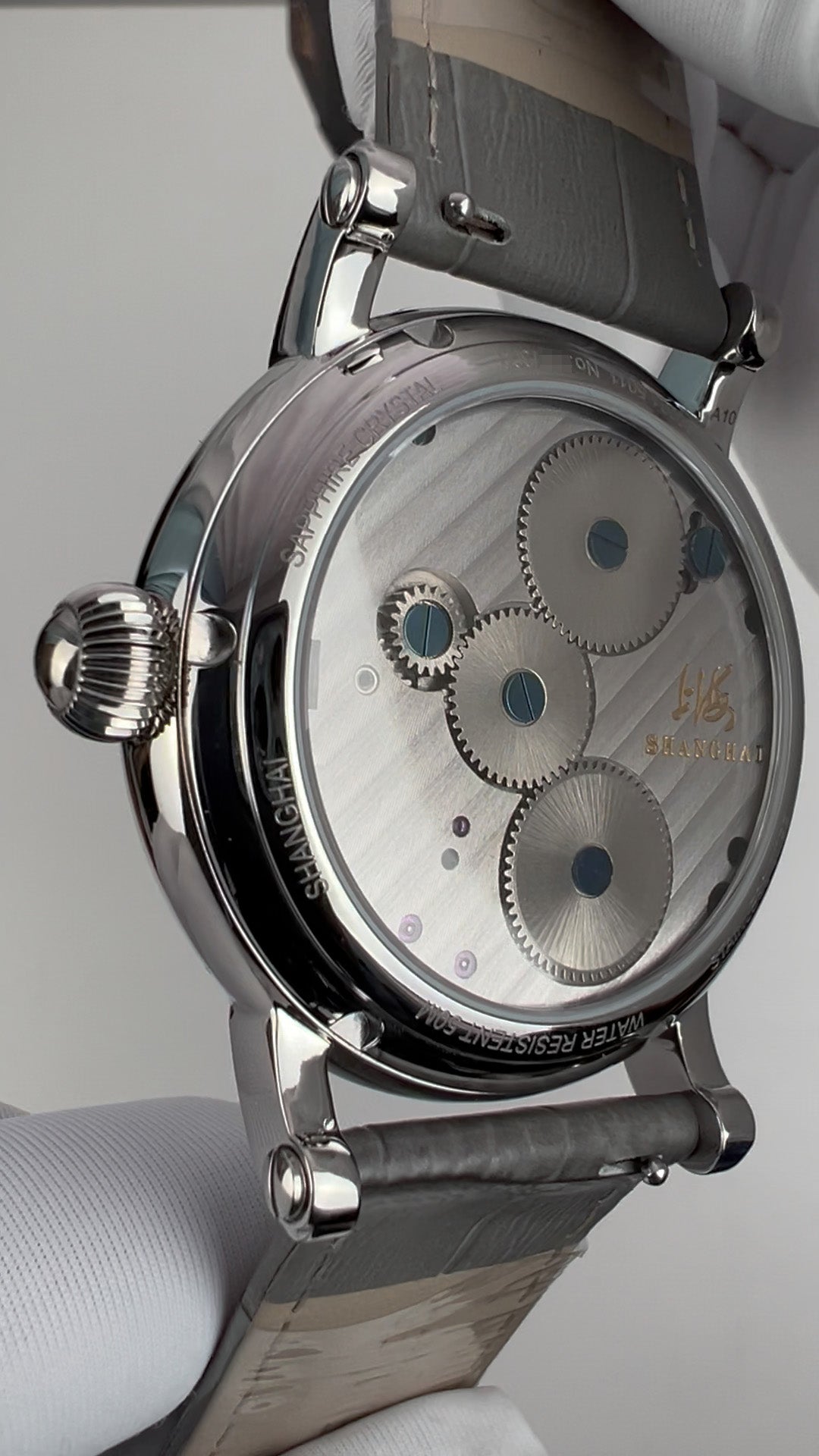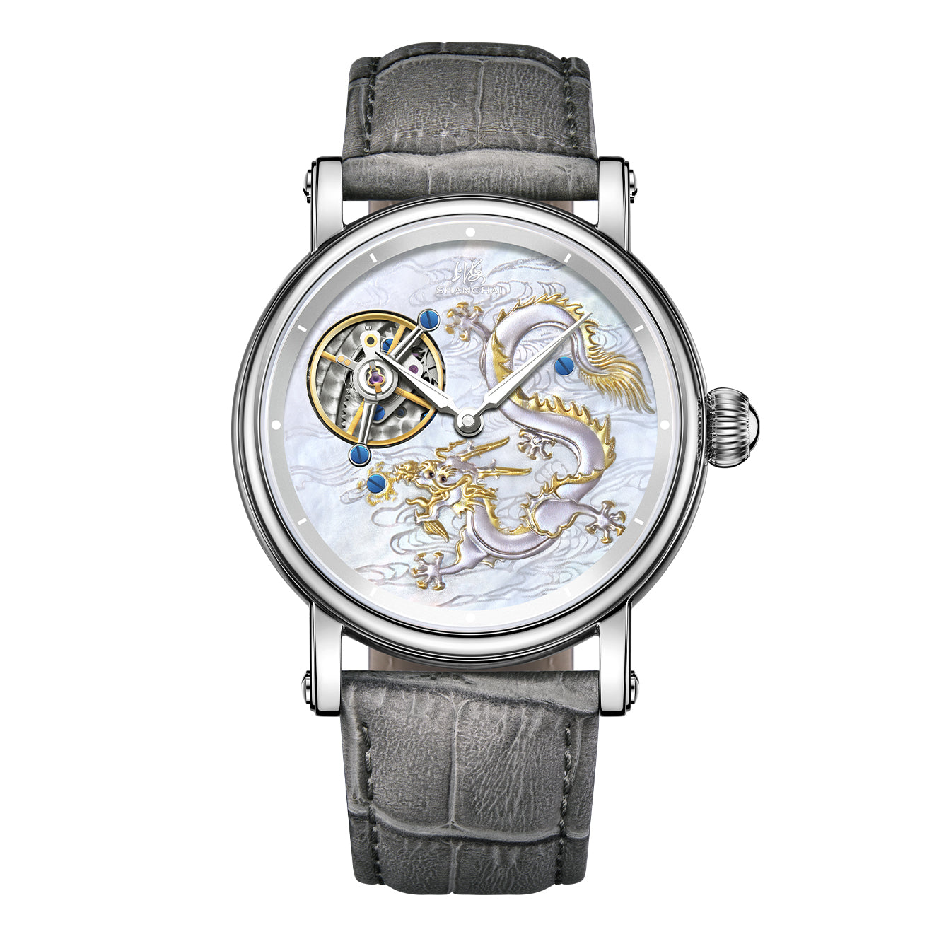 上海 - Shanghai. Position: 12 o'clock on the front crystal and on movement back.