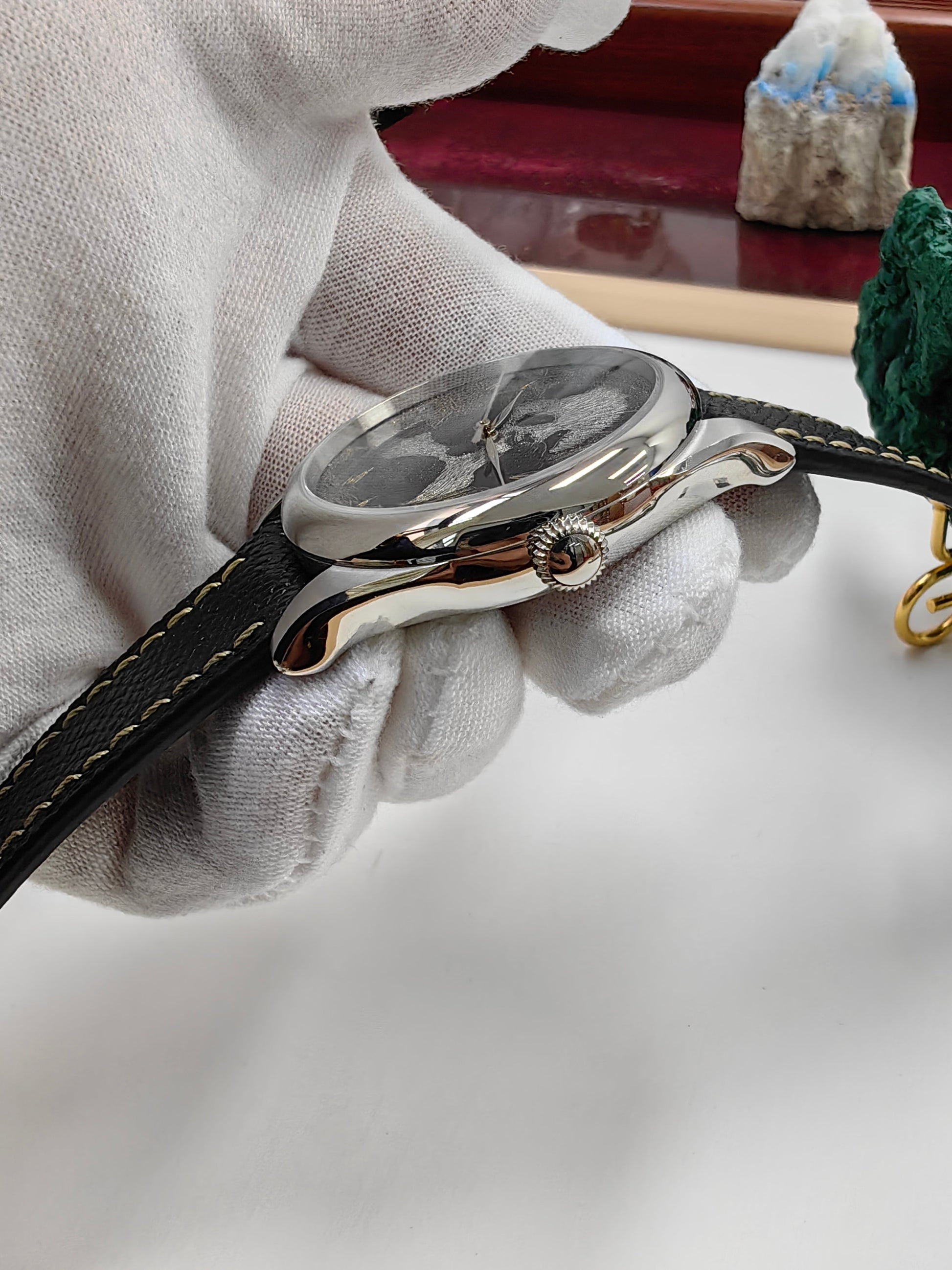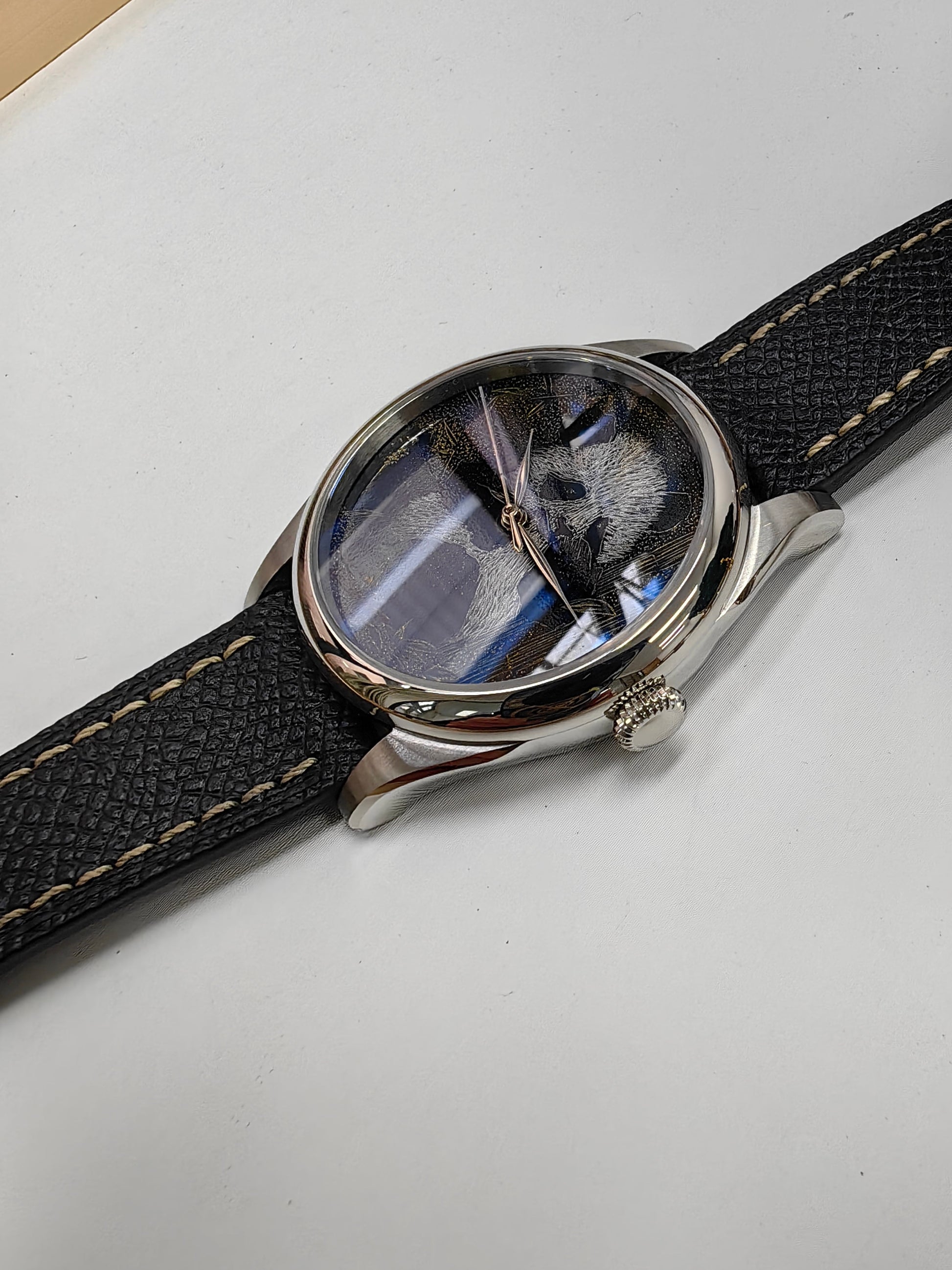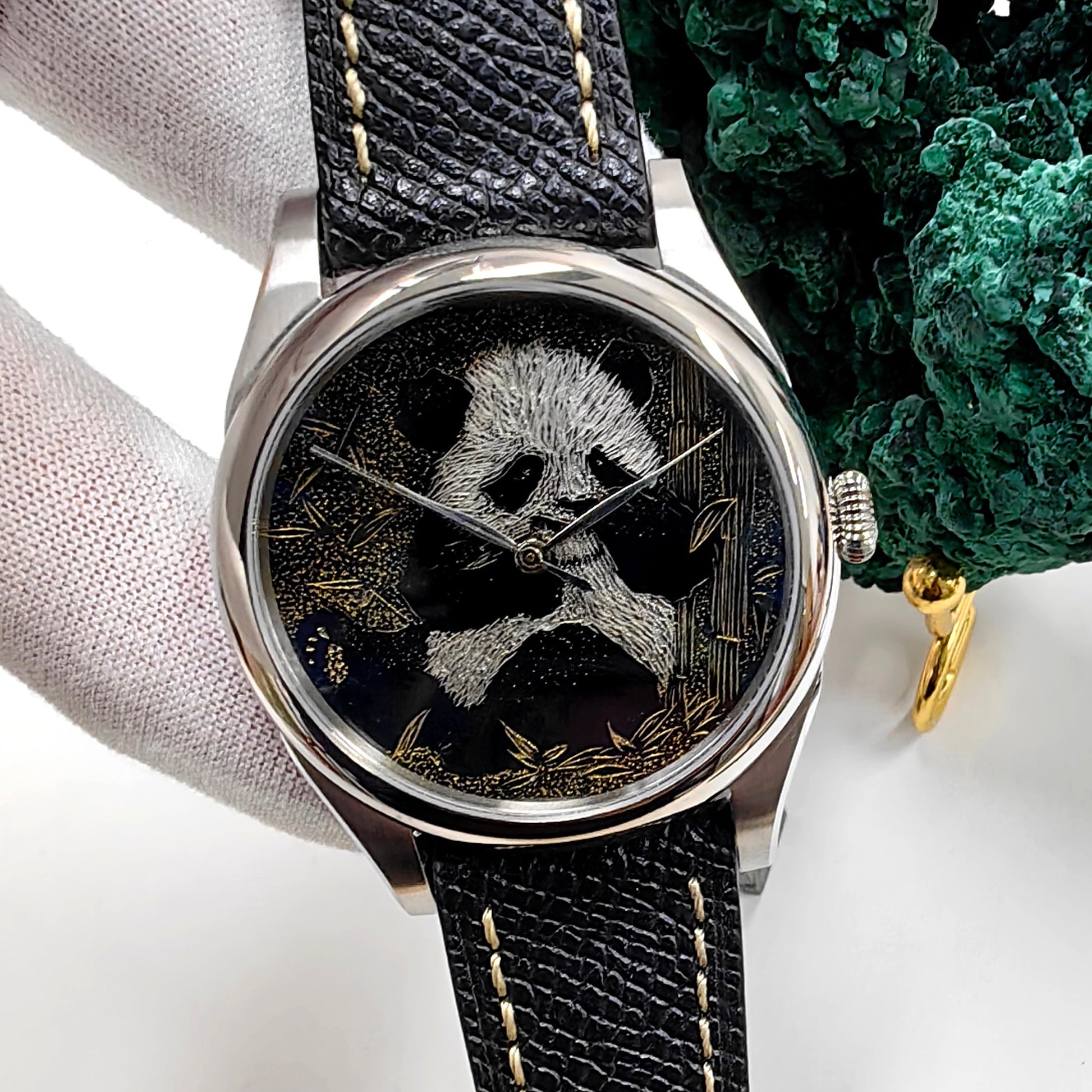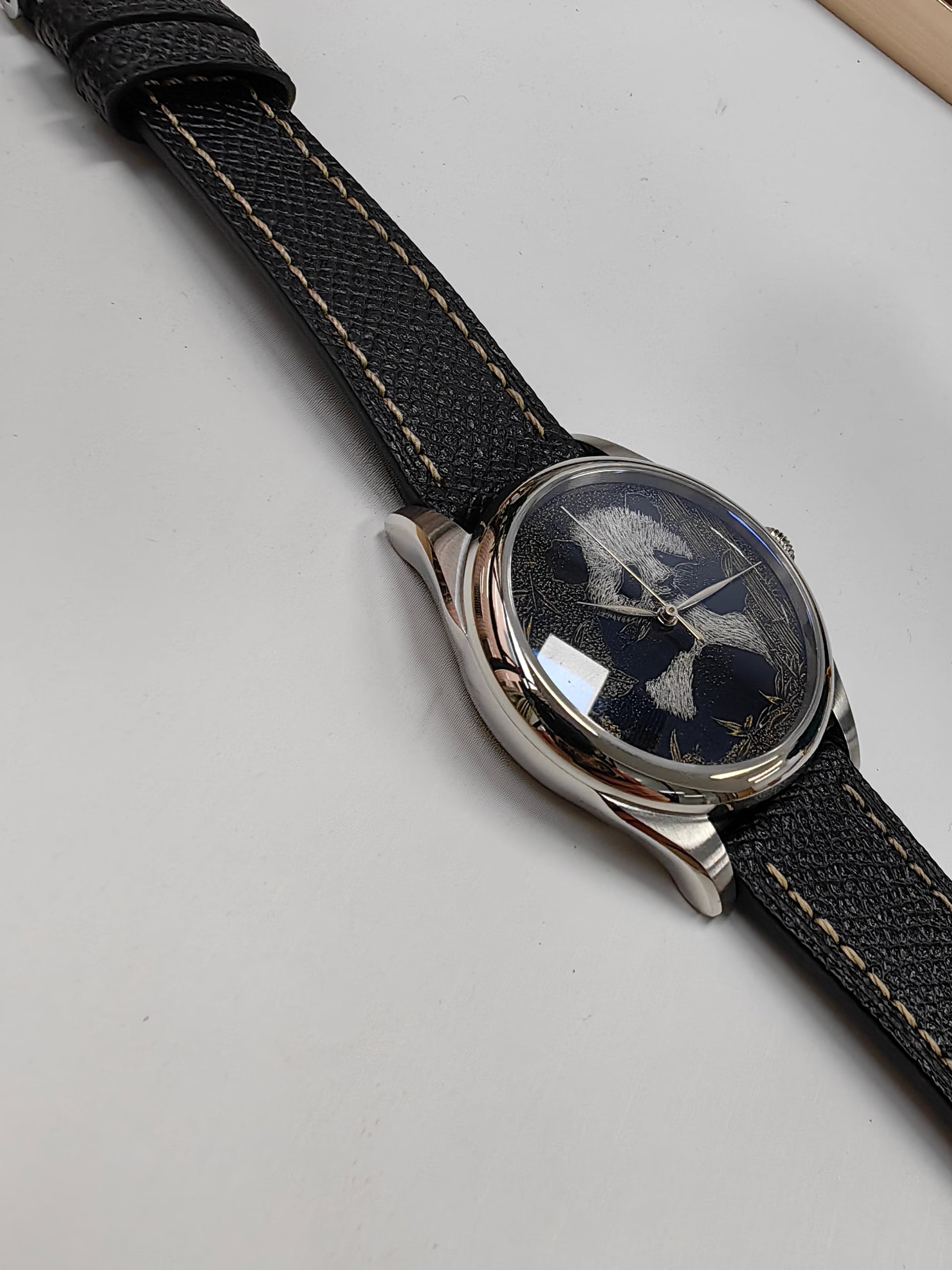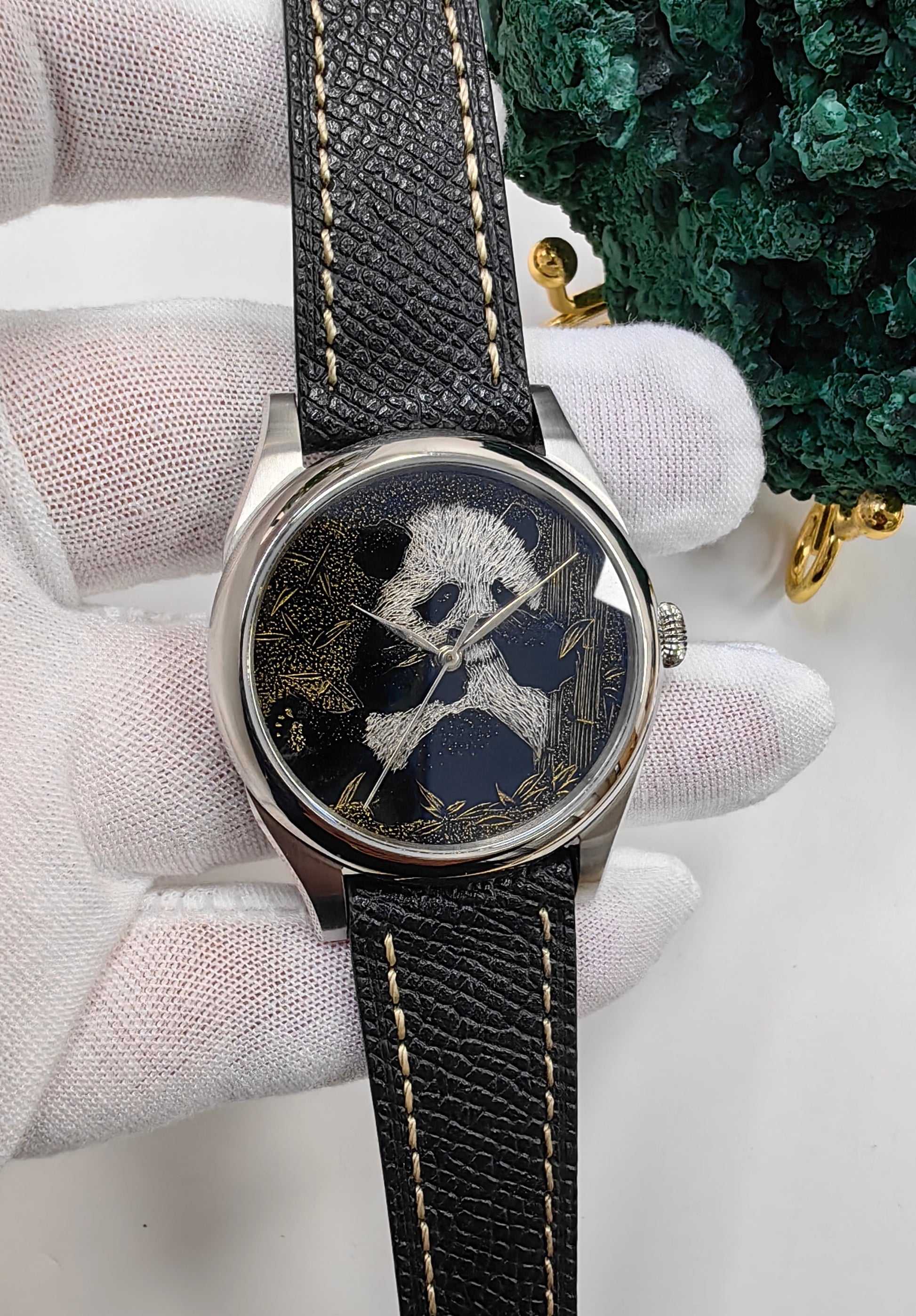 316L stainless steel. Diameter: 38 mm. Thickness: 10 mm. Lug width: 20 mm. Lug to lug: 47 mm. Water resistance: 50 meters. Luminescence: No lume. Dial: Lacquer. Manually carved panda pattern. Crystal: Sapphire crystal. Double domed. Case back: Fixed with screws. Transparent. Sapphire crystal case back. Crown: Push-pull. Pumpkin shape. Stainless steel crown. Crown not signed.