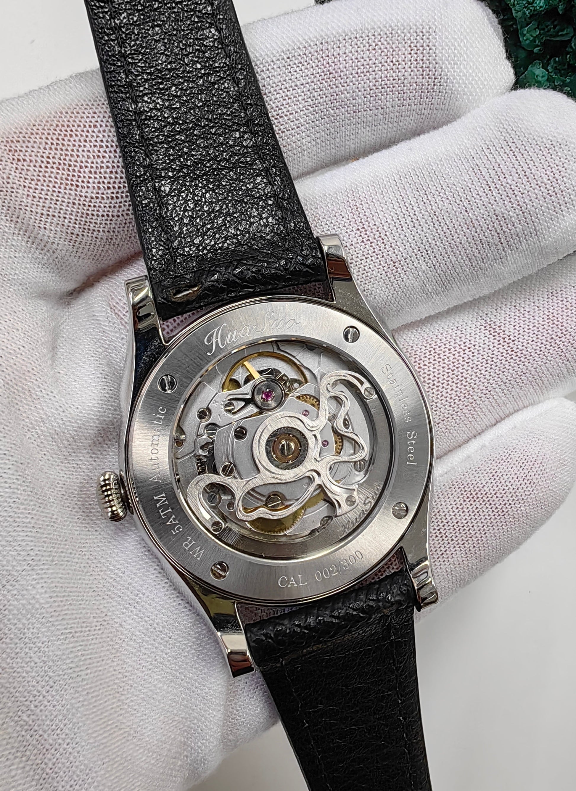 华梭 (HuaSuo). Name of the watch brand. Position: on case back.