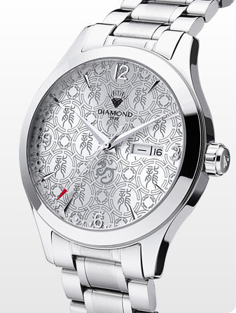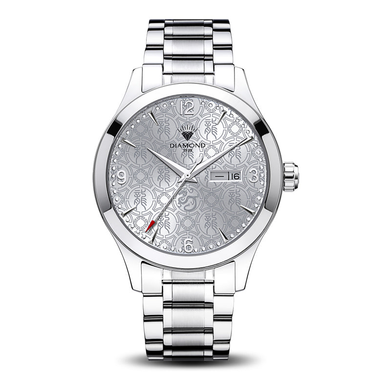 Chinese zodiac totem of Loong at 6 o'clock on the dial. Traditional Chinese characters of 龍 (Loong/Dragon) in the form of seal script within the dial patterns.