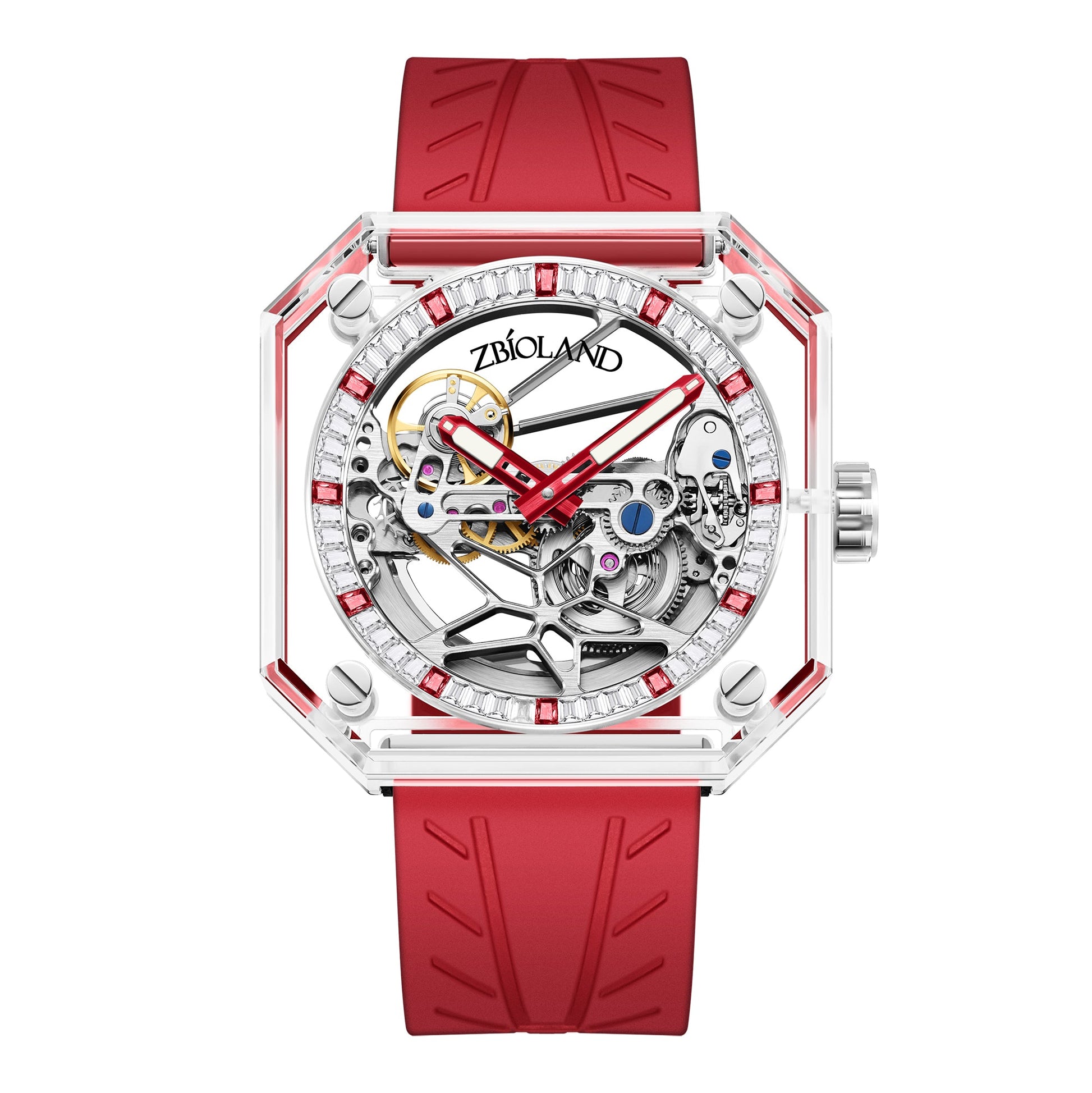 Red. Fluorine rubber. Quick release: Remove strap from case without tool. Clasp: Pin buckle. Stainless steel clasp.