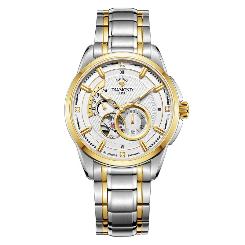316L stainless steel. Diameter: 42 mm. Thickness: 11.5 mm. Lug width: 21 mm. Water resistance: 30 meters. Weight: 166 grams (the whole watch including strap). Luminescence: Green luminescence on the hands. Crystal: Sapphire crystal. Case back: Transparent. Crown: Push-pull. Signed with the diamond logo.