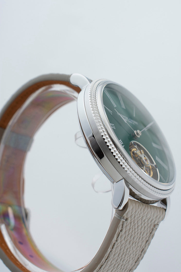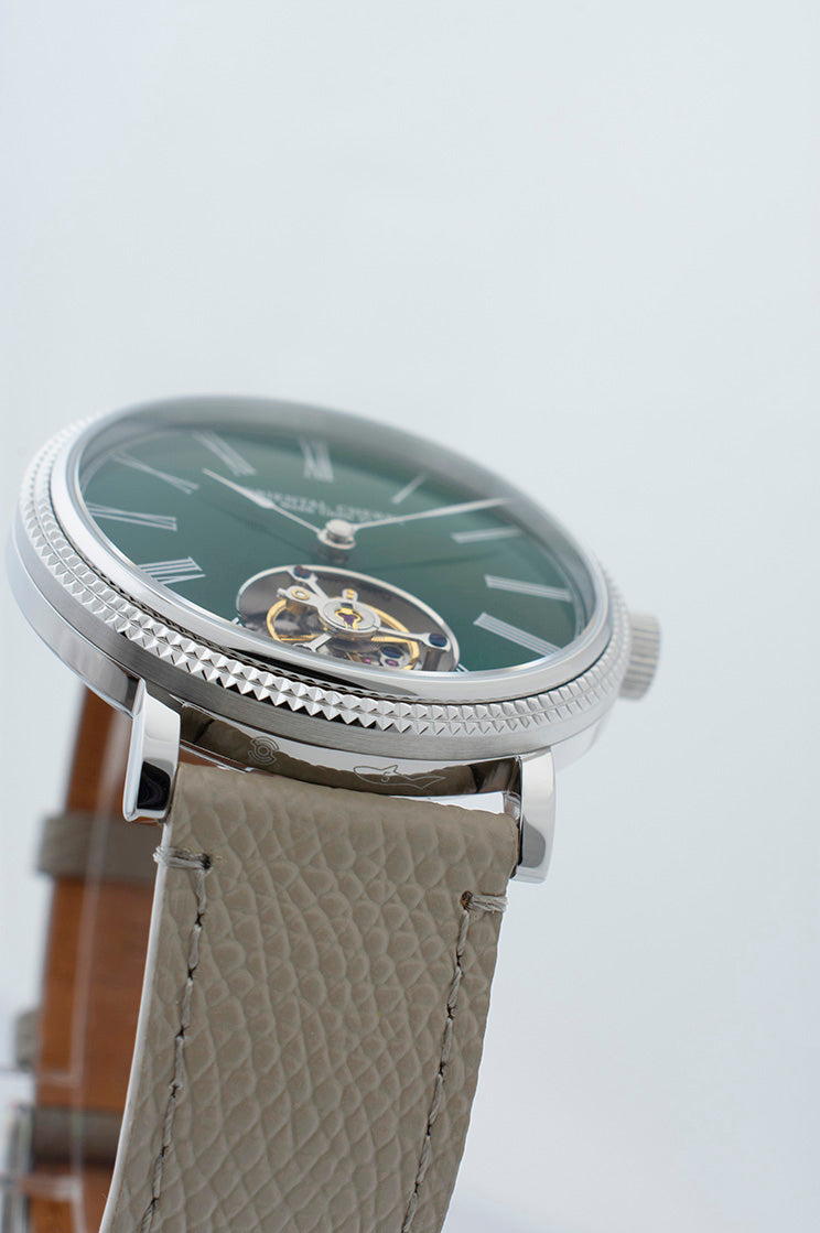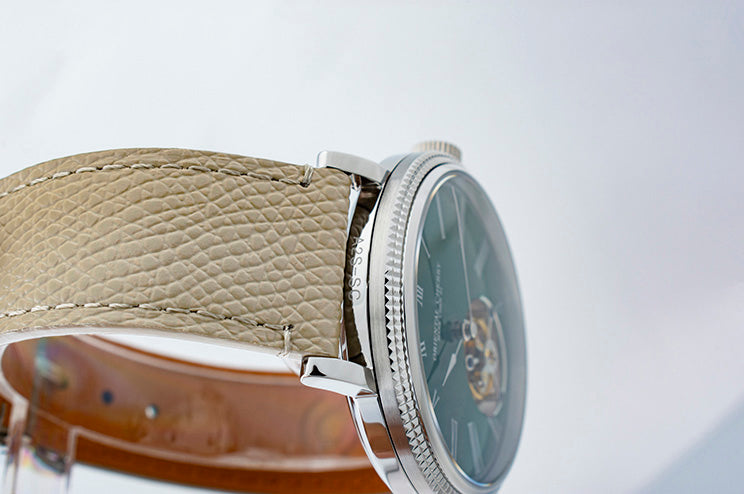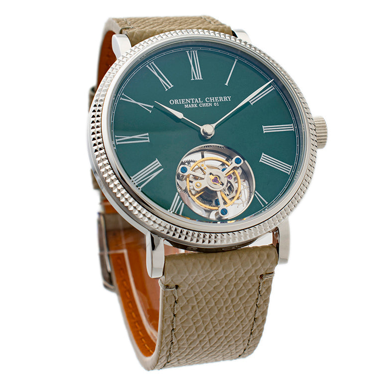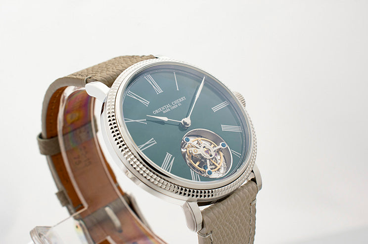 316L stainless steel. Diameter: 40 mm. Thickness: 10.8 mm. Lug width: 20 mm. Water resistance: 50 meters. Luminescence: No lume. Bezel: Clous de Paris on bezel. Dial: Green. Enamel. 搪瓷 yes, 珐琅 no. Crystal: Sapphire crystal. Case back: Screw-down. Transparent. Sapphire crystal case back. Crown: Push-pull. Fluted cylinder shape. Stainless steel crown. Signed with the Oriental Cherry brand logo.