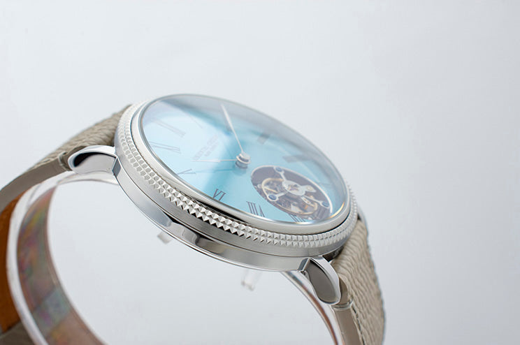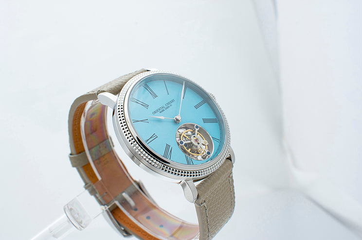 316L stainless steel. Diameter: 40 mm. Thickness: 10.8 mm. Lug width: 20 mm. Water resistance: 50 meters. Luminescence: No lume. Bezel: Clous de Paris on bezel. Dial: Blue. Enamel. 搪瓷 yes, 珐琅 no. Crystal: Sapphire crystal. Case back: Screw-down. Transparent. Sapphire crystal case back. Crown: Push-pull. Fluted cylinder shape. Stainless steel crown. Signed with the Oriental Cherry brand logo.