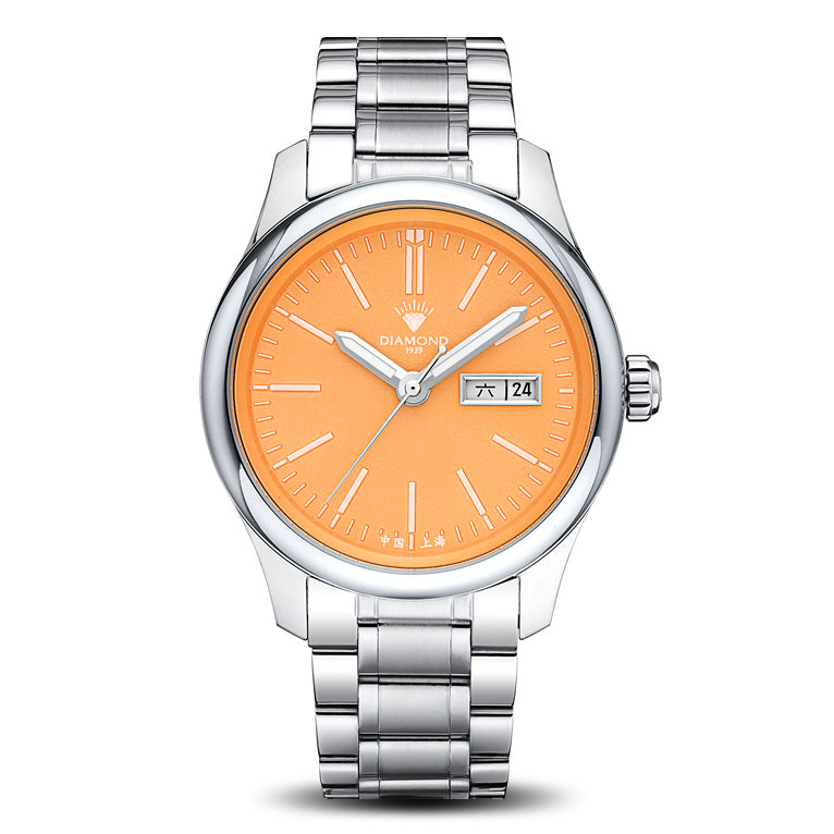 Stainless steel. Diameter: 40 mm. Thickness: 11.5 mm. Lug width: 19 mm. Water resistance: 50 meters. Weight: 128 grams (the whole watch including strap). Luminescence: Luminescence on hour hand, minute hand and hour markers. Dial: Orange. Matte finish. Crystal: Sapphire crystal. Case back: Screw-down notched. Transparent. Hands: Pencil hour and minute hands. Needle seconds hand. Crown: Push-pull. Stainless steel crown. Signed with the diamond logo.