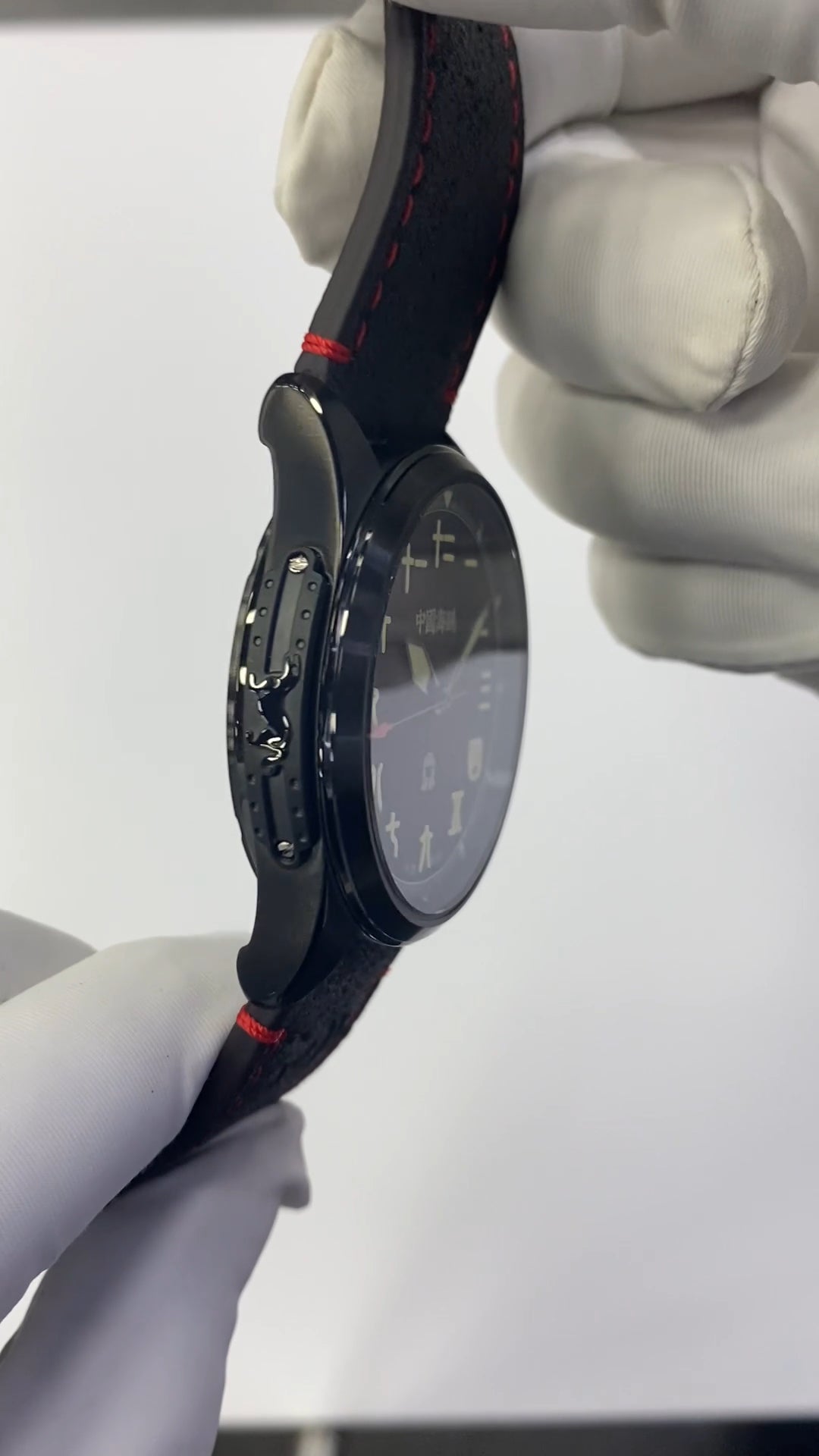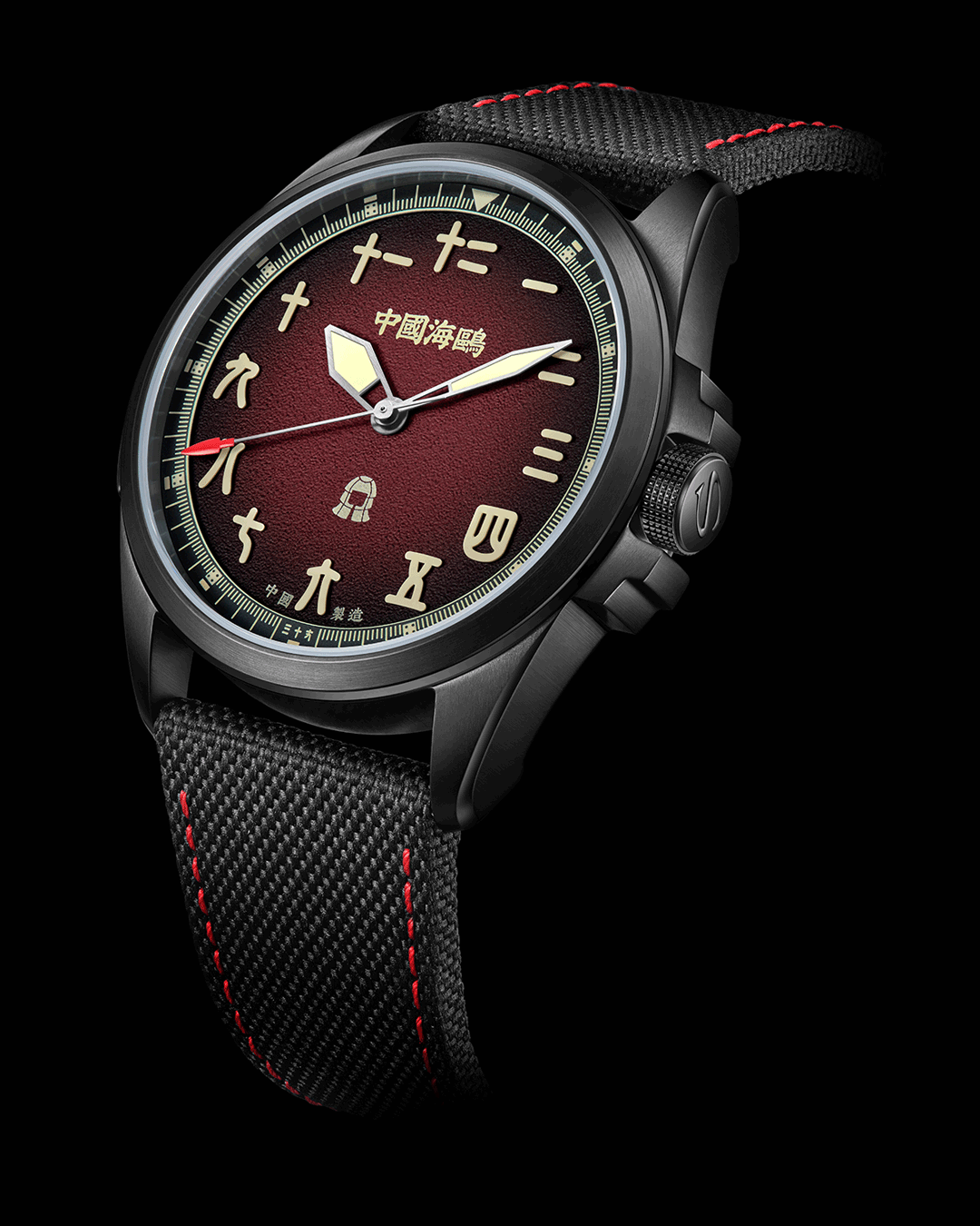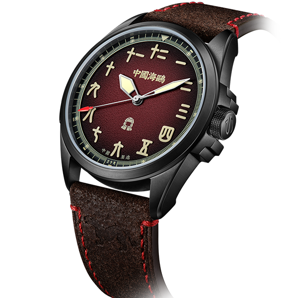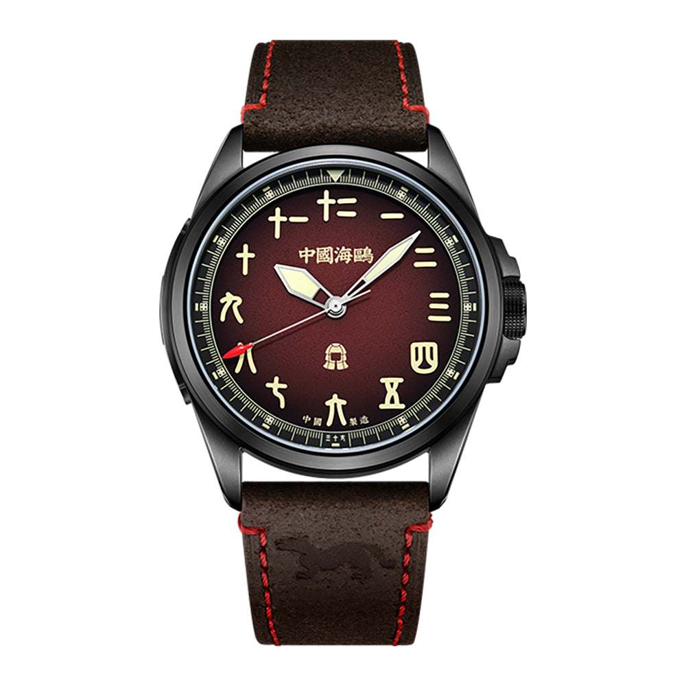 316L stainless steel. DLC black. Diameter: 43 mm. Thickness: 12 mm. Lug width: 24 mm. Lug to lug: 49 mm. Water resistance: 10 ATM. Weight: 69 grams (the whole watch including strap). Luminescence: Green luminescence on hour and minute hands, the numerals, the triangle at 12 o'clock and the squares near the numerals. Dial: Red. Fumé matte finish. Applied Chinese numerals. Crystal: Sapphire crystal. Flat. Case back: Screw-down notched. Not transparent. 316L stainless steel · DLC black case back. Hands: Sword hour and minute hands. Qin crossbow arrow seconds hand. Crown: Screw-down. Cylinder shape. Signed with the "S" logo.