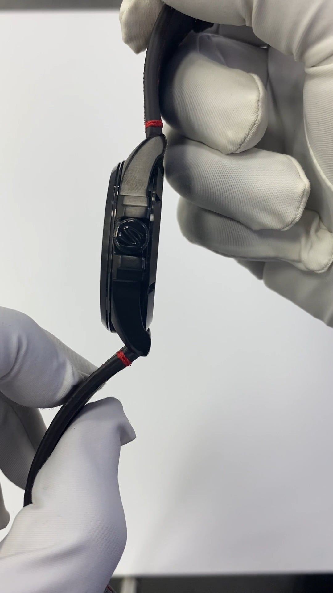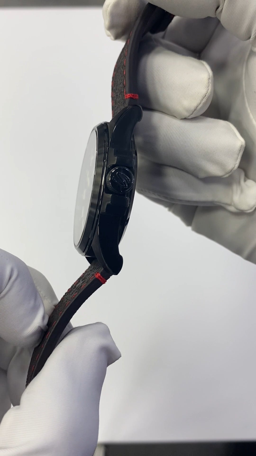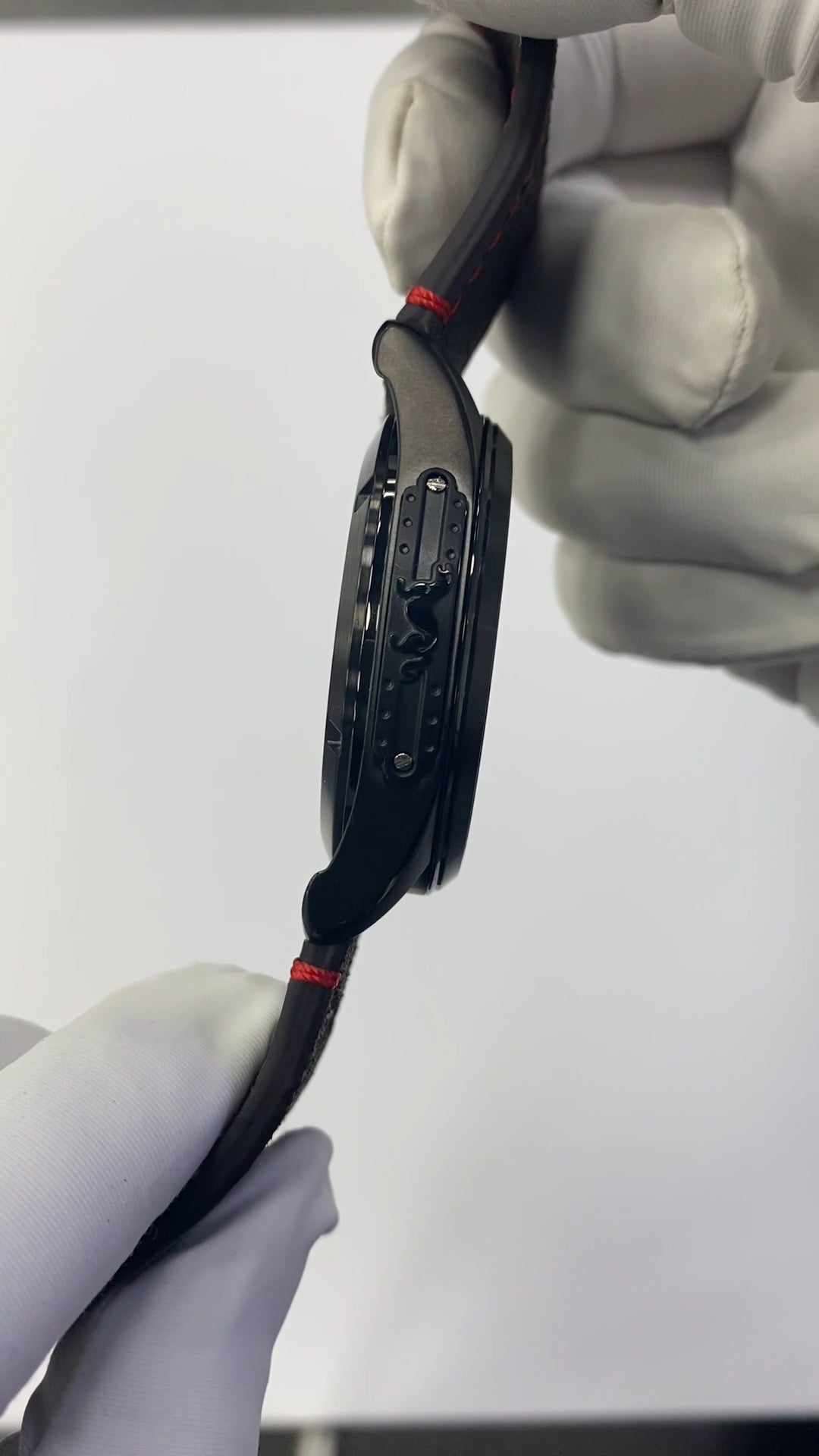 316L stainless steel. DLC black. Diameter: 43 mm. Thickness: 12 mm. Lug width: 24 mm. Lug to lug: 49 mm. Water resistance: 10 ATM. Weight: 69 grams (the whole watch including strap). Luminescence: Green luminescence on hour and minute hands, the numerals, the triangle at 12 o'clock and the squares near the numerals. Dial: Red. Fumé matte finish. Applied Chinese numerals. Crystal: Sapphire crystal. Flat. Case back: Screw-down notched. Not transparent. 316L stainless steel · DLC black case back. Hands: Sword hour and minute hands. Qin crossbow arrow seconds hand. Crown: Screw-down. Cylinder shape. Signed with the "S" logo.