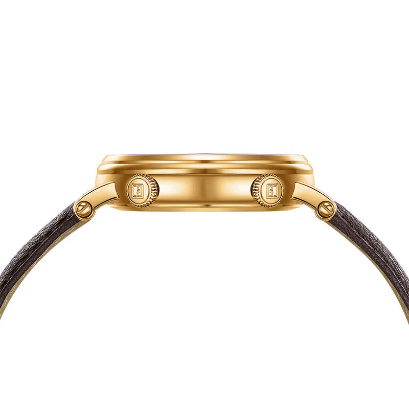 18K gold. Diameter: 40 mm. Thickness: 10.2 mm. Water resistance: 3 ATM. Luminescence: No lume. Dial: Gold color. Compression-molded floral tendril pattern and sunburst pattern. Set with 10 pieces of diamond. Crystal: Sapphire crystal. Flat. Has anti-reflective coating. Case back: Fixed with screws. Not transparent. 18K gold case back. Hands: Willow leaf hands plated in gold color. Crown: Push-pull. Pumpkin shape. Signed with the "BJ" logo.