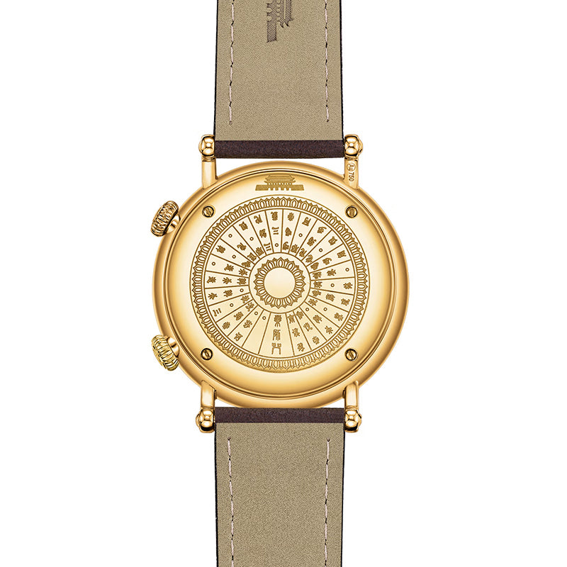 In Chinese (also seen on the subdial at 6 o'clock and on case back): 南谟薄伽伐帝。鞞杀社。窭噜薜琉璃。钵喇婆。喝啰阇也。怛他揭多耶。阿啰喝帝。三藐三勃陀耶。怛侄他。唵。鞞杀逝。鞞杀逝。鞞杀社。三没揭帝。莎诃。