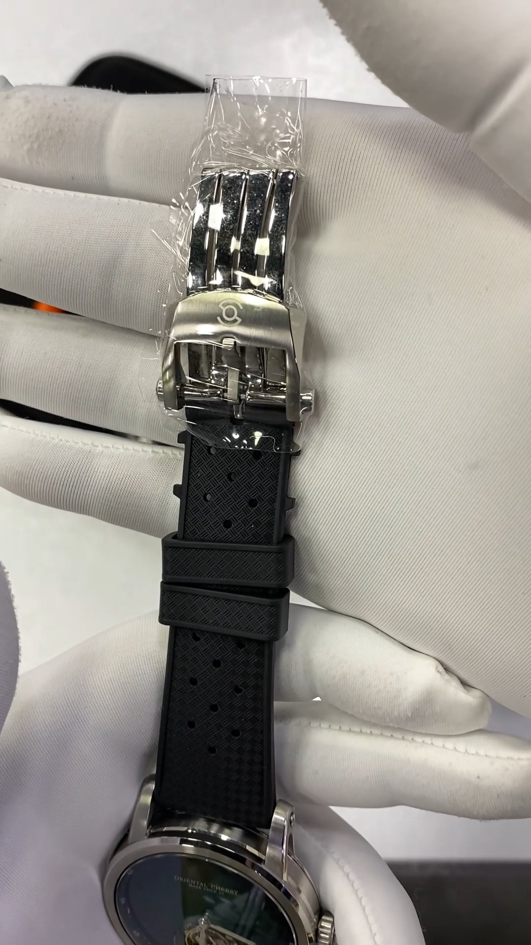 316L stainless steel. Diameter: 41 mm. Thickness: 10.7 mm. Lug width: 22 mm. Lug to lug: 49.5 mm. Water resistance: 50 meters. Luminescence: Luminescence on hour hand, minute hand, and the background of the tourbillon module. Dial: Green. Sunburst finish. Crystal: Sapphire crystal. Double domed. Has anti-reflective coating. AR coating position: Under side. Five layers of AR coating. Case back: Fixed with screws. Transparent. Sapphire crystal case back. Hands: Baton hour and minute hands. Crown: Push-pull. Gear shape. Stainless steel crown. Signed with the Oriental Cherry brand logo.