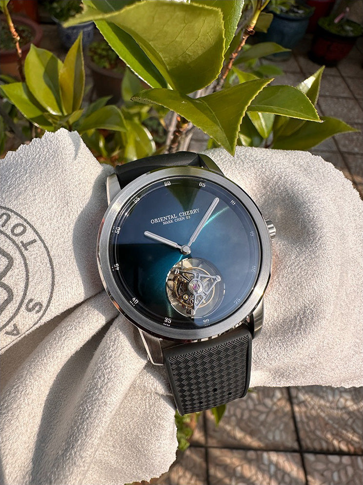 316L stainless steel. Diameter: 41 mm. Thickness: 10.7 mm. Lug width: 22 mm. Lug to lug: 49.5 mm. Water resistance: 50 meters. Luminescence: Luminescence on hour hand, minute hand, and the background of the tourbillon module. Dial: Blue. Sunburst finish. Crystal: Sapphire crystal. Double domed. Has anti-reflective coating. AR coating position: Under side. Five layers of AR coating. Case back: Fixed with screws. Transparent. Sapphire crystal case back. Hands: Baton hour and minute hands. Crown: Push-pull. Gear shape. Stainless steel crown. Signed with the Oriental Cherry brand logo.