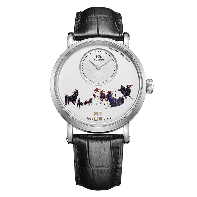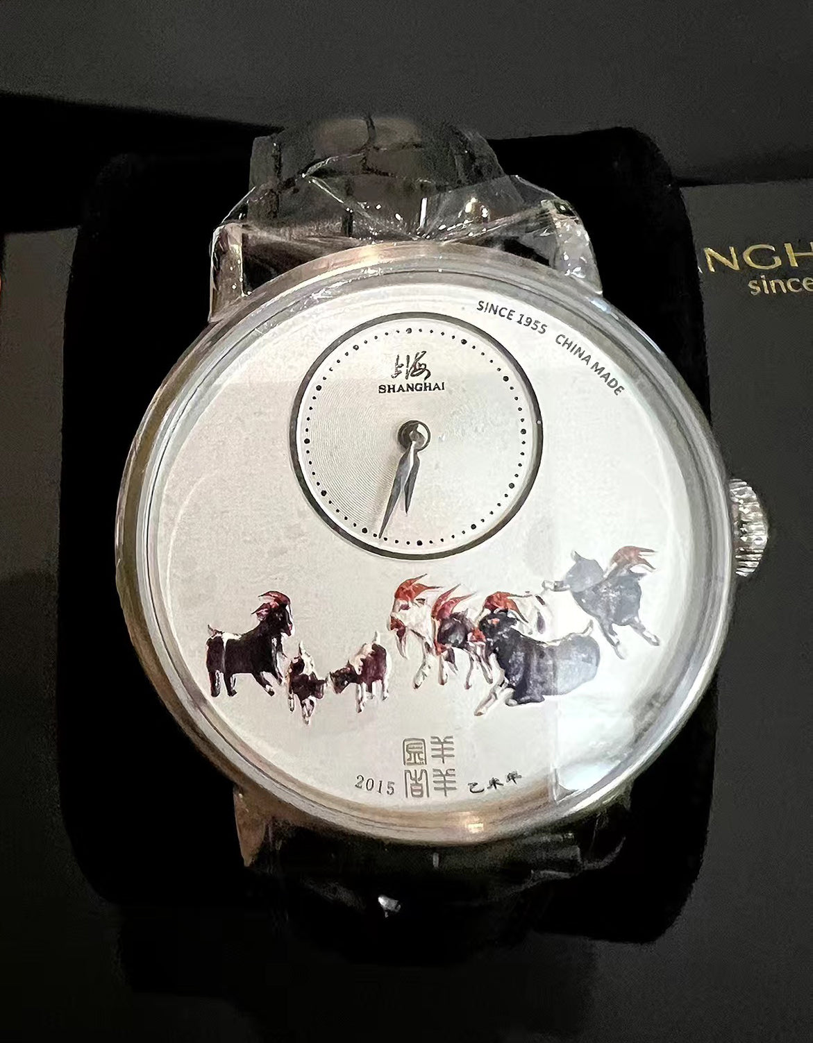 上海 - Shanghai. Watch brand name, same as the city Shanghai. Position: 12 o'clock on dial, on crown, back side of strap and strap buckle.