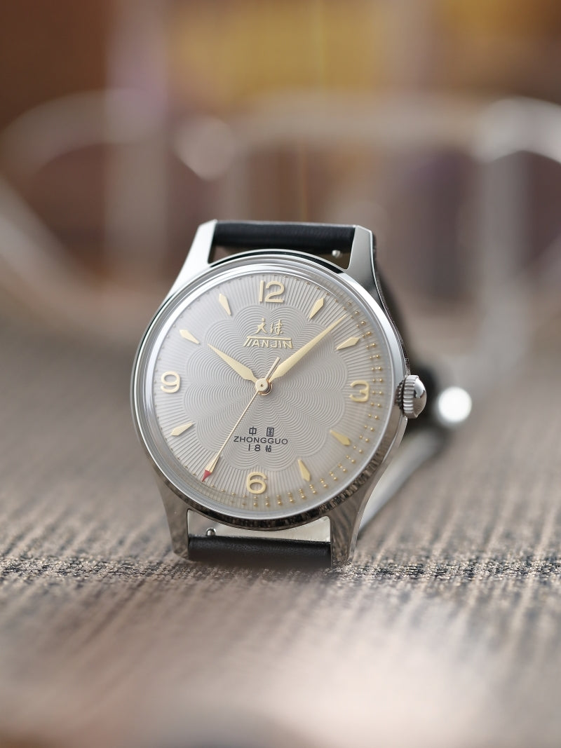 This model reproduces the look of a Tianjin (天津) brand watch from Tianjin Watch Factory back to 1964 with a bigger case and contemporary movement.