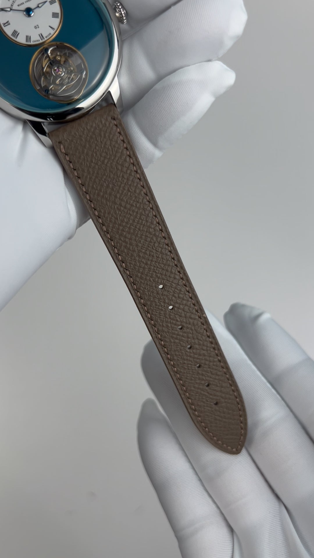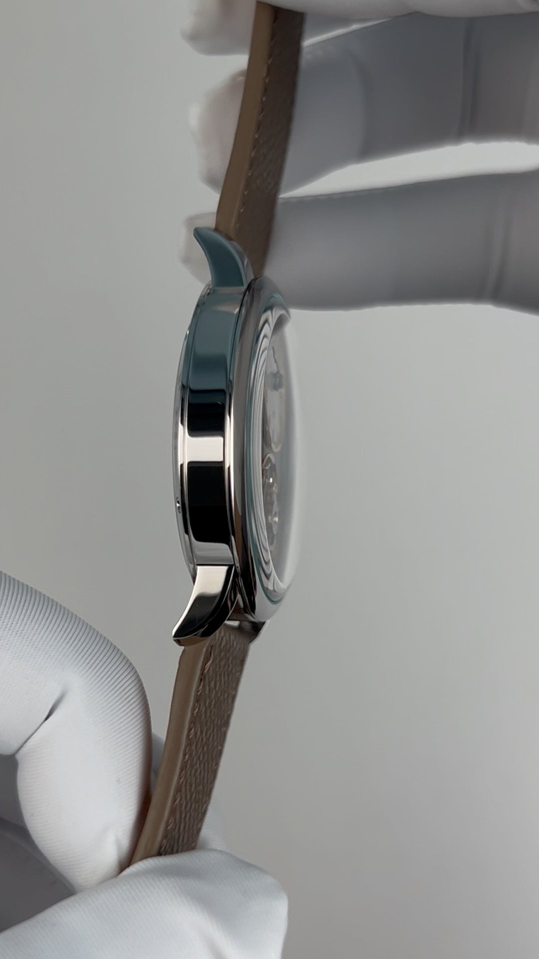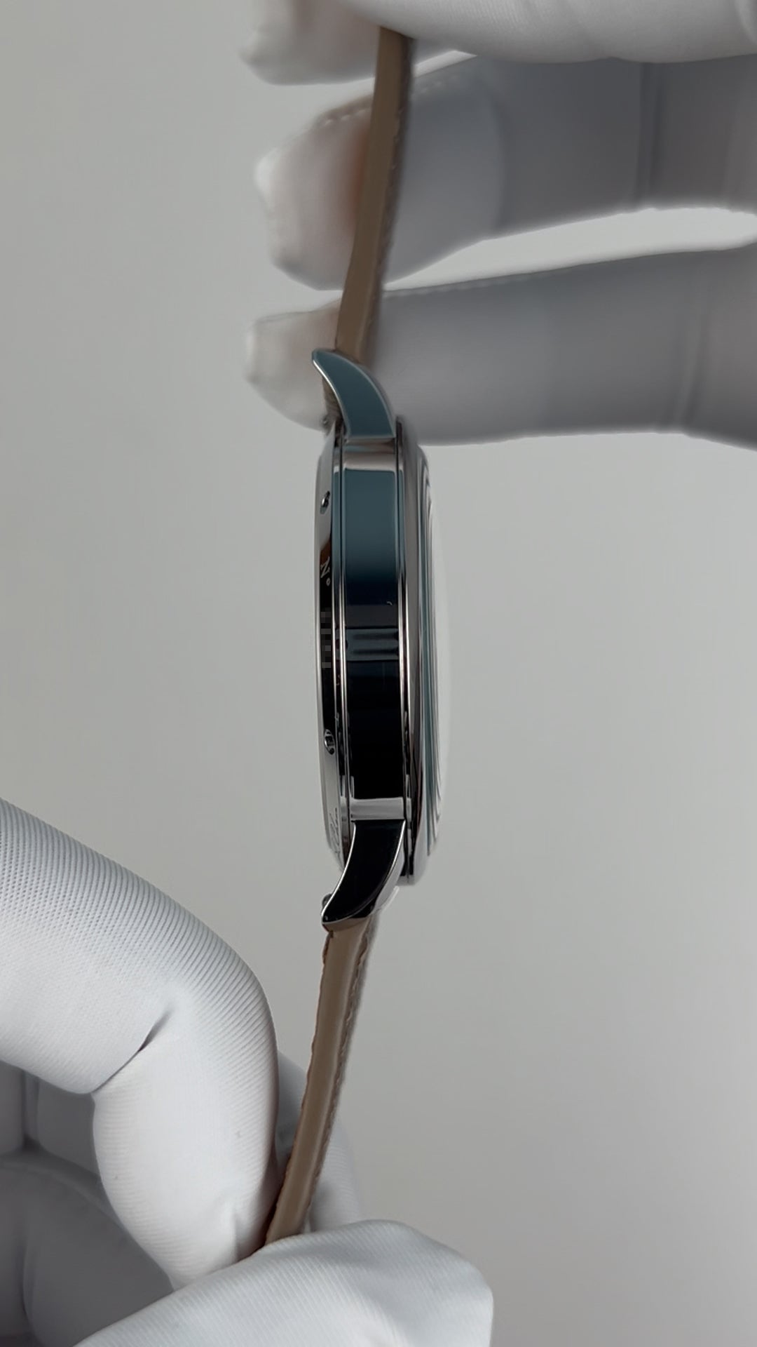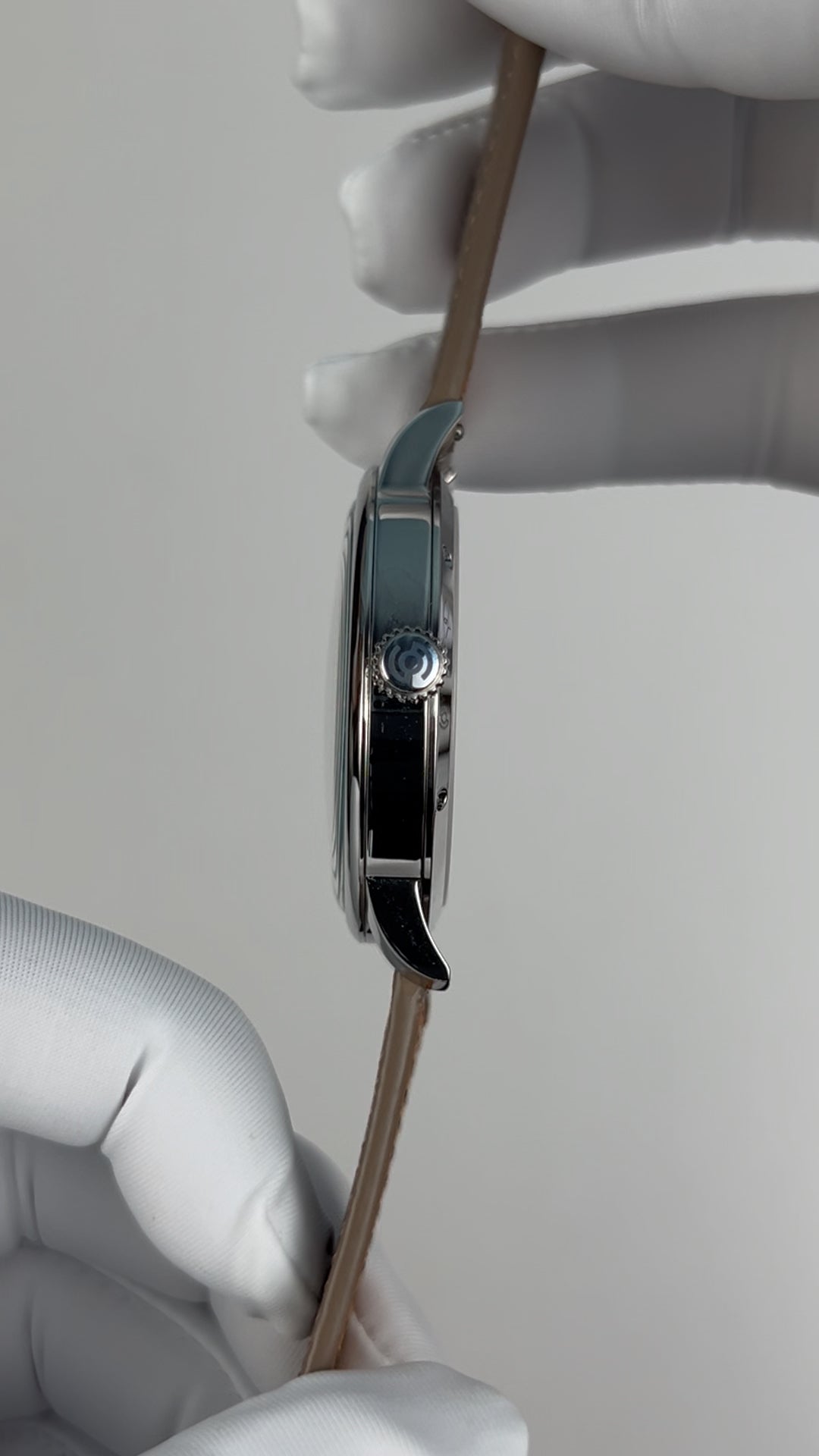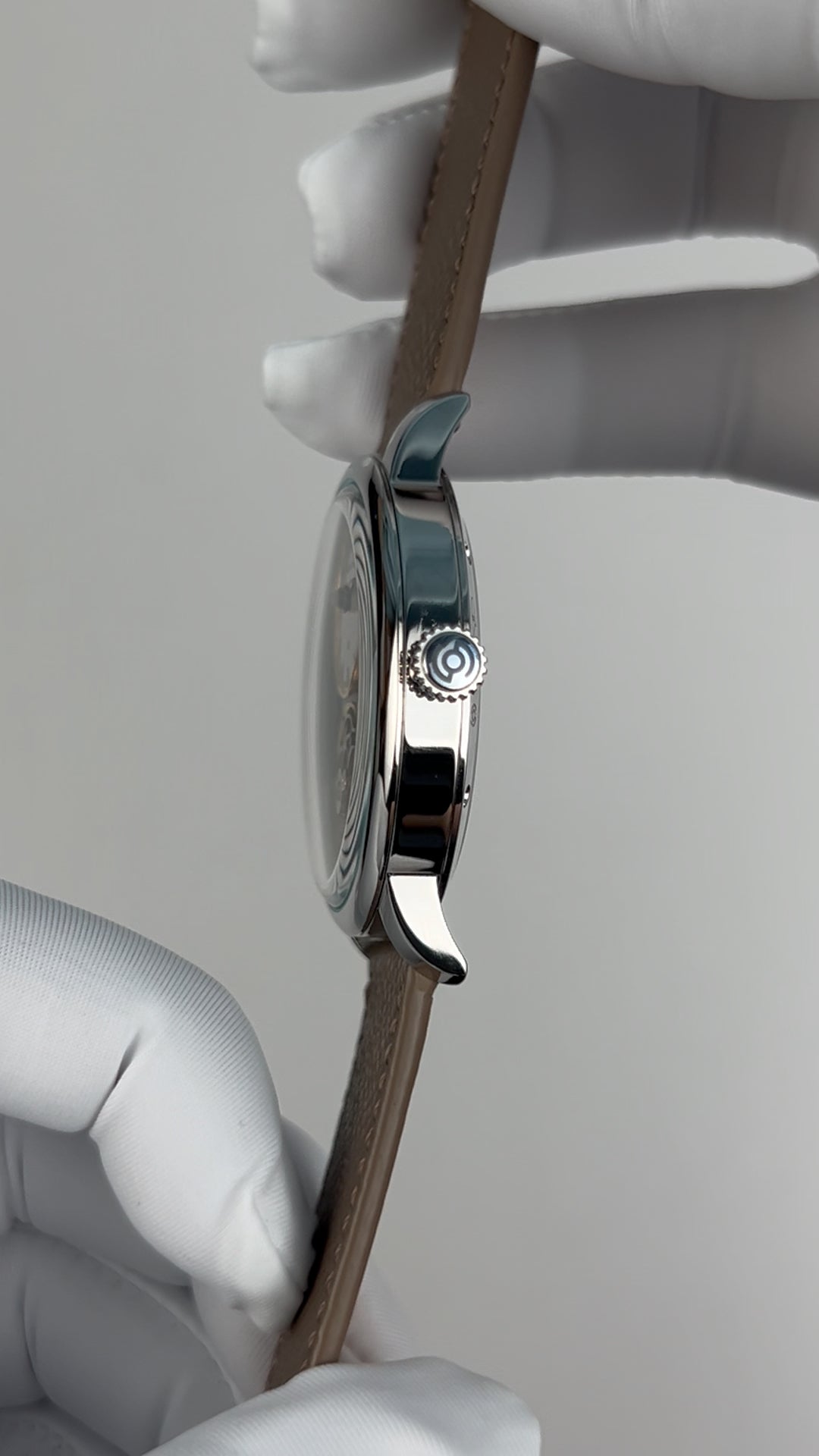 316L stainless steel. Diameter: 41 mm. Thickness: 11 mm. Lug width: 20 mm. Lug to lug: 48 mm. Water resistance: 50 meters. Luminescence: Super-LumiNova luminescent material on hour and minute hands. Dial: Sky blue. Enamel. 搪瓷 yes, 珐琅 no. Crystal: Sapphire crystal. Double domed. Has anti-reflective coating. AR coating position: Under side. Five layers of AR coating. Case back: Fixed with screws. Transparent. Sapphire crystal case back. Crown: Push-pull. Stainless steel crown. Signed with the Oriental Cherry brand logo. Crown diameter: 5.8 mm.