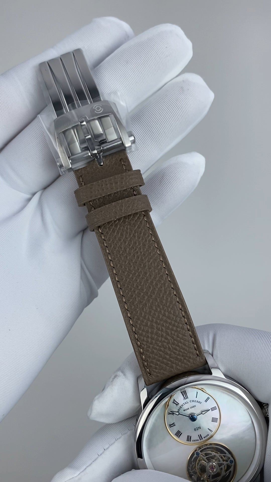 316L stainless steel. Diameter: 41 mm. Thickness: 10.4 mm. Lug width: 20.1 mm. Lug to lug: 48 mm. Water resistance: 50 meters. Weight: 79 grams (the whole watch including strap). Luminescence: Super-LumiNova luminescent material on hour and minute hands. Dial: White. Mother of pearl. Crystal: Sapphire crystal. Double domed. Has anti-reflective coating. AR coating position: Under side. Five layers of AR coating. Case back: Fixed with screws. Transparent. Sapphire crystal case back. Crown: Push-pull. Stainless steel crown. Signed with the Oriental Cherry brand logo. Crown diameter: 5.8 mm.