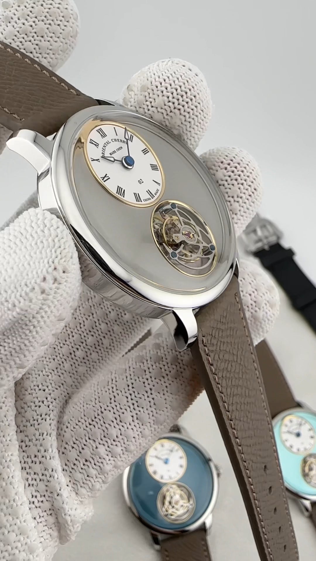 316L stainless steel. Diameter: 41 mm. Thickness: 11 mm. Lug width: 20 mm. Lug to lug: 48 mm. Water resistance: 50 meters. Luminescence: Super-LumiNova luminescent material on hour and minute hands. Dial: Grey. Enamel. 搪瓷 yes, 珐琅 no. Crystal: Sapphire crystal. Double domed. Has anti-reflective coating. AR coating position: Under side. Five layers of AR coating. Case back: Fixed with screws. Transparent. Sapphire crystal case back. Crown: Push-pull. Stainless steel crown. Signed with the Oriental Cherry brand logo. Crown diameter: 5.8 mm.