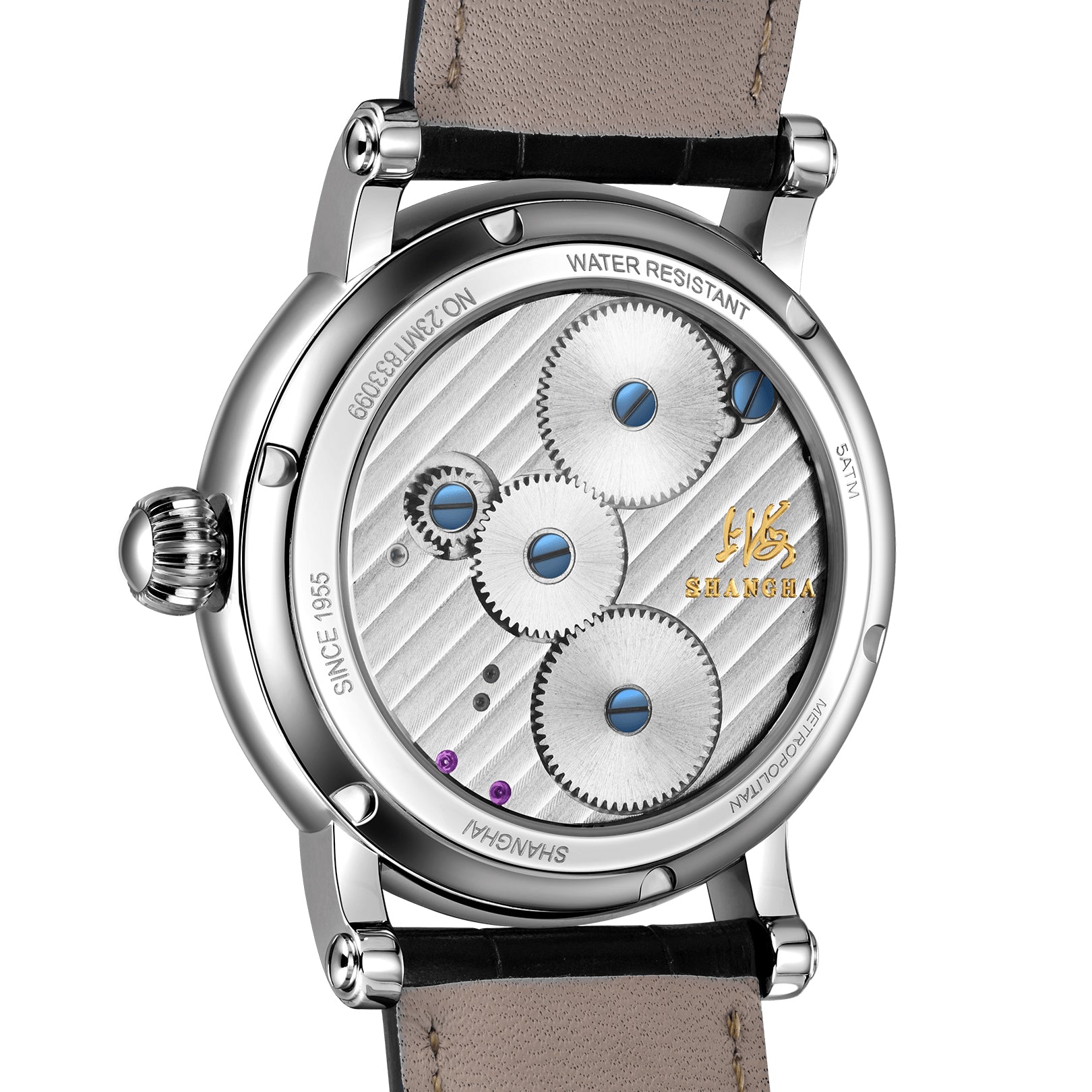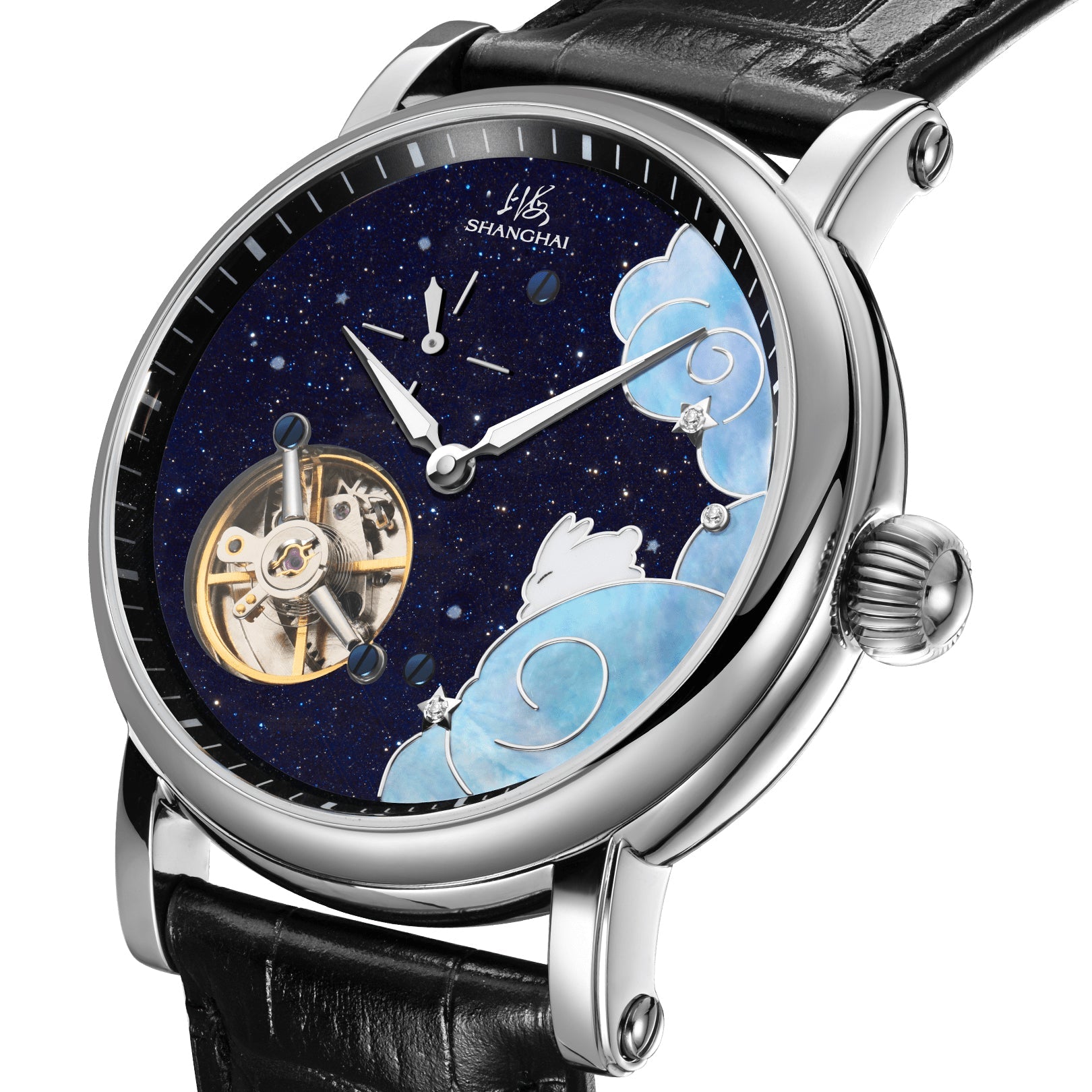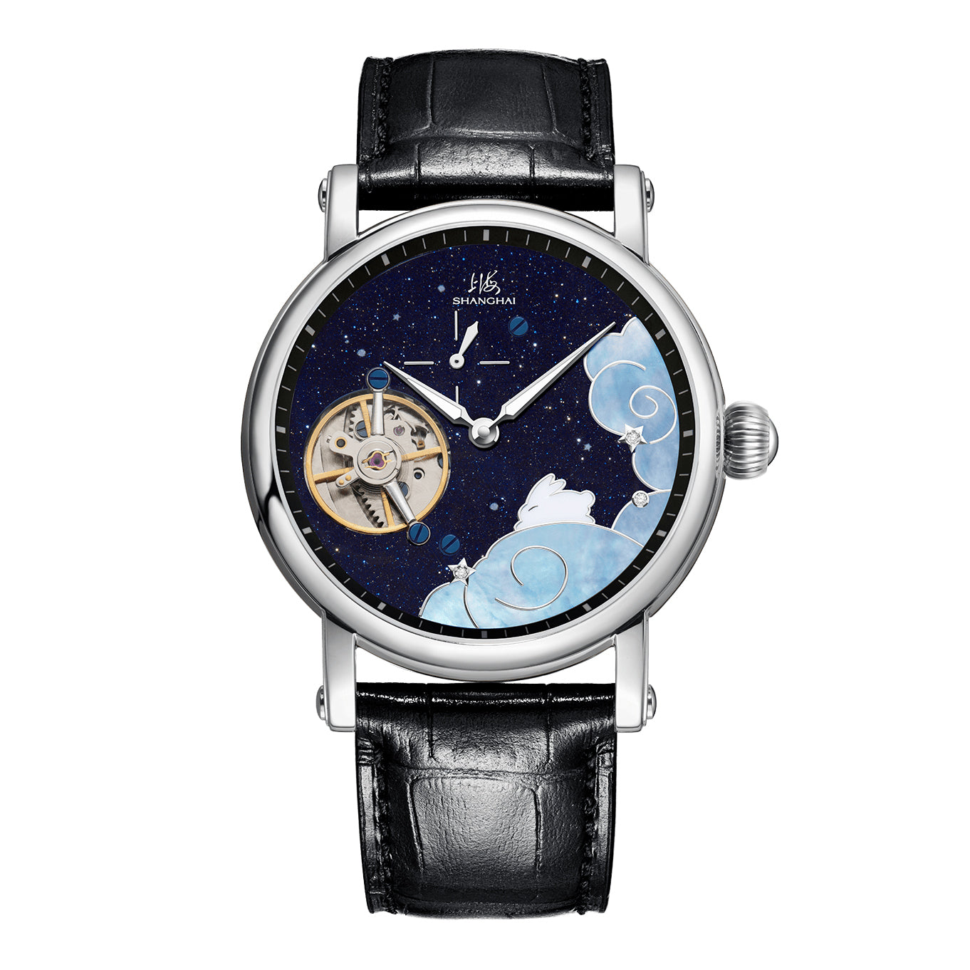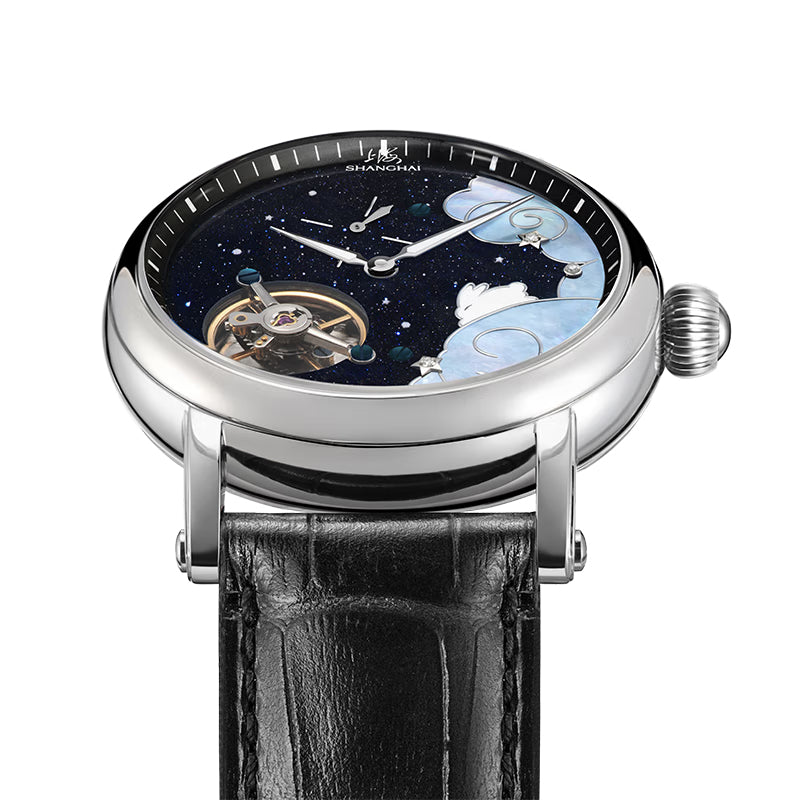 Mechanical, manual-winding. Carrousel. China Made. Caliber: Shanghai K01. Functions: Hour, minute, second (Central hour and minute hands, small seconds hand. The dial rotates clockwise simultaneously with the minute hand, which takes one hour each round.). Jewels: 21. Frequency: 21600 vph. Power reserve: Around 62 hours.