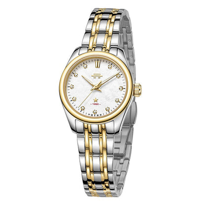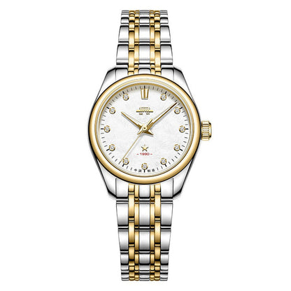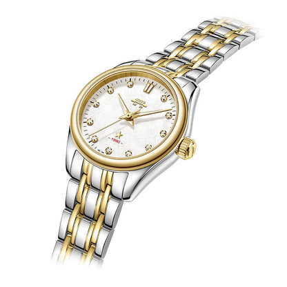 Stainless steel. Diameter: 28 mm. Thickness: 10.25 mm. Lug width: 14 mm. Water resistance: 50 meters. Luminescence: Luminescence on hour hand, minute hand and the hour marker at 12 o'clock. Bezel: Gold color. Dial: White. Frost dial. Synthetic crystal set at 1 to 11 o'clock. Applied hour marker at 12, the Beijing Watch Tiananmen logo, and a five-pointed star. Crystal: Sapphire crystal. Flat. Case back: Screw-down. Not transparent. Stainless steel case back. Hands: Dauphine hour and minute hands. Needle seconds hand. Copper hands plated in gold color. Crown: Push-pull. Fluted cylinder shape. Stainless steel crown. Signed with the Beijing watch Tiananmen logo.