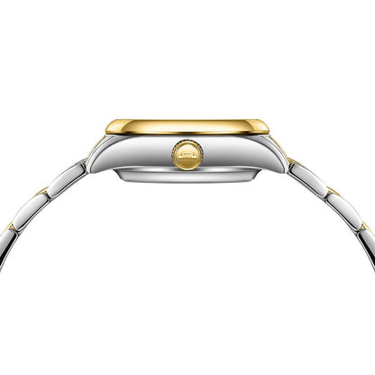 28 mm diameter; White frost dial; Gold & silver color case & bracelet