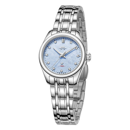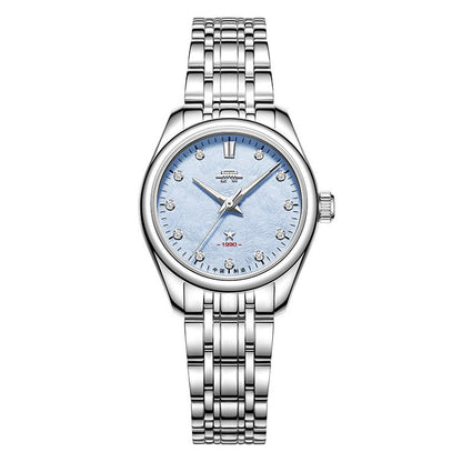 28 mm diameter; Light blue frost dial; Silver color case & bracelet