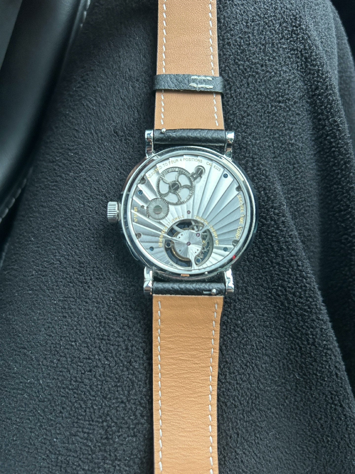 Mechanical, manual-winding. Tourbillon. China Made. Caliber: SAKURA 6325. Functions: Hour, minute. Jewels: 17. Power reserve: Around 55 hours.