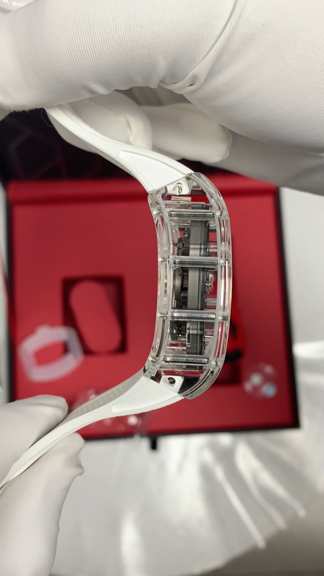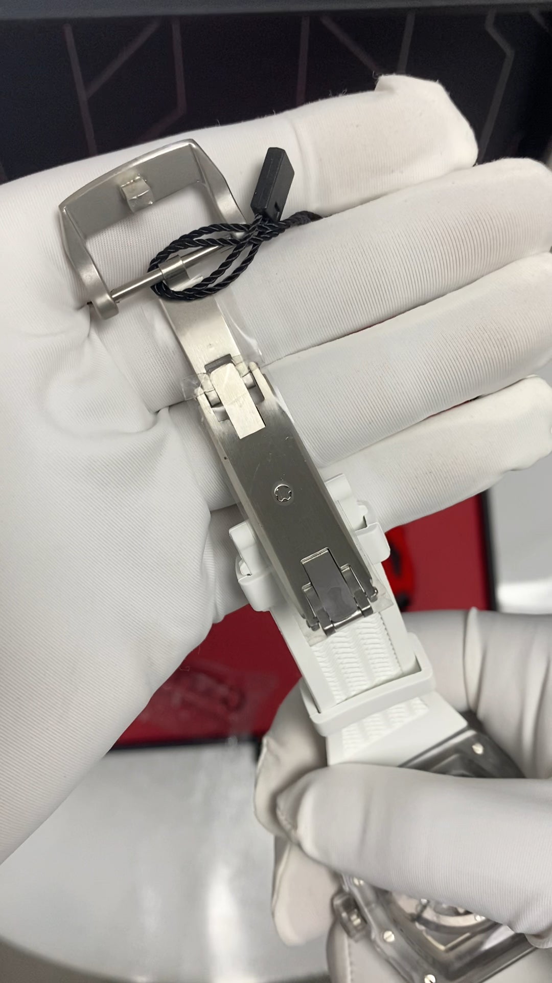 White. Fluorine rubber. No quick release: Need tool to remove strap from case. Clasp: Fold-over clasp. Stainless steel clasp. (Additional strap: Green. Fluorine rubber. No quick release: Need tool to remove strap from case.)