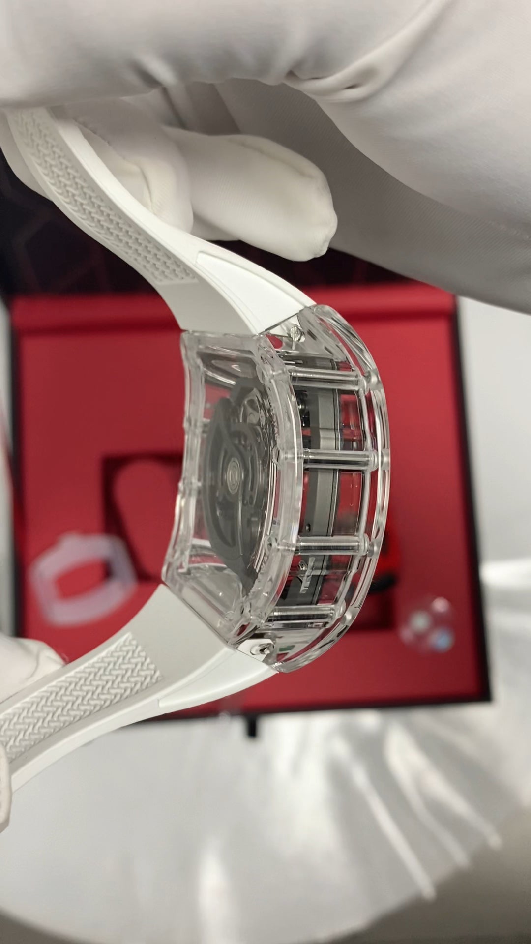 Glass. Width exclude crown: 44.8 mm. Thickness: 16 mm. Lug to lug: 42.5 mm. Water resistance: 30 meters. Weight: 94 grams (the whole watch including strap). Luminescence: Super-LumiNova luminescent material. Green luminescence on hands, and blue on hour markers. Crystal: Curved. NOT sapphire crystal. Case back: Fixed with screws. Transparent. NOT sapphire crystal. Crown: Push-pull. Gear shape. Signed with the "B" logo. Crown diameter: 9.6 mm. NOT sapphire crystal.