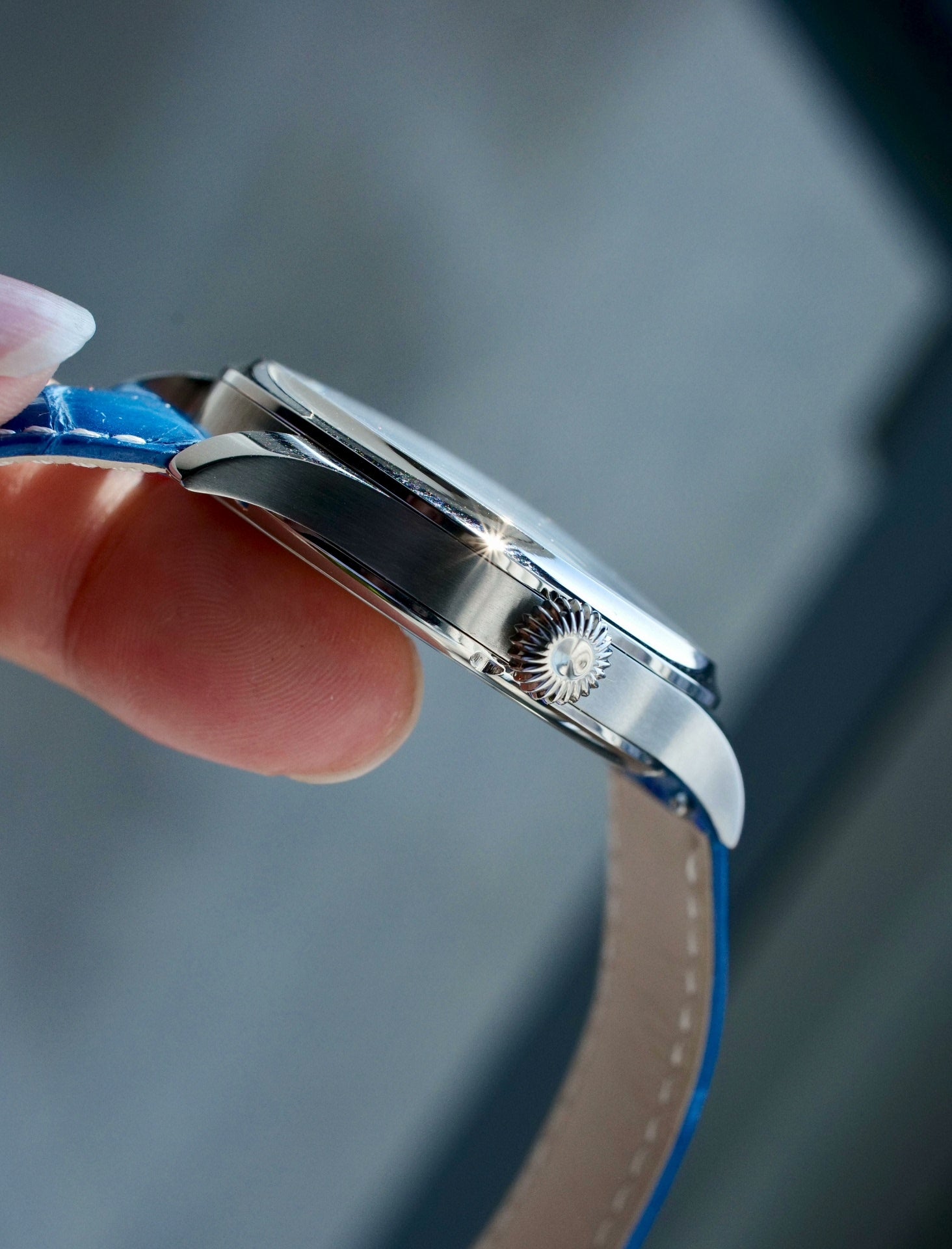 Stainless steel. Diameter: 40 mm. Luminescence: No lume. Dial: White. Mother of pearl. Case back: Screw-down notched. Transparent. Hands: Thermally purpled steel hands. Crown: Push-pull. Pumpkin shape. Stainless steel crown. Crown not signed.