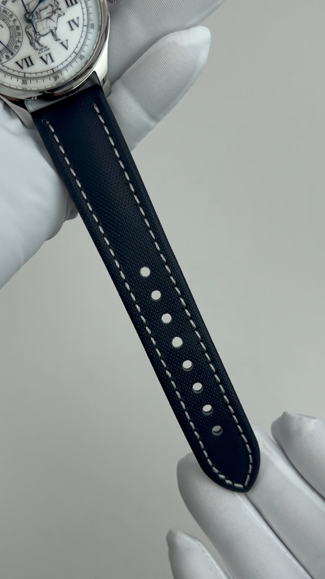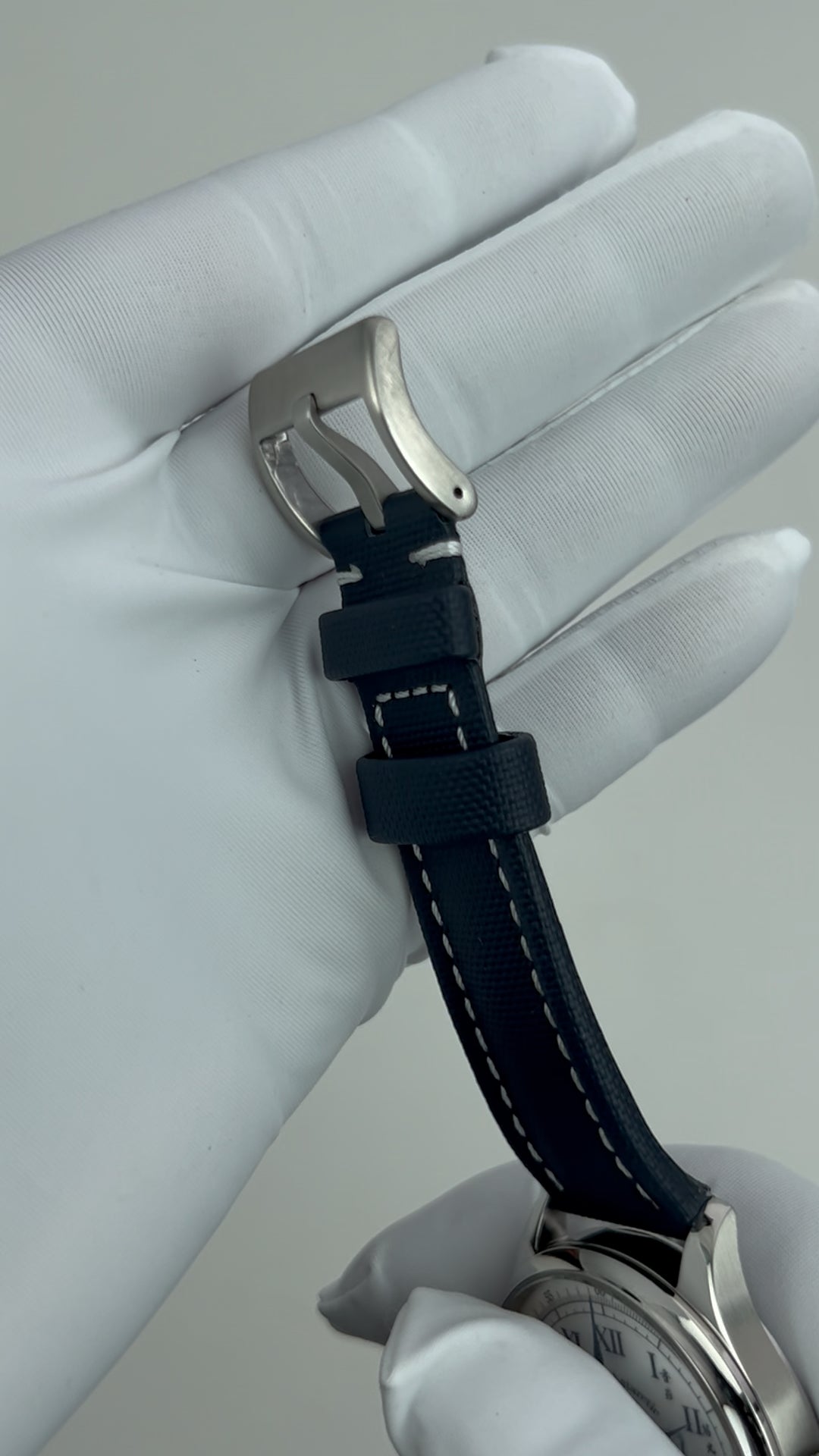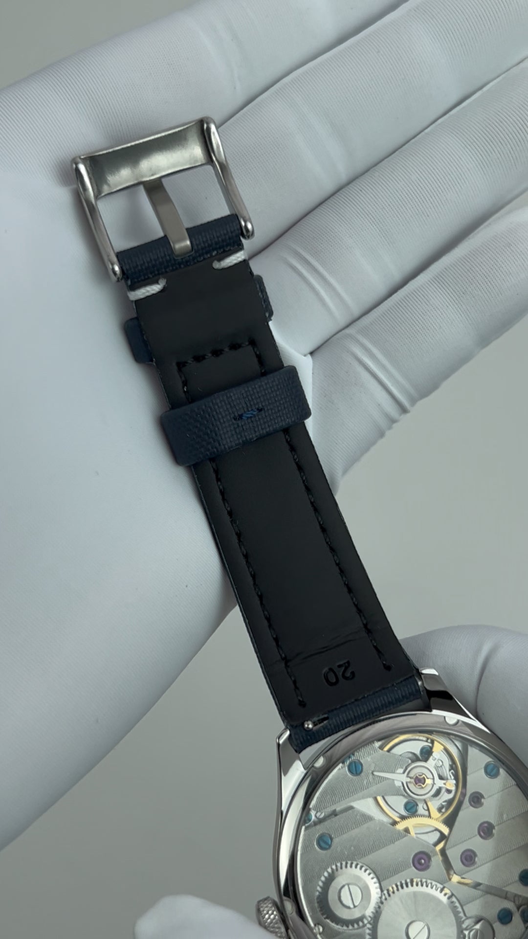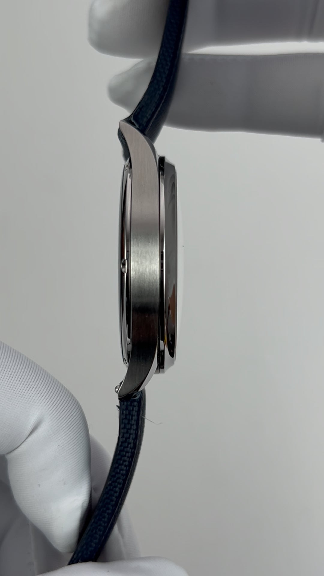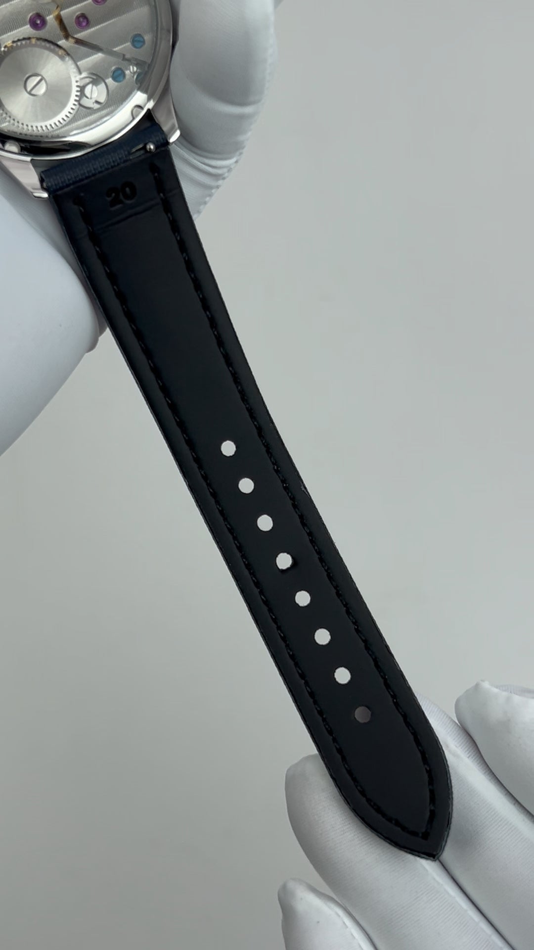 Stainless steel. Diameter: 41 mm. Thickness: 11.2 mm. Lug width: 20.2 mm. Lug to lug: 49 mm. Weight: 69 grams (the whole watch including strap). Luminescence: No lume. Dial: White. Mother of pearl. Crystal: Sapphire crystal. Double domed. Case back: Screw-down notched. Transparent. Mineral crystal case back. Hands: Thermal-bluing steel hands. Crown: Push-pull. Stainless steel crown. Crown not signed. Crown diameter: 7.7 mm.