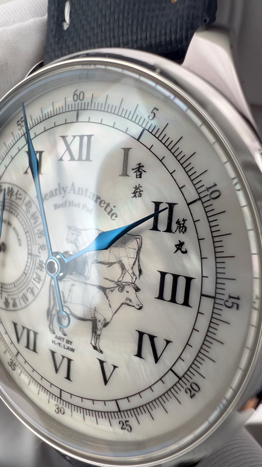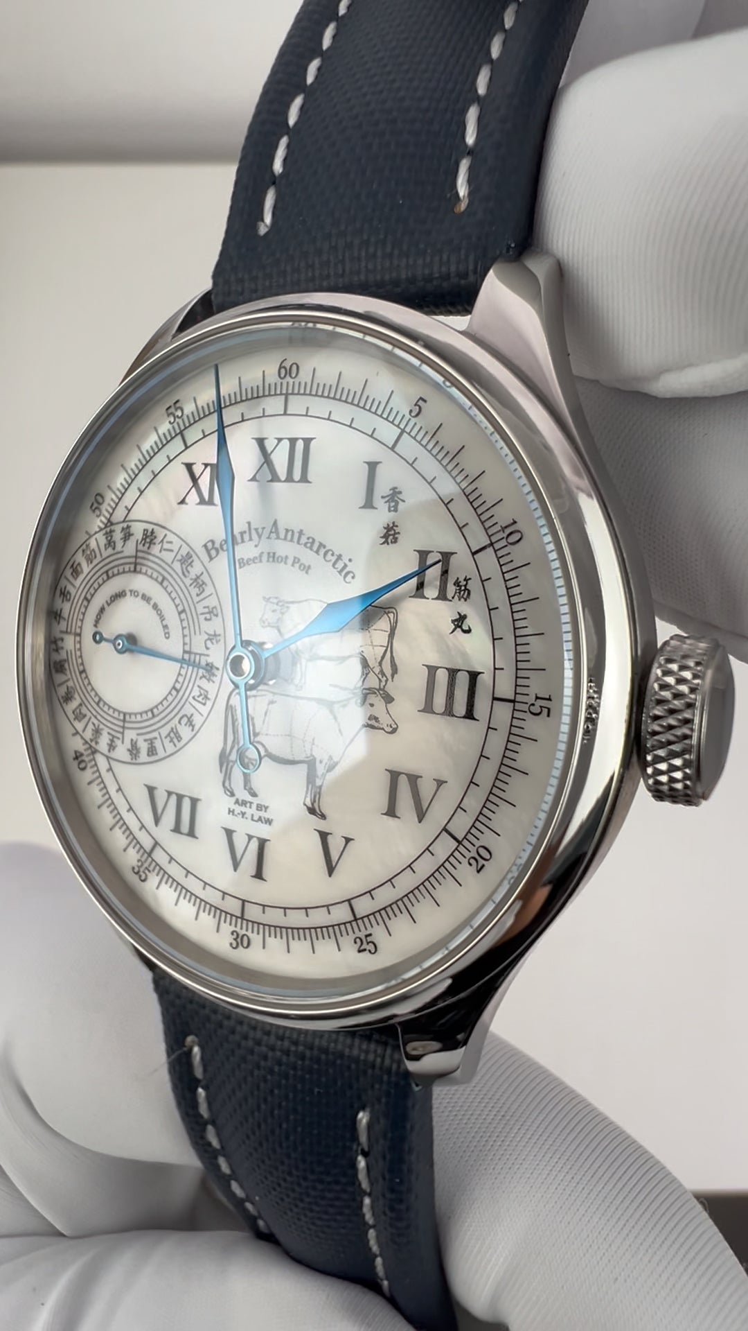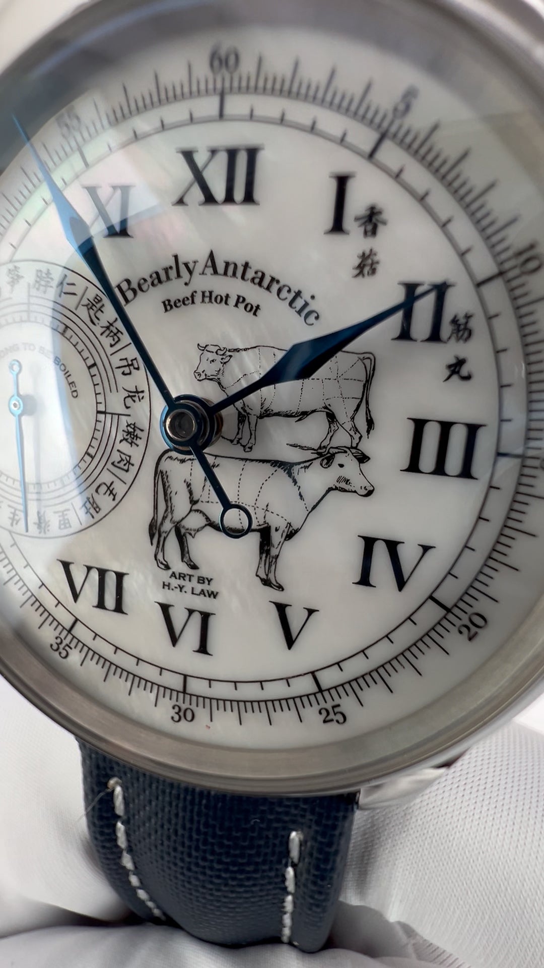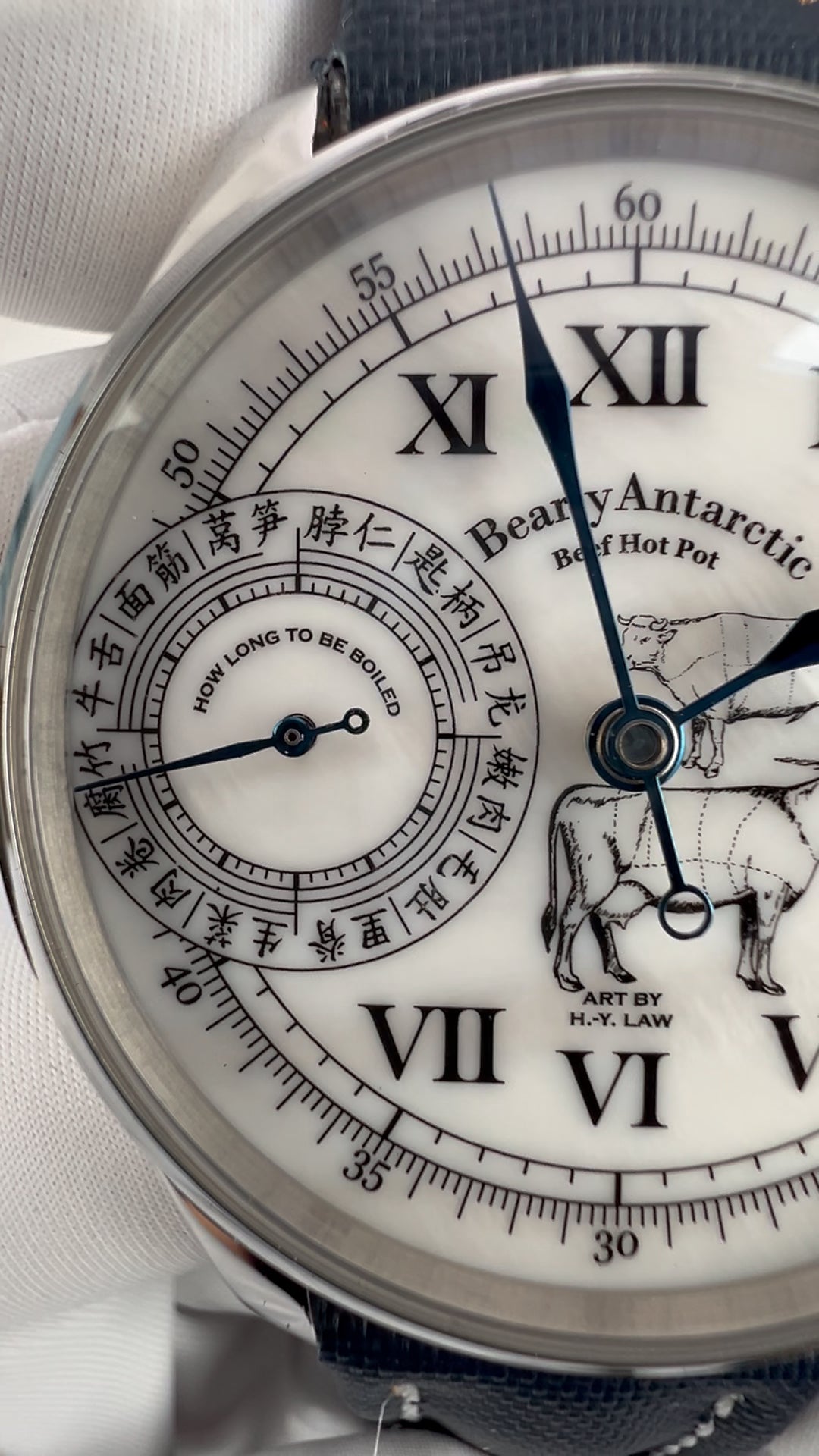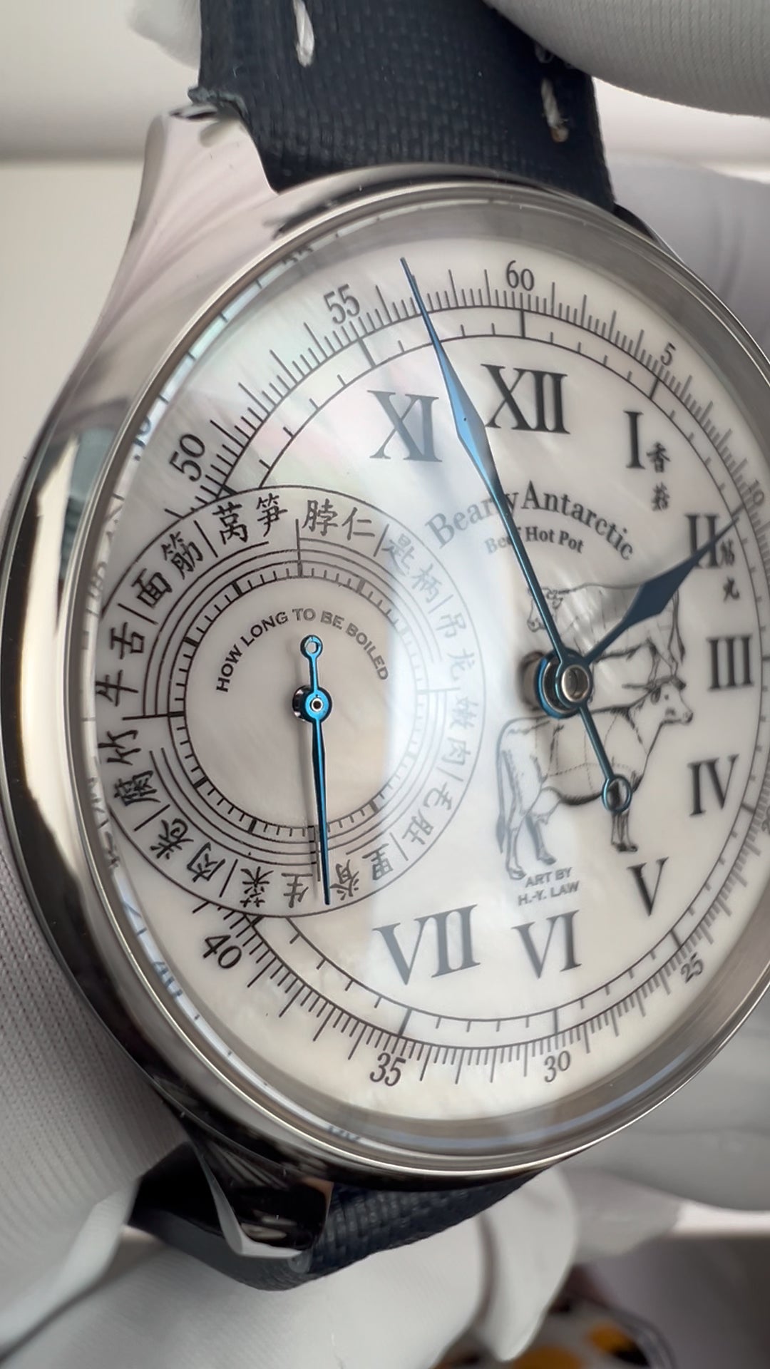 This model is an iteration of the Bearly Antarctic watch Gen. II. It tells you that in a beef hot pot, how long each ingredient needs to be boiled.