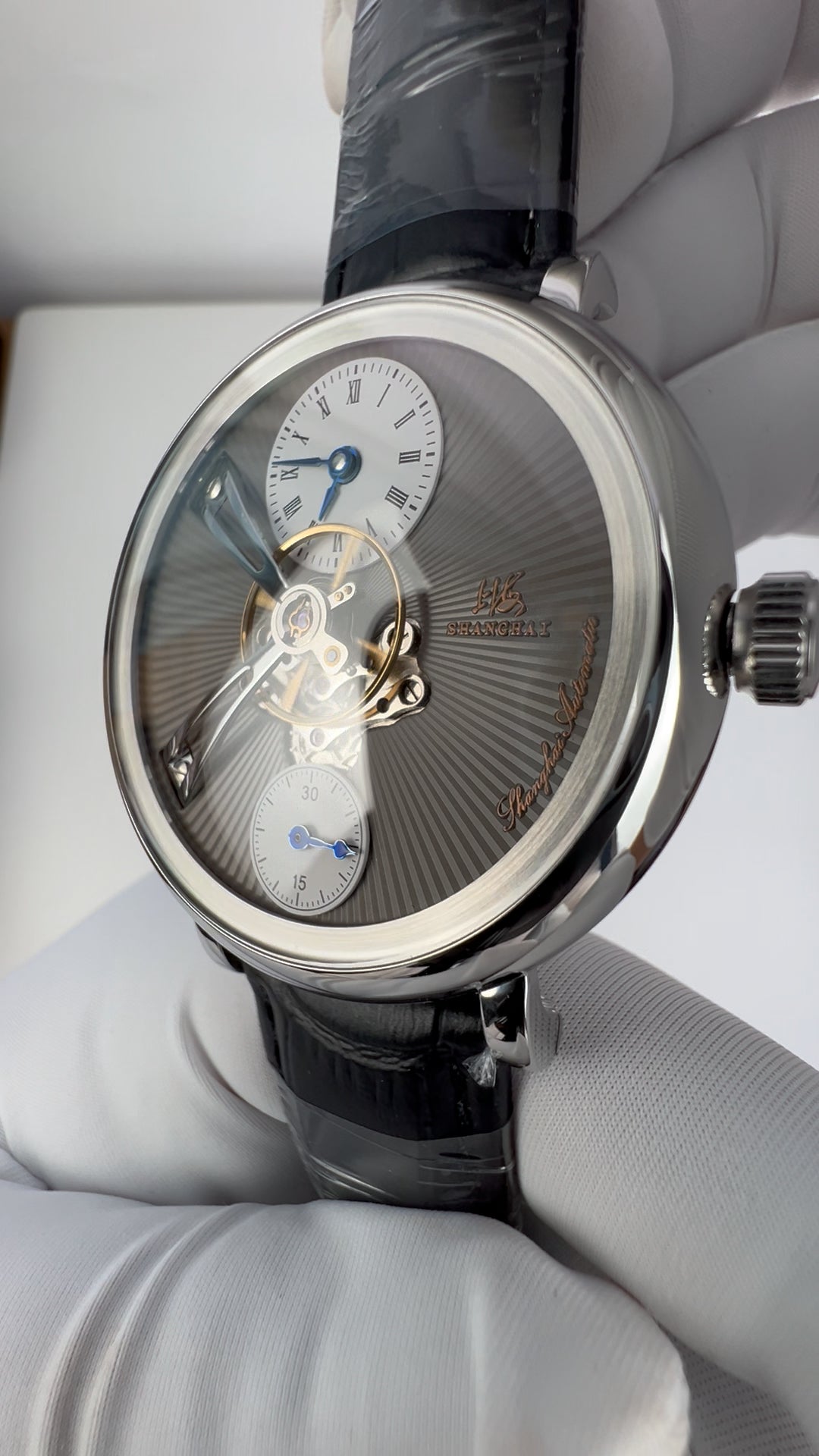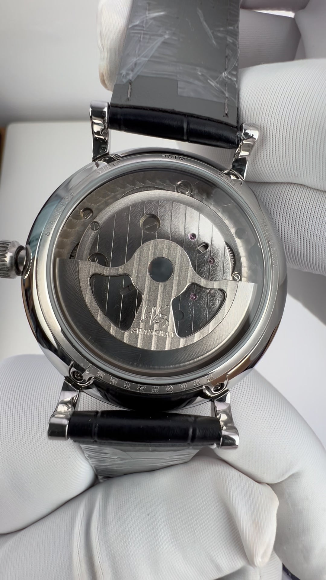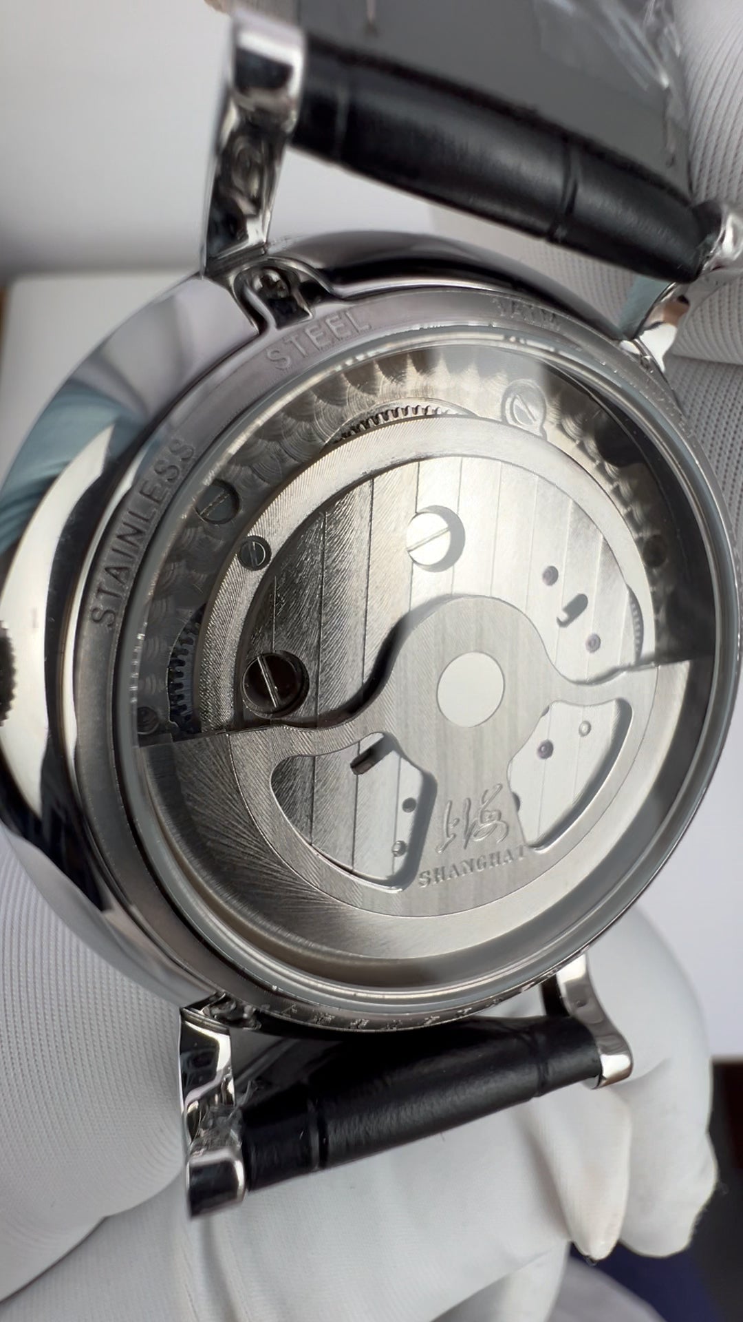 316L stainless steel. Diameter: 42.9 mm. Thickness: 14.5 mm. Lug width: 20.2 mm. Lug to lug: 48 mm. Water resistance: 30 meters. Weight: 85 grams (the whole watch including strap). Luminescence: No lume. Dial: Grey. Sunburst pattern. Crystal: Sapphire crystal. Double domed. Does NOT have anti-reflective coating. Case back: Fixed with screws. Transparent. Mineral crystal case back. Hands: Painted steel hands. Crown: Push-pull. Fluted cylinder shape. Stainless steel crown. Signed with the "上海" logo. Crown diameter: 5.8 mm.