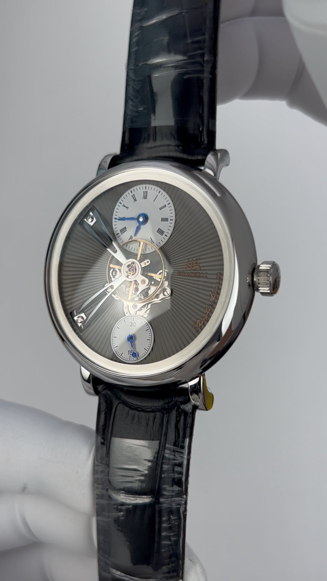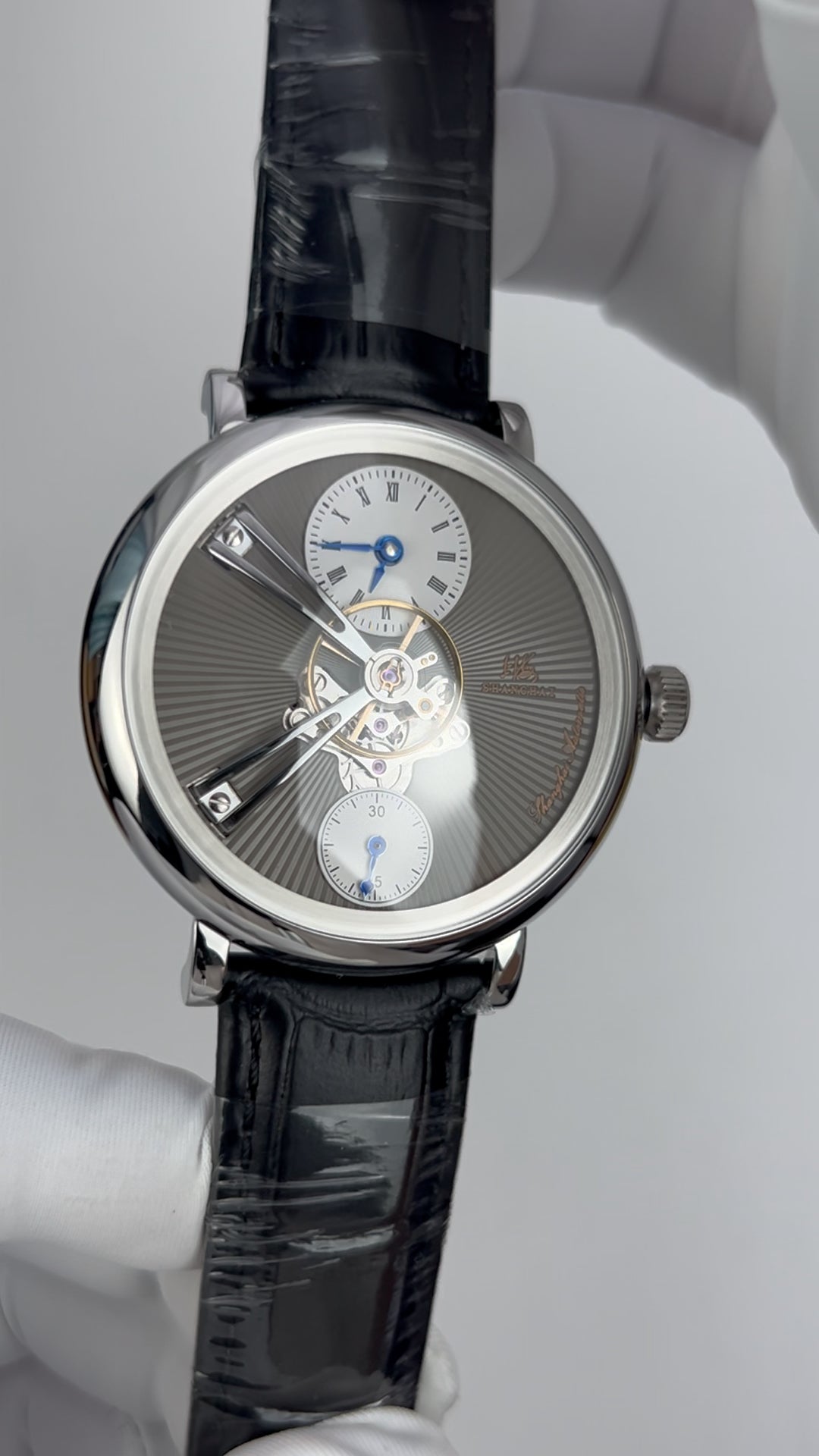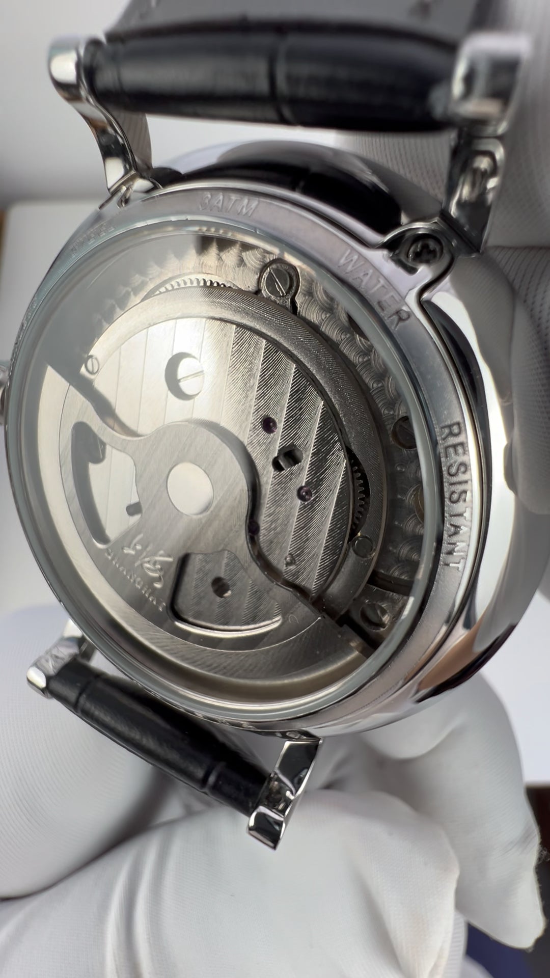 Mechanical, self-winding. China Made. Caliber: Shanghai F28. Functions: Hour, minute, second (Hour and minute subidal at 12 o'clock. 30-second small hand at 6 o'clock.). No hacking (Seconds hand does NOT stop when crown is pulled out). Jewels: 34. Frequency: 21600 vph. Power reserve: Around 40 hours.