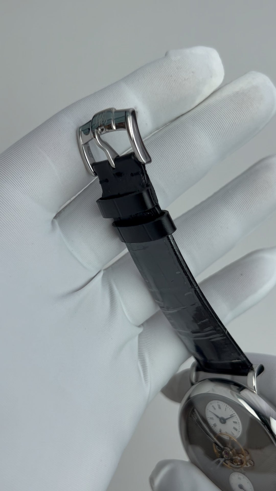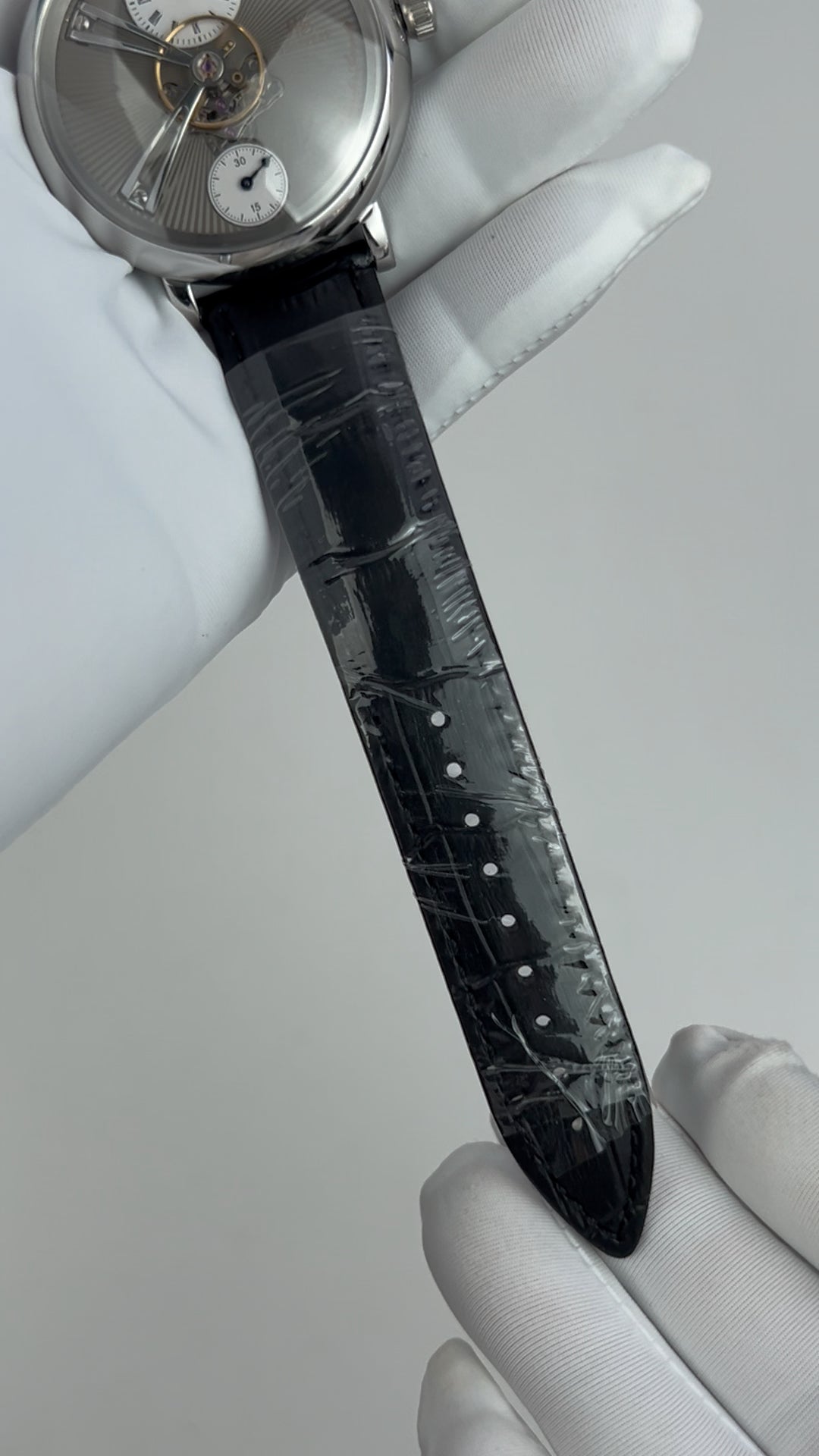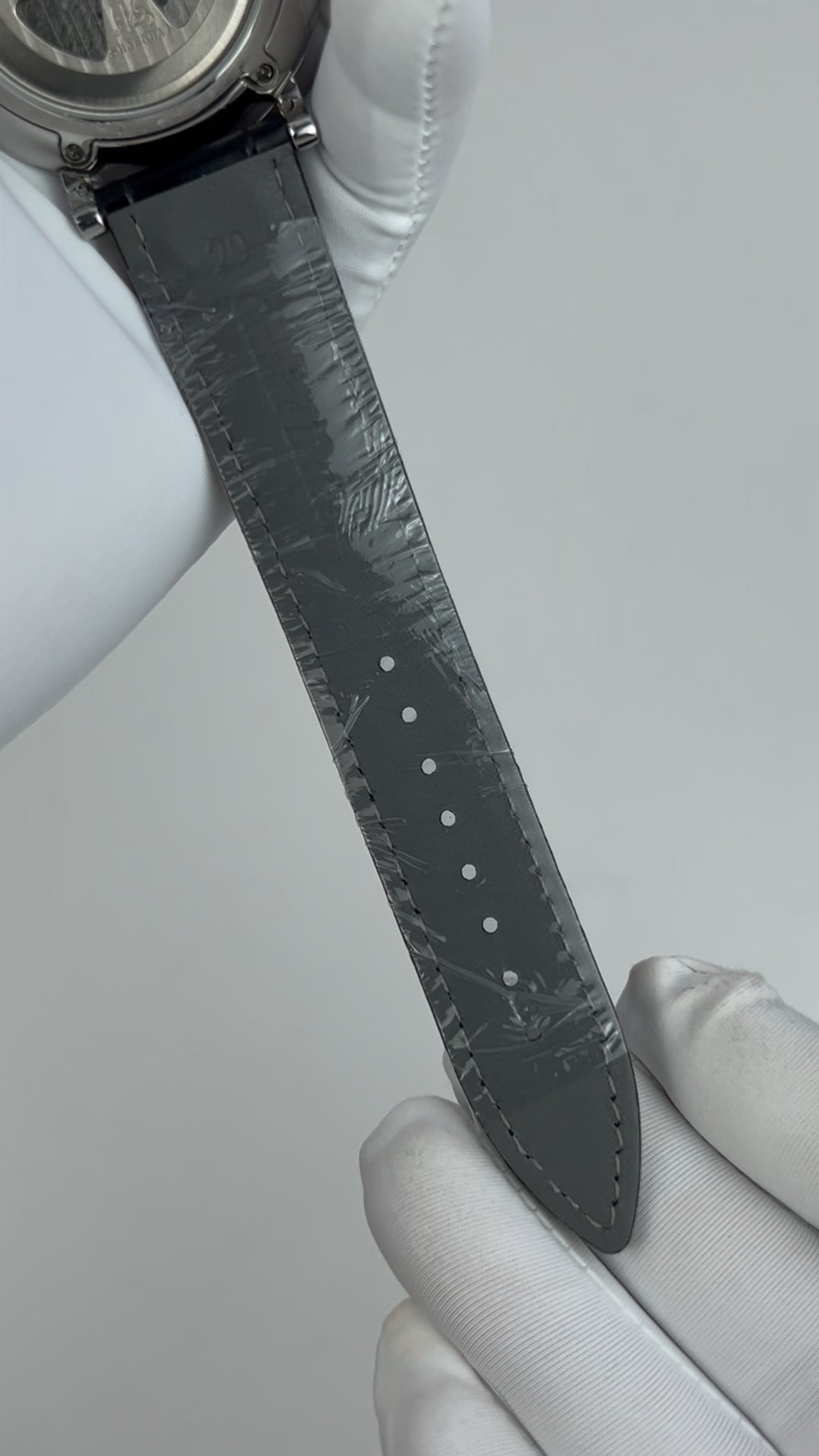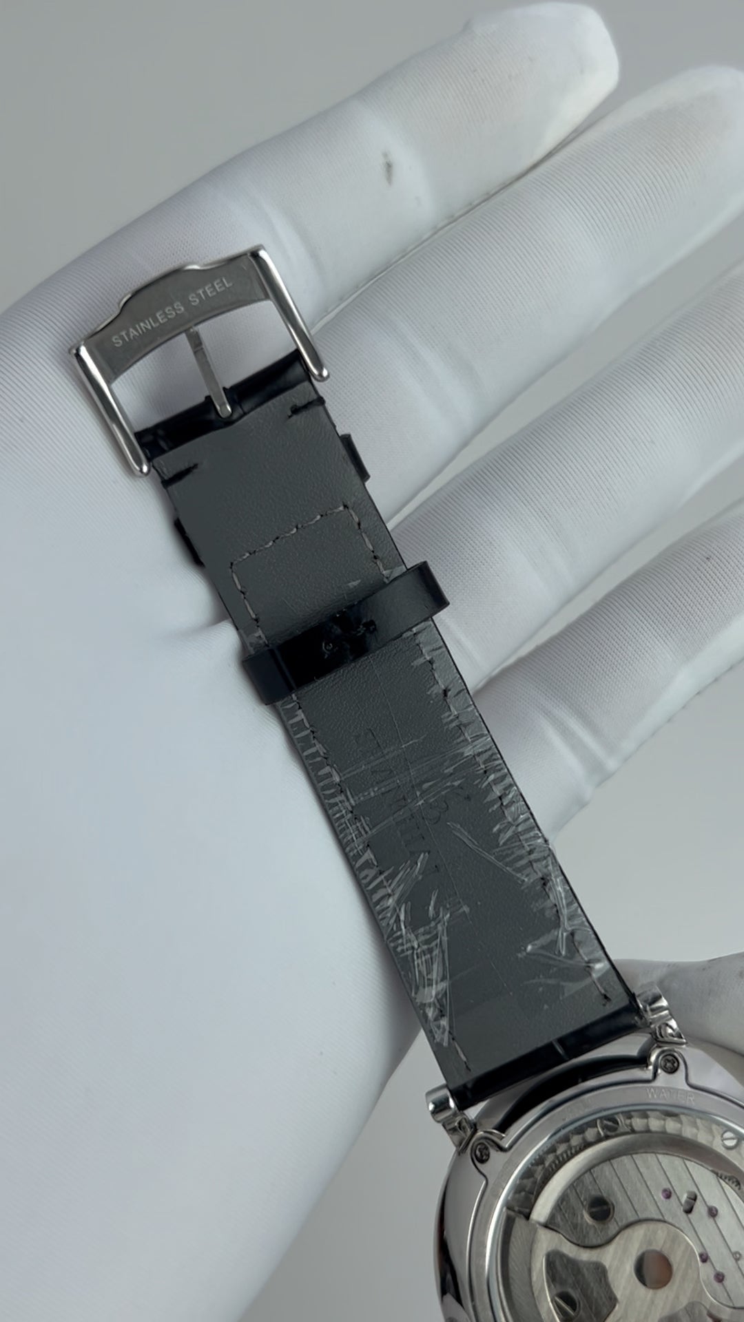 Black. Cowhide leather. No quick release: Need tool to remove strap from case. Fit for case lug width: 20 mm. Fit for clasp lug width: 18 mm. Clasp: Pin buckle. Stainless steel clasp.