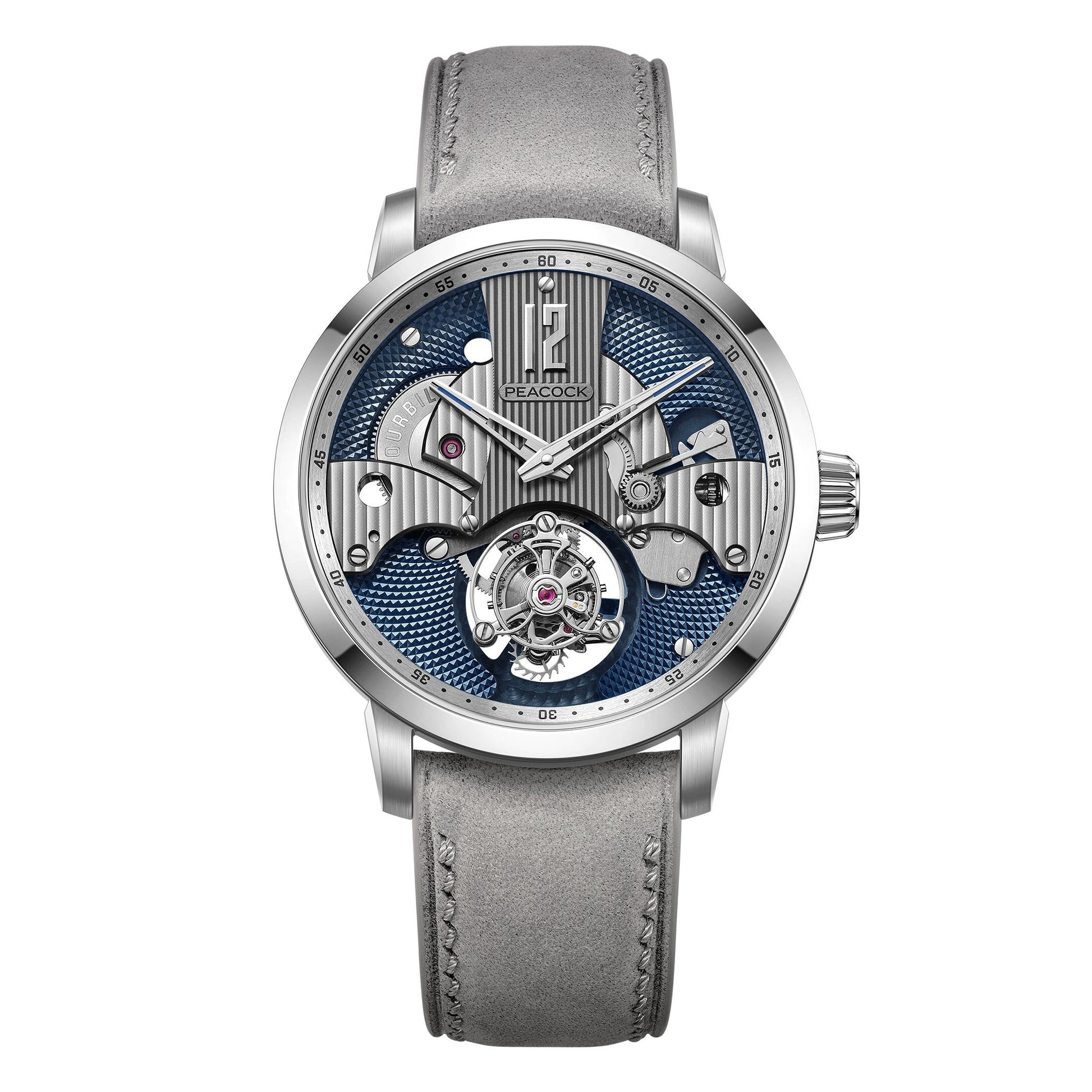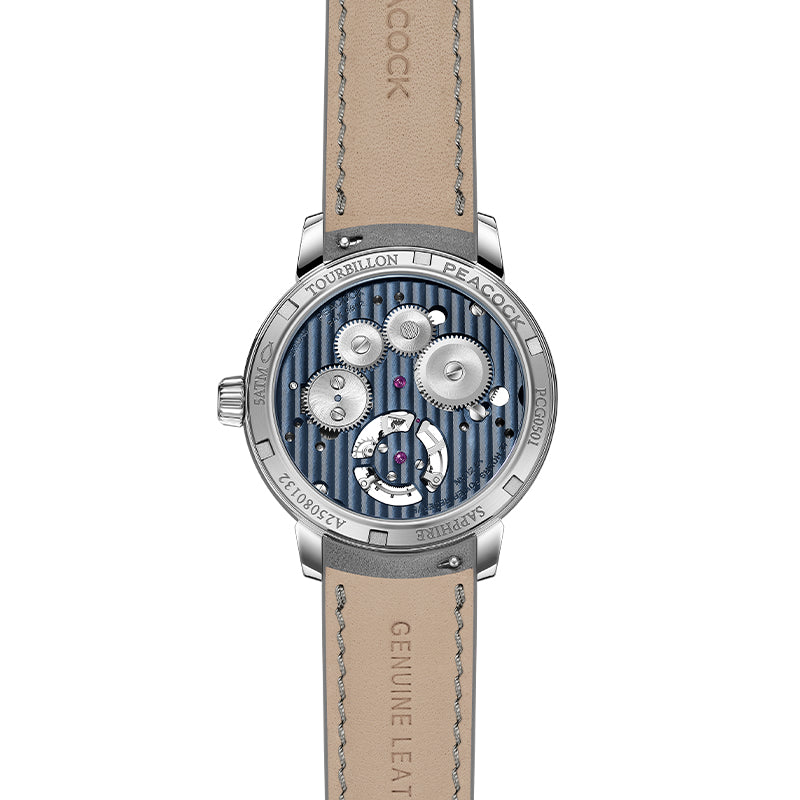 Mechanical, manual-winding. Tourbillon. China Made. Caliber: Peacock PAX9612. Functions: Hour, minute. Jewels: 19. Frequency: 21600 vph. Power reserve: Around 42 hours.