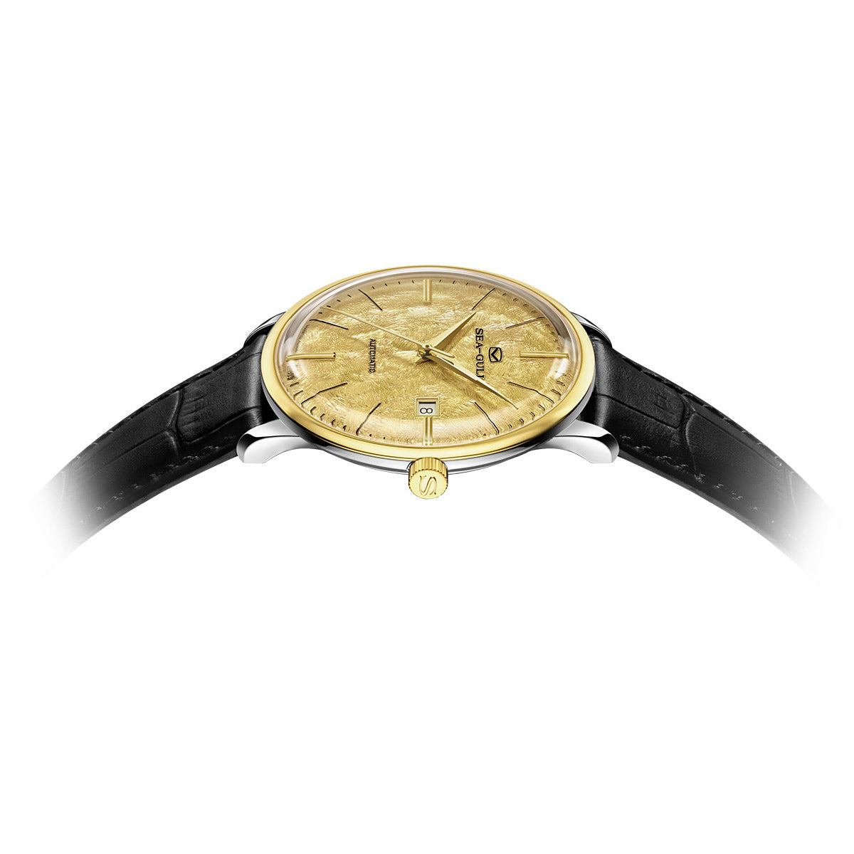 The watch dial is gilded with 24K gold, featuring the “Au999” marking at 6 o’clock. The bezel features an 18K rolled gold layer over stainless steel. The crown and clasp are plated in gold tone.