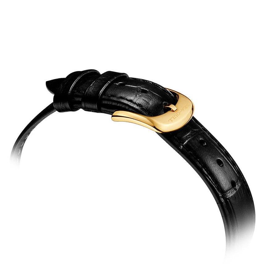 Black. Cowhide leather. No quick release: Need tool to remove strap from case. Fit for case lug width: 20 mm. Clasp: Pin buckle. Stainless steel clasp. Plated in gold tone.